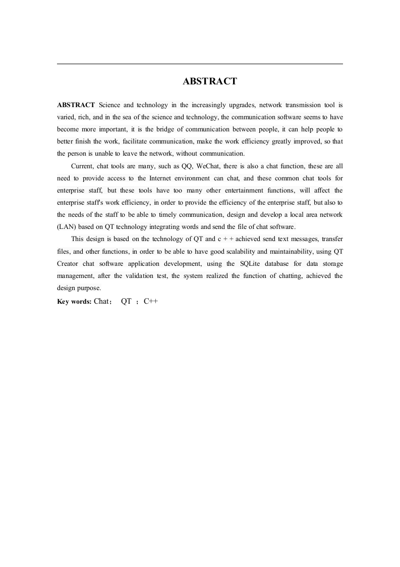 ABSTRACTABSTRACT Science and technology in the increasingly upgrades,network transmission tool isvaried,rich,and in the sea of the science and technology,the communication software seems to havebecome more important,it is the bridge of communication between people,it can help people tobetter finish the work,facilitate communication,make the work efficiency greatly improved,so thatthe person is unable to leave the network,without communication.Current,chat tools are many,such as QQ,WeChat,there is also a chat function,these are allneed to provide access to the Internet environment can chat,and these common chat tools forenterprise staff,but these tools have too many other entertainment functions,will affect theenterprise staffs work efficiency,in order to provide the efficiency of the enterprise staff,but also tothe needs of the staff to be able to timely communication,design and develop a local area network(LAN)based on QT technology integrating words and send the file of chat software.This design is based on the technology of QT and c++achieved send text messages,transferfiles,and other functions,in order to be able to have good scalability and maintainability,using QTCreator chat software application development,using the SQLite database for data storagemanagement,after the validation test,the system realized the function of chatting,achieved thedesign purpose.Key words:Chat;QT C++目录第1章绪论1.2国内外研究现状.1.3研究目标和方法21.4主要研究内容.…第2章相关技术简介.·42.1QT开发环境概述2.1.1QT特点..2.1.3QT对象通讯机制62.2编译调试工具简介第3章可行性分析.3.1经济可行性3.2技术可行性…3.3操作可行性3.4法律方面可行性分析第4章需求分析.…114.1需求分析….114.1.1功能需求分析.114.1.2性能需求分析4.2系统用例分析4.3类与对象模型.13第5章系统设计..145.1总体结构5.2系统流程设计…5.2.1事件跟踪图设计145.2.2状态图设计…155.2.3系统数据流图设计..155.3数据库设计17186.1系统主界面模块.186.2聊天室模块.…226.3发送接收文件模块27第7章系统测试.297.1软件测试的概念和原则297.2测试的过程297.3系统的运行环境.307.4系统维护….307.5系统存在的不足3031参考文献.3233