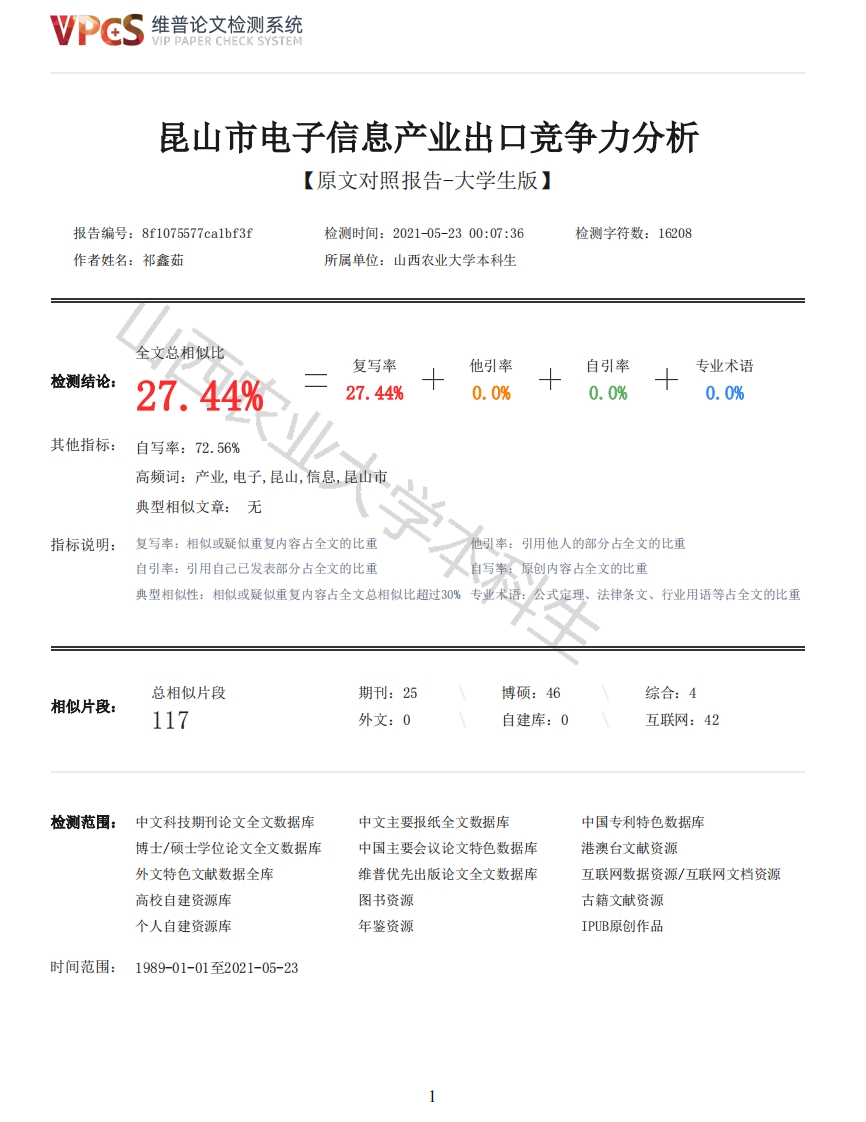 维普论文检测系统/IP PAPER CHECK SYSTEM昆山市电子信息产业出口竞争力分析【原文对照报告-大学生版】报告编号:8f1075577ca1bf3f检测时间:2021-05-2300:07:36检测字符数:16208作者姓名:祁鑫茹所属单位:山西农业大学本科生全文总相似比复写率他引率自引率专业术语检测结论:27.44%27.44%0.0%0.0%0.0%其他指标:自写率:72.56%高频词:产业,电子,昆山,信息,昆山市典型相似文章:无指标说明:复写率:相似或疑似重复内容占全文的比重他引率:引用他人的部分占全文的比重自引率:引用自己已发表部分占全文的比重自写率:原创内容占全文的比重典型相似性:相似或疑似重复内容占全文总相似比超过30%专业术语:公式定理、法律条文、行业用语等占全文的比重总相似片段期刊:25博硕:46综合:4相似片段:117外文:0自建库:0互联网:42检测范围:中文科技期刊论文全文数据库中文主要报纸全文数据库中国专利特色数据库博士/硕士学位论文全文数据库中国主要会议论文特色数据库港澳台文献资源外文特色文献数据全库维普优先出版论文全文数据库互联网数据资源/互联网文档资源高校自建资源库图书资源古籍文献资源个人自建资源库年鉴资源IPUB原创作品时间范围:1989-01-01至2021-05-23维普论文检测系统VIP PAPER CHECK SYSTEM原文对照颜色标注说明:■自写片段■复写片段(相似或疑似重复)口引用片段(引用)■专业术语(公式定理、法律条文、行业用语等)西农论文题目昆山市电子信息产业出口竞争力分析学院农业经济管理学院专业国际经济与贸易年级2017级学号20170807521姓名祁鑫茹指导教师孙建文职称副教授二零二一年六月昆山市电子信息产业出口竞争力分析摘要:电子信息产业是新兴产业,随着国家政策的支持,中国电子信息产业发展迅速。其中长三角地区在中国电子信息产业发展的先导区,而昆山市位于长三角地区,电子信息产业也是它的支柱性产业。其出口总额位于苏州市第一位,大部分依靠的就是电子信息产品的出口。昆山市电子信息产业面临着转型升级的问题。昆山市电子信息产品的出口业务形势严峻,提升产业的出口竞争力,扩大产品的竞争优势就成了急需解决的问题。本文以国际竞争力和国际贸易理论、比较优势理论和要素禀赋理论为基础,头难过竞争力指标对昆山市电子信息产业行了定量分析,并运用$OT模型对影响昆山电子信息产业国际竞争力的因素进行了定性分析。最后提出了提升昆山电子信息产品出口竞争力的对策和建议。关键词:出口竞争力:电子信息产业:SWOT分析Analysis of export competitiveness of electronic information industry in KunShan cityAbstract:Electronic information industry is a new industry.With the support of national2维普论文检测系统VIP PAPER CHECK SYSTEMpolicies,China's electronic information industry has developed rapidly.Among them,the YangtzeRiver Delta region is the leading area for the development of China's electronic informationindustry,while Kunshan City is located in the Yangtze River Delta region,and the electronicinformation industry is also its pillar industry.Its total export volume ranks first in Suzhou,andmost of it depends on the export of electronic information products.Kunshan electronic informationindustry is facing the problem of transformation and upgrading.The export business situation ofelectronic information products in Kunshan is grim,so it is urgent to improve the exportcompetitiveness of the industry and expand the competitive advantage of products.On the basis of international competitiveness and international trade theory,comparativeadvantage theory and factor endowment theory,this paper makes a quantitative analysis of Kunshanelectronic information industry with the index of hard competitiveness,and makes a qualitativeanalysis of the factors affecting the international competitiveness of Kunshan electronicinformation industry by using SWOT model.Finally,the paper puts forward some countermeasures andsuggestions to enhance the export competitiveness of Kunshan electronic information productsKey words:Export competitiveness;目录1导论51.1研究背景和意义51.1.1研究背景51.1.2研究意义51.2相关文献综述61.2.1国外研究综述61.2.2国内文献综述61.3研究内容与方法61.3.1研究内容61.3.2研究方法6农业大学本科生Electronic information industry;SWOT analysis1.4论文的创新点及不足之处71.4.1创新点71.4.2不足之处72相关概念界定与研究的理论基础72.1核心概念72.1.1电子信息产业的定义与特点72.1.2产业竞争力82.2研究的理论依据82.2.1比较优势理论82.2.2要素禀赋理论83昆山市电子信息产业电子信息产业出口现状分析93.1昆山市电子信息产业发展现状93.1.1发展规模93.1.2产业链布局情况103.1.3产业集群103.1.4经营模式113.2昆山市电子信息产业出口状况113.2.1出口规模113.2.2出口产品结构133.2.3贸易方式133.2.4出口市场分布133