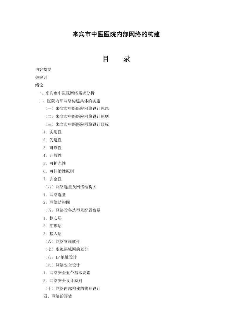来宾市中医医院内部网络的构建目录内容摘要关键词绪论一、来宾市中医院网络需求分析二、医院内部网络构建具体的实施(一)来宾市中医医院网络设计思想(二)来宾市中医医院网络设计原则(三)来宾市中医医院网络设计目标1.实用性2.先进性3.可靠性4.开放性5.可扩充性6.可伸缩性原则7.安全性(四)网络选型及网络结构图1.网络选型2.网络结构图(五)网络设备选型及配置数量1.核心层2.汇聚层3.接入层(六)网络管理软件(七)虚拟局域网的划分(八)IP地址设计(九)网络安全设计1.网络安全五个基本要素2.网络安全设计原则(十)网络内部构建的物理设计四、网络的评估结束语致谢参考文献内容摘要…(一般为200个汉字左右,小四楷体,行距20磅)。关键词:网络需求分析网络现状网络安全网络设计绪论:随着21世纪的到来,信息时代真正成为了这个时代的主题,信息技术对社会进步和国民经济发展将起到越来越大的作用。作为信息时代核心的网络也逐渐进入各行各业,其重要作用也日益显现出来。同时,随着医疗技术的发展,医疗卫生机构如何通过信息化建设完善内部的管理,降低管理成本,提高对市场的反应速度,为广大人们群众提供优质、卫生、满意的服务,是一个很重要的课题,也是一件利国利民的大事。随着计算机网络技术的不断发展,简单的内部网络已经不能适用现代的网络技术发展的要求。医院若要做到面向社会、面向世界,和国际是先进的医疗技术相接轨,就必须推进医疗系统的信息化建设,才能提高医院的医疗系统的信息化应用和管理水平。来宾市中医医院就是这样一家急需通过加快信息化建设来提高信息化应用和管理水平的医院。来宾市中医医院,位于来宾市市中心,交通便利,是一所综合性的“二级甲等医院”医院建院1958年,现有在编人员235人,聘用卫生技术人员37人,开放病床140张,设有急诊、骨伤、五官、口腔、针灸推拿、妇产科以及高血压病专科等20多个临床科室。拥有国内外先进的医疗器械,坚持走以中医专科建设为龙头,中西并重的发展道路。但因为是公办医院,前几年当地政府对信息化建设滞后,导致企事单位的信息化建设和应用发展缓慢,电脑基本上都没有连网。本篇论文根据来宾市中医医院的实际情况,对于其内部网络的设计和构建提出了系统而合理化的实施细则,对来宾市中医医院的内部网络设计和构建有着非常深远的指导意义。一、来宾市中医院网络需求分析需求分析是进行网络设计的第一步,是指对要构建的医院内部网络进行详细的分析,弄清楚各科室对构建内部网络的要求。需求分析是对整体需求的分析是,医院的管理人员、办公人员和后勤人员等所有人员需求的综合。医院的管理人员表明医院的内部网络须具备较强的稳定性、一定的可扩展性、较高的安全性以及拥有强大的信息传递能力,以保证医院信息畅通四个要求,还要在满足基本功能的同时,尽量节约资金。办公用户最为主要的应用是信息(文件、通知)传递和访问内部网站进行网络办公,这部分应用约占到总应用的80%,有一部分应用是使用Internet进行HTTP访问,约占总应用的10%,另约有l0%的应用是针对电子邮件系统。其它科室的用户主要是HTTP、FTP和电子邮件的三方面应用。二、医院内部网络构建具体的实施(一)来宾市中医医院网络设计思想随着社会的发展,企业信息化建设的推进,全国各大中型企业基本上都有了自己的网络,作为医院的决策者们来说,建立高速的网络,使信息流通更快速,将医院建成信息化的高效的医院,使医院立于不败之林。由于医院设有医生办公室、后勤处、财务科、人事科等部门,为了使这些部门能够保持信息互通,医院准备建立医院WEB,以通过WEB使各部门进行信息交流。所以医院提出“应用是核心,网络是基础,网络资源是根本,而利用网络的人是关键”的网络设计思想。(二)来宾市中医医院网络设计原则由于来宾市中医医院的网络业务量并不大,主要应用是医院内部的信息传递,除此之外,HTTP、FTP、Email便是医院与Internet连接的最大流量了。对于网络系统的安全性、可靠性、扩展性和可维护性等,医院也只是要求中等水平,在性能和价格方面,医院在考虑到基本功能时主要偏向价格。一个系统的建设在实用的前提下,应当在投资保护及长远性方面做适当考虑,有效的利用现有的资源,并且从用户的利益出发,一个好的系统应当给用户一定的自由度,而不是束缚住他们的手脚,从技术上讲应该采用标准、开放、可扩充的、能与其它厂商产品配套使用的设计。根据用户的总体需求,结合对应用系统的考虑,我们提出网络系统的设计的原则是:可靠的技术选型、标准的体系结构、1000M骨干网、安全性较高、运行性能可靠以及遵循面向应用,注重实效,急用先上,逐步完善的原则。(三)来宾市中医医院网络设计目标1.实用性根椐应用系统的要求确定整个系统的结构,即从系统功能和信息需求出发,拟建系统的结构必须满足系统的传输能力要求、信息安全要求、人机交互能力要求、信息处理要求等。