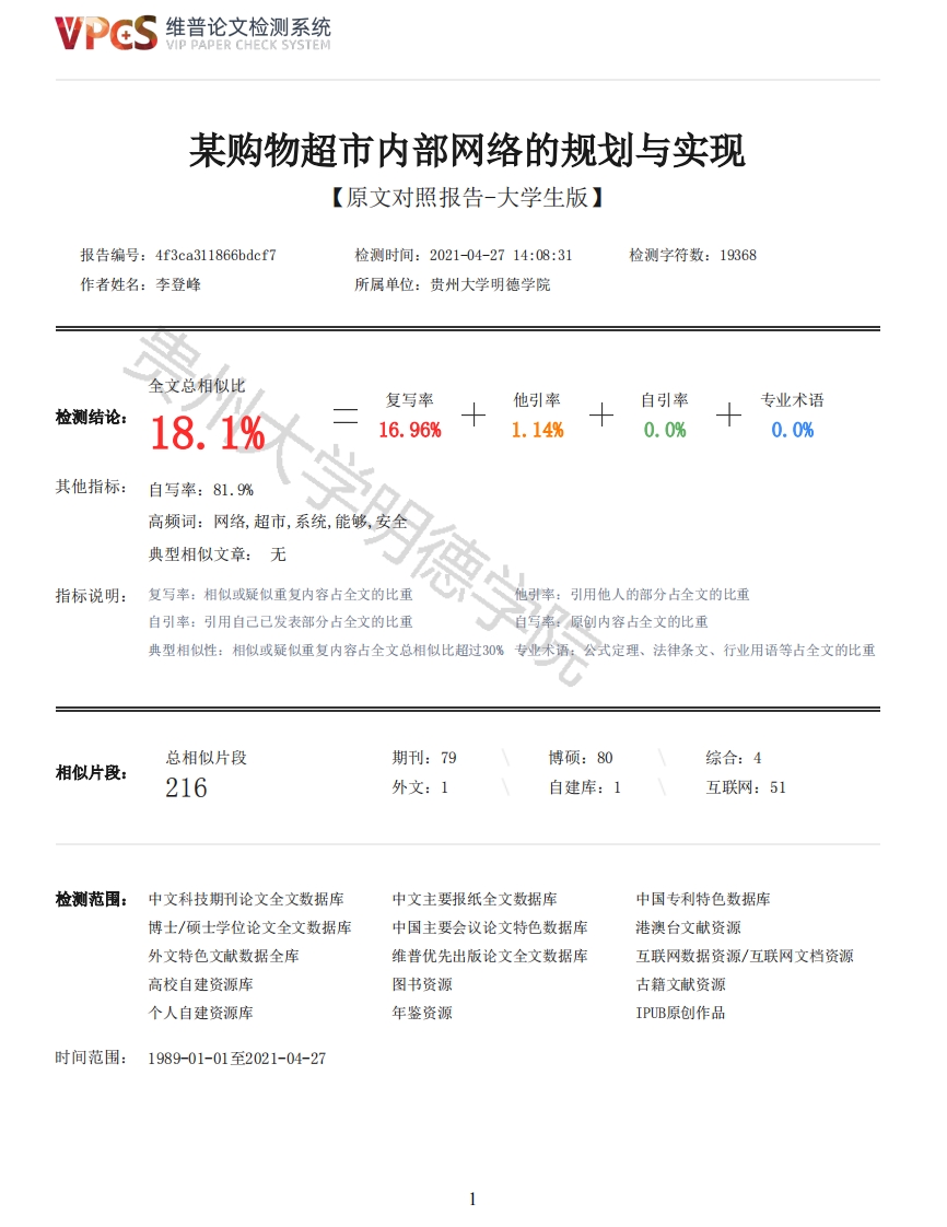 维普论文检测系统VIP PAPER CHECK SYSTEM某购物超市内部网络的规划与实现【原文对照报告-大学生版】报告编号:4f3ca311866bdcf7检测时间:2021-04-2714:08:31检测字符数:19368作者姓名:李登峰所属单位:贵州大学明德学院全文总相似比复写率他引率自引率专业术语检测结论:18.1%16.96%1.14%0.0%0.0%其他指标:自写率:81.9%高频词:网络,超市,系统,能够,安全典型相似文章:无指标说明:复写率:相似或疑似重复内容占全文的比重德引用他人的部分占全文的比重自引率:引用自己已发表部分占全文的比重自写率:原创内容占全文的比重典型相似性:相似或疑似重复内容占全文总相似比超过30%专业术语:公式定理、法律条文、行业用语等占全文的比重总相似片段期刊:79博硕:80综合:4相似片段:216外文:1自建库:1互联网:51检测范围:中文科技期刊论文全文数据库中文主要报纸全文数据库中国专利特色数据库博士/硕士学位论文全文数据库中国主要会议论文特色数据库港澳台文献资源外文特色文献数据全库维普优先出版论文全文数据库互联网数据资源/互联网文档资源高校自建资源库图书资源古籍文献资源个人自建资源库年鉴资源IPUB原创作品时间范围:1989-01-01至2021-04-27维普论文检测系统VIP PAPER CHECK SYSTEM原文对照颜色标注说明:■自写片段■复写片段(相似或疑似重复)口引用片段(引用)■专业术语(公式定理、法律条文、行业用语等)本科毕业论文(设计)论文(设计)题目:某购物超市内部网络的规划与实现院(系):信息工程系专业:网络工程学院Mingde College of Guizhou University班级:网络1701学号:1720032582学生姓名:李登峰指导教师:吴世超2021年4月18日贵州大学明德学院本科毕业论文(设计)诚信责任书本人郑重声明:本人所呈交的毕业论文(设计),是在导师的指导下独立进行研究所完成。毕业论文(设计)中凡引用他人已经发表或未发表的成果、数据、观点等,均已明确注明出处。特此声明。论文(设计)作者签名:李登峰日期:2021年4月18日目录摘要IVAbstractV第一章绪论11.1超市内部网络产生的背景11.2国内外超市网络的现状1第二章网络需求分析32.1业务的需求32.1.1超市内部组织结构32维普论文检测系统VIP PAPER CHECK SYSTEM2.1.2通信量需求32.1.3内部网络的可用性和可靠性32.1.4网络的安全性32.2用户需求32.2.1收集了解用户需求32.2.2用户服务表42.3应用需求42.4网络需求42.4.1局域网功能42.4.2数据备份52.5设备需求52.6管理需求6へ2.7安全性需求6第三章主要网络技术73.1无线AP技术73.2VLAN技术73.3VPN技术73.40SP℉技术8第四章网络拓扑图9第五章网络规划与设计105.1核心层105.2汇聚层105.3接入层105.4无线局域网设计方案115.4.1A-hoc模式11大学明德学院5.4.2 Infrastruc ture模式115.4.3 Infrastruc ture模式和Ad-hoc模式的区别115.5 IP/VLAN规划工作125.5.1划分超市内网IP地址125.5.2VLAN划分125.5.3NAT地址转换135.6实现与测试135.6.1ping测试145.7服务器设计155.7.1DNS服务器155.7.2FTP服务器155.7.3WEB服务器155.8DHCP155.9网络安全设计165.9.1网络安全层次模型165.9.2入侵检测系统175.9.3监控系统17第六章设备选择196.1 Catalyst2960系列交换机196.1.1产品的编号和配置196.2TL-ER7520G路由器206.3TP-LIK360度全景POE高清监控摄像头203