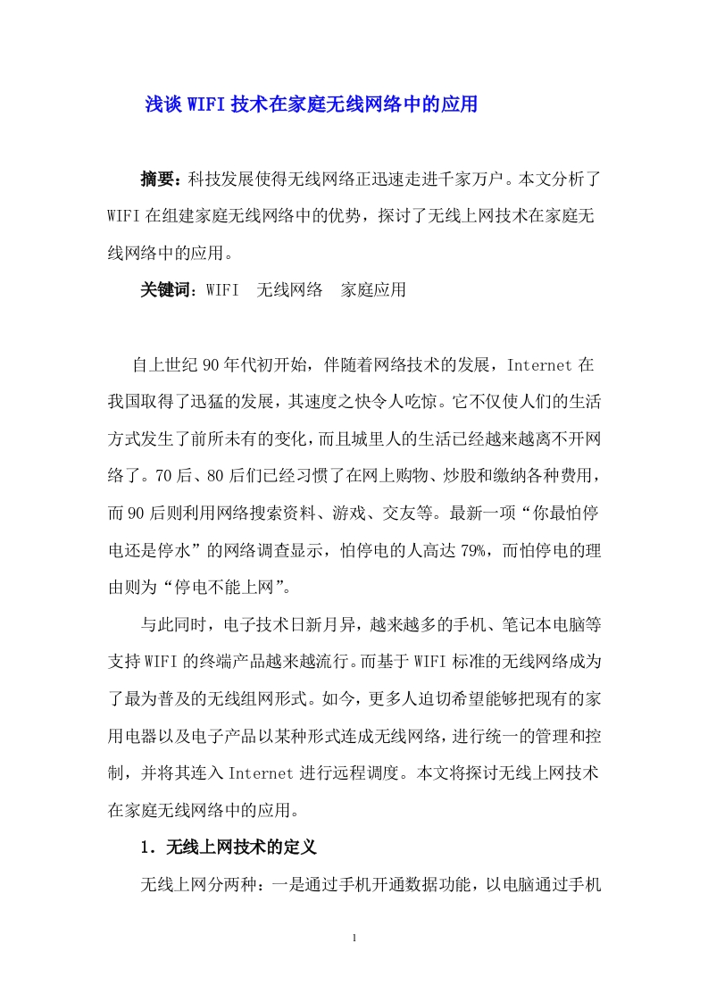 浅谈WIFI技术在家庭无线网络中的应用摘要:科技发展使得无线网络正迅速走进千家万户。本文分析了WIFI在组建家庭无线网络中的优势,探讨了无线上网技术在家庭无线网络中的应用。关键词:WIFI无线网络家庭应用自上世纪90年代初开始,伴随着网络技术的发展,Internet在我国取得了迅猛的发展,其速度之快令人吃惊。它不仅使人们的生活方式发生了前所未有的变化,而且城里人的生活己经越来越离不开网络了。70后、80后们已经习惯了在网上购物、炒股和缴纳各种费用,而90后则利用网络搜索资料、游戏、交友等。最新一项“你最怕停电还是停水”的网络调查显示,怕停电的人高达79%,而怕停电的理由则为“停电不能上网”。与此同时,电子技术日新月异,越来越多的手机、笔记本电脑等支持WIFI的终端产品越来越流行。而基于WIFI标准的无线网络成为了最为普及的无线组网形式。如今,更多人迫切希望能够把现有的家用电器以及电子产品以某种形式连成无线网络,进行统一的管理和控制,并将其连入Internet进行远程调度。本文将探讨无线上网技术在家庭无线网络中的应用。1.无线上网技术的定义无线上网分两种:一是通过手机开通数据功能,以电脑通过手机或无线上网卡来实现无线上网,速度则根据使用不同的技术、终端支持速度和信号强度共同决定。二是无线上网方式即无线网络设备,它是在传统局域网的基础上,以无线访问节点和无线网卡来构建的无线上网方式。一般而言,无线上网就是上网终端没有连接有线线路。其中,WIFI就是一种无线联网的技术,以前通过网线连接电脑,而现在则是通过无线电波来连网:常见的就是一个无线路由器,那么在这个无线路由器的电波覆盖的有效范围都可以采用WIFI连接方式进行联网,如果无线路由器连接了一条ADSL线路或者别的上网线路,则又被称为“热点”。上互联网的速度主要是取决于WIFI热点的互联网线路。2.WIFI的优势分析目前,用于实现无线组网的主要有WIFI、HomeRF以及蓝牙。它们都工作在2.4CHz频段。该频段全球开放,即不用申请就可以在世界的任何地方使用这一频段进行通信。WIFI是一种短程无线传输技术,能够在数百英尺范围内支持互联网接入的无线电信号。其传输速率最高可达54Mbps。能够广泛支持数据、图像、语音和多媒体等业务。WIFI的优势主要为:1)无线电波的覆盖范围广。半径可达100米,甚至可以覆盖整栋大楼。2)传输速度很快,最高可达54Mbps。在网络覆盖范围内,允许用户随时随地访问网络,享受诸如网上证券、视频点播、远程教育与医疗、视频会议、网游等一系列宽带信息增值服务和移动办公。3)不用布线,不受地理条件的限制,非常适合移动办公用户的需要。只要在需要的地方设置“热点”,并通过高速线路2将因特网接入。4)辐射更小,健康安全。规定的发射功率不可超过100毫瓦,实际发射功率约6070毫瓦,而手机的发射功率约200毫瓦1瓦间。5)应用普遍。支持WIFI的电子产品越来越多,如手机、P4、电脑等,基本上已成为主流标准配置。在家庭中,电视机、数字音响、照相机等都可以通过WIFI建立通信连接,实现整个家庭的数字化与无线化,让生活更便捷。3.WIFI工作方式3.1两种类型的设备。一是无线站。通常通过一台P℃机加上一块无线网卡构成。另一种称为无线接入点(Ac-cess Point,AP),它的作用是提供无线和有线网络之间的桥接。一个无线接入点通常由一个无线输出口和一个有线的网络接口(802.3接口)构成,桥接软件符合802.1d桥接协议。接入点就像是无线网络的一个无线基站,将多个无线的接入站聚合到有线的网络上。3.2两种模式:infrastructure模式和ad hoc模式。m-frastructure模式,即无线网络至少有一个和有线网络连接的无线接入点,还包括一系列无线的终端站。由于很多用户需要访问有线网络上的设备或服务,所以基本上都会采用这种模式。ad hoc模式,也称为点对点模式(pear to pear模式)或IBSS(In-dependent BasicService Set)4.无线上网技术在家庭无线网络中的应用4.1.建立家庭网关。为了实现家庭内部网络与外部Internet相连互通,二者间需要一个家庭网关,这是整个家庭无线网络系统的核