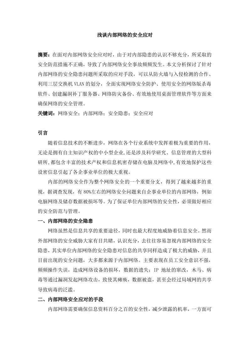 浅谈内部网络的安全应对摘要:在面对内部网络安全应对时,由于对内部隐患的认识不够充分,所采取的安全防范措施不正确,导致了内部网络安全事故频频发生。本文分析探讨了针对内部网络的安全隐患问题所采取的应对手段,可以从防火墙与入侵检测的合作、利用三层交换机VLAN的划分,全面实现网络安全防护、使用安全的网络版杀毒软件、创建漏洞补丁服务器、网络防灾备份、有效地使用桌面管理软件等方面来确保网络的安全管理。关键词:网络安全:内部网络:安全隐患:安全应对引言随着信息技术的不断进步,网络在各个行业系统中发挥着极为重要的作用,无论是拥有自主知识产权的中小型企业,还是涉及科学研究、信息管理的大型科研所,都包含丰富的技术产权和信息机密存储在电脑及网络中,有效地保护这些设密信息引起了各企事业单位的极大重视。内部的网络安全作为整个网络安全的一个重要分支,得到了越来越多的重视,据调查发现,有80%左右的网络安全问题来自企事业单位的内部网络,例如电脑网络及储存数据被损坏等。为了保证单位内部网络的安全性,必须做好相应的安全防范与管理。一、内部网络的安全隐患网络虽然是信息共享的重要途径,同时也最大程度地威肋着信息安全。然而外部网络的安全威胁大家有目共睹,认识充分,去往往容易忽视内部网络的安全隐患,其实单位内部网络的安全隐患对信息的共享同样造成了极大的威胁,并且目前出现的安全问题,大多都来源于内部网络。主要表现在员工安全意识不强,频频操作失误,造成网络设备的损坏,数据的遗失:P地址的窜改,木马、病毒等通过漏洞发起网络攻击,致使其瘫痪,数据被盗,甚至会经过局域网的共享导致病毒的泛滥。二、内部网络安全应对的手段内部网络需要确保信息资料百分之百的安全性,减少泄露的机率,一方面可以根据制定严密的制度进行防范,而另一方面可以依赖技术防范进一步加强防护。针对这个问题,可以从管理和防范两方面着手,做到“两手都要抓,两手都要硬”,这样才能保证内部网络的绝对安全。(一)防火墙与入侵检测系统的联手防火墙是位于内部和外部网络之间的安全系统,也是网络安全最基础和最主要的设施。防火墙是确保网络安全最重要的手段,是确保网络并连接外部网络最奏效的方式。防火墙就像是整个网络安全防护体系的守门员,一切出入的信息都必须经过这个唯一的关卡检查。在企事业单位的网络中,防火墙是整体安全策略的主要分支,其为网络安全起到了检验的作用。入侵检测系统是一项采取主动防御的网络技术,通常把它安置在网络的关键部位,对经过它所有的流量进行检视,发现当中的某种攻击行为或异常流量,进而发出预警通知,并主动阻拦这些网络恶意行为。网络安全是动态的整体系统工程,不能仅靠单独的几项技术进行全面的安全防范,而应该将这几项技术串联起来,互相通信,分工协作。并且,由于入侵检测系统和防火墙它们各自的局限性及特点功能决定它们相互依赖,彼此需要,不能相互代替,究其原因在于防火墙主要用于安全控制手段,而入侵检测系统则偏重于主动发现入侵信号并作出阻拦的行为,所以入侵检测系统可以成为防火墙的有效补充,只有双方的强强联手才能对网络进行动静结合的保护。而防火墙与日志分析管理系统联手,可以处理防火墙面对大量日志数据的储存管理和分析数据上的缺陷。当入侵检测系统意识到侵入行为之后,联合防火墙通信,使其自动添加防火墙规则,以阻拦有关的侵入行为,达到联合防范的目的。所以,防火墙和入侵检测系统之间的强强联手能更好地进行网络安全的防护。(二)利用三层交换机虚拟局域网的划分,全面实现网络安全防护基于交换机的虚拟局域网可以解决其广播域、带宽和冲突域的问题。共享式局域网上的广播必定会发生安全性的问题,由于所有的网络用户都能监控到流经行为,而用户只需要安装任一活动端口就可以访问网段上的广播包。利用虚拟局域网提交的安全机制,可以制约特定用户的网络访问,掌管广播组的情况,甚至可以锁定网络成员的硬件位址,同时也可以制约未经安全许可的网络成员及用户对网络的操控。例如,某单位由漏洞引发的Backdoor.Win32.Farf1i.af病毒只在同一虚拟局域网扩散,证实利用三层交换机虚拟局域网的划分,可以在一定程度上应对网络安全问题,阻拦病毒的扩散。(三)使用安全的网络版杀毒软件如果要保护内部网络的安全,阻挡木马、病毒等的侵袭,杀毒软件则必不可缺,单位必须选择安全的网络版杀毒软件。使用网络版的杀毒软件,可以在单位范围内达到杀毒软件的统一升级,统一清理,统一杀毒的目的,并且可以强制性的进行升级、清理和杀毒,防止用户的不正当干预,导致病毒的扩散。为了避开网络高峰段,可以选定一个低峰时间段进行网络护理,这样既可以减少对用户正常工作的干扰,又减轻了网管人员升级、清理和杀毒的工作量。(四)创建漏洞补丁服务器目前的操作系统还是以Windows系统为主,而漏洞会给Windows系统造成极大的安全危害,例如容易被黑客的任意攻击、造成信息资料的泄露等,同时,漏洞也给了木马和病毒很多趁虚而入的机会。只有将系统漏洞堵塞了,才能给网络用户创造一个稳定而又安全的工作环境。对于大型的企事业单位的网络,修补系统漏洞补
