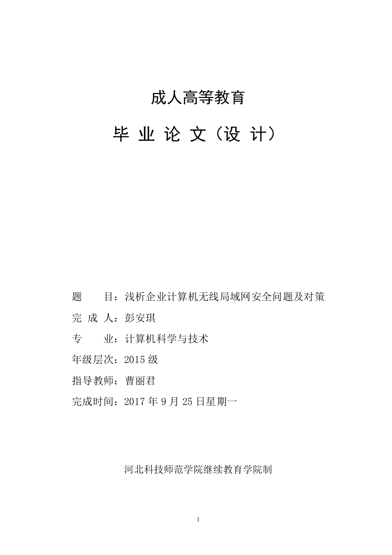 成人高等教育毕业论文(设计)题目:浅析企业计算机无线局域网安全问题及对策完成人:彭安琪专业:计算机科学与技术年级层次:2015级指导教师:曹丽君完成时间:2017年9月25日星期一河北科技师范学院继续教育学院制浅析企业计算机无线局域网安全问题及对策河北科技师范学院计算机科学与技术专业2015级彭安琪摘要:随着计算机技术和信息技术日益进步,提高了人民生活水平的发展。互联网在人们的日常生活和工作中得到了普及。随着信息科技的不断发展,企业中对于网络的使用率和使用频次也越来越高,其中,局域网是各大中小企业包括大型国有企业均频繁地使用的一种网络工具,在无线局域网之下,企业内部可以实现快速的信息传递和内部资料的传输。但是,就目前的情况来看,部分企业存在无线局域网的安全问题,导致企业信息丢失,存在潜在黑客攻击等问题,因此,这对于企业管理者而言,无线局域网的安全问题是企业管理中亟待考虑的问题之一。关键词:企业局域网:组建方法:安全措施1.局域网的概述1.1局域网的概念局域网从功能性的角度来看分为概念性和技术性,概念性的局域网是指连接了多台计算机设备,实现多台计算机设备、通信技术设备之间的数据共享、数据传输等:技术性的局域网是指,通过运用无线技术结合局域网技术,将多台计算机主机、特定的数据传输设备进行连接,形成一个满足特定需求的网络数据终端,这个终端最终受到连接主机的控制和监控。·1.2局域网的特点局域网有快速性、稳定性的特点,对于局域网连接的计算机而言,各个计算机之间可以实现数据无差别的传递,同时可以帮助企业内各个部门之间实现打印机、工作计划、工作安排等共享,还可以实现计算机内文件的公共管理和查看,如果企业内的所有部门的计算机都进行了连接,那么即可实现数十台、甚至实现数百台计算机的连接和数据共享。1.3局域网和局域网组建的目标局域网连接的计算机有一定的区域性,一股而言,局域网连接的计算机区域不超过主机半径的3-5公里,在区域内的计算机可以快速实现数据的共享和管理,但是如果超出了局域网主机连接的半径,计算机相应的速度会受到一定的影响。简单来说,局域网是为了实现计算机之间、多台计算机之间数据共享和管理而存在的,局域网连接的可以是大型的数据存储设备、数据通信设备,也可以是其他的外部设备。21.4组建局域网的原则1.4.1实用性原则组建局域网时,实用性原则是首要考虑的目标,由于局域网需要占用的服务器和网络应用较多,因此,在组建局域网时,应当对局域网进行合理的设置,充分考虑到局域网设立的目标,并结合局域网连接计划进行局域网实用性的考量。1.4.2开放性原则局域网是实现共享和传输信息而形成的,应具有良好的开放,使所述计算机整个局域网相关联。1.4.3先进性原则局域网的组建离不开先进的网路技术,在保障局域网的实用性和开放性的前提下,提高局域网组建的先进性,采用高科技的手段对其进行组建。·丛冠杰.无线局域网技术的现况及发展趋势[J刀.网络安全技术与应用.2015(01)2薄磊.无线局域网技术在医疗中的应用探究[J刀.电子制作.2013(08)22.局域网的组建方法2.1多台电脑局域网的组建方法如果计算机超过三个,那么我们就可以用它来建立一个LAN路由器。这样的方式下用户只需要打开路由器的设置,在路由器的设置中寻找到IP地址等选项,对选项进行设置和修改。通常IP地址:192.168.1.1,密码:admin。如果有更多的电脑需要进行局域网连接,可以让路由器相结合,建立一个局域网。2.2企业有线局域网的组建方法无限和有线网络,前者更安全和方便,以及灵活性。它也有更多的灵活性和可操作性简单。此方法是通过网络接入点的有线或无线连接主要实现,从而实现共享网络。首先,要在面板将启动无线网络配置控制,并从高级对话框计算机连接到计算机。其中,无线网络不需要设置P地址,就可以自动获取IP地址。如果你使用一台计算机作为网络连接的代理服务器,只需要接入网络,选择网络连接窗口,运行面向网络的安全性,和其他计算也面向网络安全运行,即设置到客户端,就能够实现网络的共享。2.3企业无线局域网的组建方法无线局域网连接首要前提是必要要有AP。AP是无线局域网的一个关键接入点,如果失去了AP这个关键性的接入点,无线局域网也将无法实现连接多台计算机的功能,因此,无线局域网在一定程度上是基于AP开展连接的。那么,这对于企业而言,可以对AP的形式进行选择,例如:也可以使用无线网卡作为无线局域网的接入点。如果企业规模不大,那么可以根据企业自身的规模、经济实力等选择适合企业的无线局域网产品。以使用无线网卡作为无线局域网的集线设备为例,企业无线局域网组建方法有较多的形式。最为简单且最为便捷的一种组建方式为,将每台需要连接无线局域网的设备上插入无线网卡,就可以实现多台计算机之间的无线局域网连接,这是一种较为便捷式的无线局域网连接方式,在这种方式下,企业的用户可以快速的通过无线网卡实现计算机之间的连接,建立起区域内的无线局域网,可以在区域内实现文件的共享、数据的传递等。3企业无线局域网中的常见问题及解决措施由于无线局域网是网络技术的一种形式,只要有网络的地方就存在着网络病毒或是电脑黑客的潜在威胁,虽