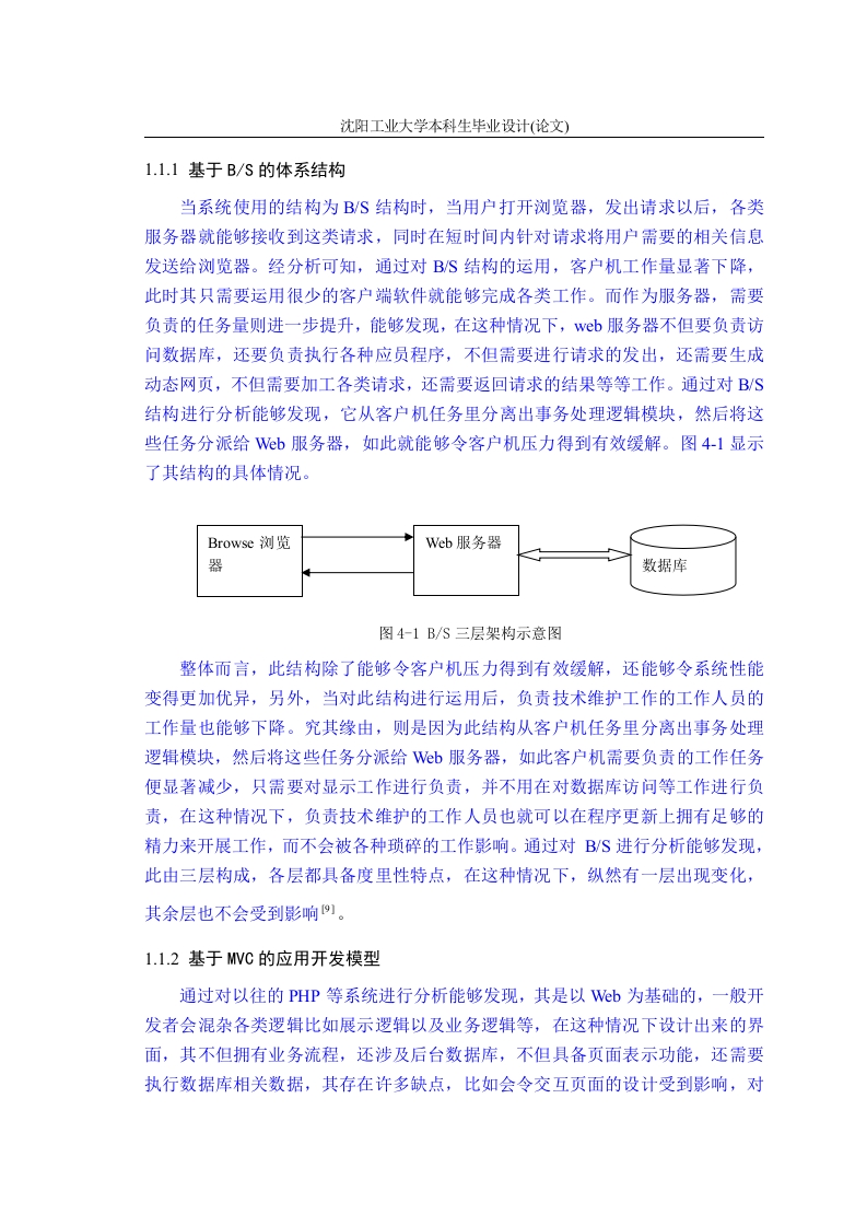 沈阳工业大学本科生毕业设计(论文)1.1.1基于B/S的体系结构当系统使用的结构为B/S结构时,当用户打开浏览器,发出请求以后,各类服务器就能够接收到这类请求,同时在短时间内针对请求将用户需要的相关信息发送给浏览器。经分析可知,通过对B/S结构的运用,客户机工作量显著下降,此时其只需要运用很少的客户端软件就能够完成各类工作。而作为服务器,需要负责的任务量则进一步提升,能够发现,在这种情况下,wb服务器不但要负责访问数据库,还要负责执行各种应员程序,不但需要进行请求的发出,还需要生成动态网页,不但需要加工各类请求,还需要返回请求的结果等等工作。通过对BS结构进行分析能够发现,它从客户机任务里分离出事务处理逻辑模块,然后将这些任务分派给Wb服务器,如此就能够令客户机压力得到有效缓解。图4-1显示了其结构的具体情况。Browse浏览Web服务器器数据库图4-1B/S三层架构示意图整体而言,此结构除了能够令客户机压力得到有效缓解,还能够令系统性能变得更加优异,另外,当对此结构进行运用后,负责技术维护工作的工作人员的工作量也能够下降。究其缘由,则是因为此结构从客户机任务里分离出事务处理逻辑模块,然后将这些任务分派给Wb服务器,如此客户机需要负责的工作任务便显著减少,只需要对显示工作进行负责,并不用在对数据库访问等工作进行负责,在这种情况下,负责技术维护的工作人员也就可以在程序更新上拥有足够的精力来开展工作,而不会被各种琐碎的工作影响。通过对B/S进行分析能够发现,此由三层构成,各层都具备度里性特点,在这种情况下,纵然有一层出现变化,其余层也不会受到影响。1.1.2基于MVC的应用开发模型通过对以往的PHP等系统进行分析能够发现,其是以Wb为基础的,一般开发者会混杂各类逻辑比如展示逻辑以及业务逻辑等,在这种情况下设计出来的界面,其不但拥有业务流程,还涉及后台数据库,不但具备页面表示功能,还需要执行数据库相关数据,其存在许多缺点,比如会令交互页面的设计受到影响,对沈阳工业大学本科生毕业设计(论文)于业务代码调式工作的开展而言十分不利等等,另外,其可扩展性功能也是缺失的,如果需要扩展现有业务,只能够从头进行编写工作,如此不但会令系统上线时间受到影响,还会加大投资成本,这对于相关企业竞争力水平的提升而言是十分不利的。此次在进行购物系统的设计之时,需要借助MVC模式来对相关应用进行构建,如此前面提到的各类问题便可以迎刃而解。同时,此处在对集成网络进行运用之时,主要借助J2EE服务器来令MVC模型得以发挥作用,图4-2、4-3显示了其逻辑、流程图的具体情况。应用服务器Web服务器Javabean浏览器Serverlet控制数据库p器业务逻辑层图4-2WC开发逻辑示意图输入请求Control服务控制输出View显示方式ModelHtml业务逻辑模型图4-3MWC业务流程示意图在开发平台之时,需要经历许多环节,系统分析便是其中之一,要想做好系统设计工作,获得更好的系统设计效果,首先需要完成系统分析工作。所谓系统沈阳工业大学本科生毕业设计(论文)分析工作,指的是在完成相关的调查工作,收集好相关数据信息以后,以新系统功能为分析对象展开深入分析,如此才能够确保系统设计工作得以顺利开展。借助此方案,能够高效完成整个业务,其主要特征以及优点是:Model(模型)层:借助javaBean实现此层,换言之,在业务逻辑层封装业务,从而获得完善的系统结构。iw(视图)层:此层主要由两部分构成,这两部分首先是HTML;其次是JSP。其能够对和客户交互的界面进行真实展现,可描绘功能极强。同时,它还能够对动态数据进行嵌套,从而达到展示动态界面的目的。另外,它还能够根据用户实际需要来定制不同的界面。Controller(控制器)层:Model、iew借助此层得以连接起来,然而需要看到的是,其除了可以作为它们之间联系的桥梁,还能够将其分离开来,一般借助Servlet进行实现这一目标,需要注意的是,虽然不论是Servlet还是JSP,它们都是用来展示页面的一种手段和工具,然而它们并不属于同一层,而是属于两层。通过对JSP进行分析能够发现,它存在的形式为脚本语言,而且能够显示这类动态数据,通过对Servlet进行分析能够发现,其主要优点就是处理流程,调用相关在构建此模型后,系统的性能就能够得到提升,其可扩展性也能够得到充分保障,其将两方面进行了分离,这两方面首先是展示页面:其次是业务组件,然后再借助Controller对其调用关系进行描述,如此除了能够令系统可扩充性得到强化以外,还能够令其效率得到提升,如此进行业务扩展就会更加方便,各种类型、各个阶段的业务需求也就能够获得充分满足。第2章系统的功能和流程分析2.1电子商务系统基本功能描述此次设计的这一电商系统属于中小型系统,它和我国流行电商模式相符,使用的架构为MVC架构,能够进行在线购物环境的提供,在此平台,用户能够使用的功能有许多,比如结账功能、购物功能等等。22系统整体布局模块的结构分析在分析系统具备的功能后,完成了功能模块图的绘制工作,图5-1显示了其具
