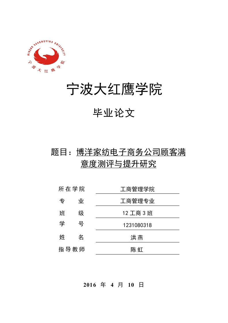 宁波大红鹰学院毕业论文题目:博洋家纺电子商务公司顾客满意度测评与提升研究所在学院工商管理学院专业工商管理专业班级12工商3班学号1231080318姓名洪燕指导教师陈虹2016年4月10日毕业论文诚信声明本人郑重声明:所呈交的毕业论文《博洋家纺电子商务公司顾客满意度测评与提升研究》是本人在指导老师的指导下,独立研究、写作的成果。除文中特别加注的地方外,论文中不包含他人已经发表的学术成果或者他人为获得高等学校学位而使用过的材料,论文中不涉及任何知识产权纠纷。否则,本人将承担一切责任。学生签名:年月日摘要电子商务的发展,一方面不仅传统的贸易方式发生了改变,也使得顾客的地位发生了根本性的变革,地位由被动转为主动地位,对于企业来说顾客粘性不高。因此,相比于传统行业,电子商务企业要想在竞争中更好的生存和发展下去,顾客满意的营销观念是一项极其重要的概念。顾客的消费心理和消费经验日渐成熟,公司需要给予实质性的能够满足顾客需求的服务或产品,不仅要实现顾客满意,而且要在不断的发展中努力提升消费者满意度才能形成稳定的客户群和较高的企业竞争力。因此,企业营销战略要以顾客为中心,满足顾客需求,提高顾客的满意度,增加顾客粘性,为企业赢得更大的优势和更好的发展前景。本文根据国内外的一些研究成果,提出一些提升博洋家纺电子商务公司顾客满意度的建议,对博洋家纺电子商务公司在提高顾客满意度上给予一定的启示。关键词:电子商务,顾客满意度,博洋家纺电子商务公司