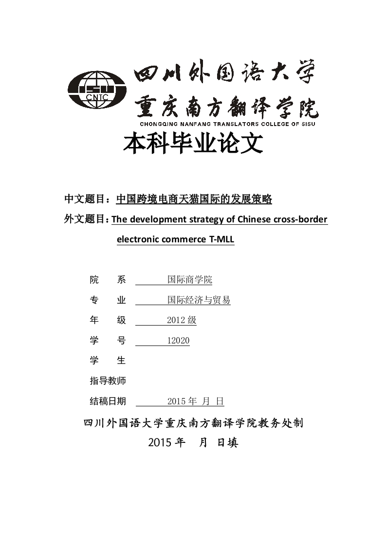 CHONGQING NANFANG TRANSLATORS COLLEGE OF SISU本科毕业论文中文题目:中国跨境电商天猫国际的发展策略外文题目:The development strategy of Chinese cross-borderelectronic commerce T-MLL院系国际商学院专业国际经济与贸易年级2012级学号12020学生指导教师结稿日期2015年月日四川外国语大学重庆南方翻译学院教务处制2015年月日填跨境电商天猫国际的发展策略摘要:近年来,跨境电商成为国际贸易新方式,国内消费者掀起“海淘热”,国家外管局3月31日公布的《2014年中国国际收支报告》显示,2014年我国居民个人网购跨境消费热情高涨,全年“海淘”支出超15亿美元。2014年2月依托跨境贸易而成立的天猫国际平台上线,先后与郑州综合保税区和杭州跨境电商产业园签订合同,不久又和宁波保税区合作,随着阿里巴巴的上市,天猫国际作为跨境电商的典型,需要更深的挖掘。本文通过分析了天猫国际面临的宏观微观环境挑出了所面临的机遇和威胁,并提出了一些对策建议,虽然面临同质平台的激烈竞争,但是整体来说机遇大于挑战,天猫国际要抓住机会大力创新创造自主品牌优化物流系统,增加市场竞争力争取在跨境电商的浪潮中占据主动的位置。关键词:天猫国际:跨境经营:环境分析:自主创新The development strategy of Chinese cross-border electroniccommerce T-MALLAbstract:In recent years ,cross-border electronic commerce has become thenew way of International trade,the "online shopping overseas"is popular withhome consumers.ON March 32st ,The State Administration of ForeignExchange publish the (2014 china international balance report),it shows thatour country's personal are enthusiastic to the cross-border of onlineshopping ,and the total number of money is over 1.5 billion in 2014.And onFebruary,2014 ,the T-mall which is a global platform is based on cross-borderbegin to operate and it conclude contact with Zhengzhou comprehensive freetrade zone and Hangzhou cross-border electronic industrial park,presently,itcooperate with Ningbo bonded area.With alibaba appear on the market T-mallinternational as a typical representative ,it needs deeper understanding.Thisarticle analyzes the macro and micro environment ,and then put theopportunities and threats and put forward some suggestions .Although it'sfacing the threats of homogeneous platform ,the opportunities outweigh thechallenges ,so T-mall should get the chance to innovate and optimize thelogistics to increase it's competitiveness,and occupy the initiative position inthe tide of cross-border electronic commerceKey words:T-mall;cross-border operation;analyzes of environment;self-dependent innovation