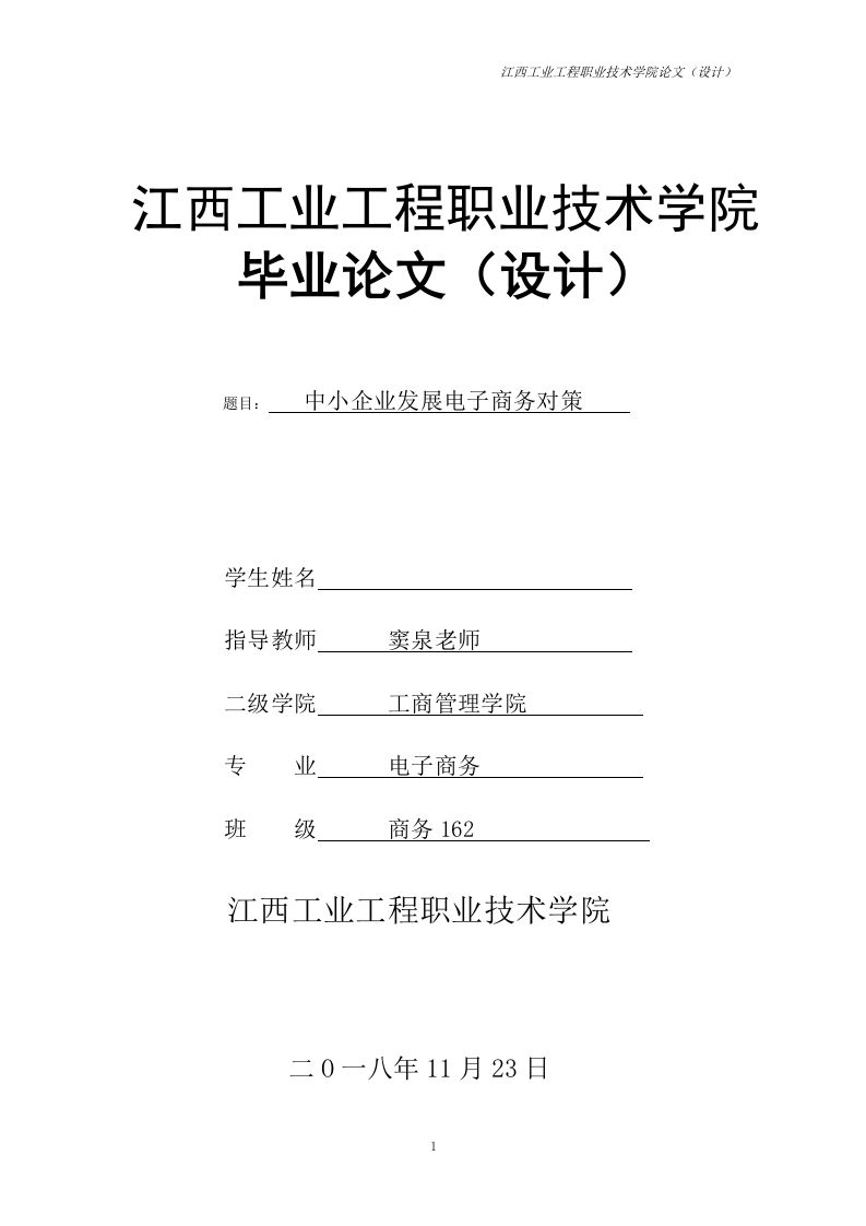江西工业工程职业技术学院论文(设计)江西工业工程职业技术学院毕业论文(设计)题目:中小企业发展电子商务对策学生姓名指导教师窦泉老师二级学院工商管理学院专业电子商务班级商务162江西工业工程职业技术学院二0一八年11月23日江西工业工程职业技术学院论文(设计)2016级电子商务专业学生毕业论文开题报告姓班电子商务162学联系电话名级号拟中小企业发展电子商务对策写论文题目论文电子商务飞速发展,成为国内经济的一大亮点,那么电子商务对我国国际贸易研究又有什么影响呢?随着电子商务在社会经济生活各个领域的加快渗透,以及迅的意速增长的网络交易规模对实体经济影响力的彰显,对电子商务的经济属性、经义济价值的研究也被越来越多的专家者关注。然而中小企业发展中存在一定的问题,本文对这些问题进行探究,以使中小企业得以更好的发展。论文一、电子商务的特性目前中小企业发展电子商务的现状研究二、三、中小企业发展电子商务的措施的内容江西工业工程职业技术学院论文(设计)论12018年11月初-2018年11月5日,开题报告文②2018年11月6日-2018年11月10日,资料整理③2018年11月11日撰-2018年11月20日,论文初稿写时④2018年11月21-2018年11月25日,论文定稿间安排指导老师意见