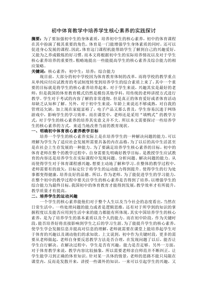初中体育教学中培养学生核心素养的实践探讨摘要:为了要加强初中生的身体素质,培养初中生的核心素养,初中的体育课程在其中扮演了极其重要的角色。体育是一门能增强学生身体素质的同时,还可以促进身心发展的课程。因此,体育这门课程机能帮助学生了解到自己的兴趣爱好,又能为之养成锻炼的好习惯。而本文将根据初中生的实际培养情况以及对于学生核心素养培养的重要性,粗略地提出一些能提高学生的核心素养及综合能力的相应策略。关键词:核心素养:初中生:培养:综合能力现目前,大部分的初中学校因为体育教育体制的改革,而将学校的教学重点从单纯应付应试教育的考试制度转变到培养学生的综合素质上来了,其中一个重要的目标就是将学生的核心素养培养起来。对于学生来说,兴趣其实是最好的老师,但是我国的体育教育模式仍然是模仿其他学科,用传统的老师讲授方式进行教学。学生对于考试的内容了解的非常透彻,但是真正的体育爱好或者体育活动却缺乏认知和了解。另外,对于初中生来说,年龄上来说还不够成熟,对自我的管理还欠缺,加上现在家庭富裕了,电子产品又那么普及,学生容易沉迷于网络游戏中,影响学生的学习效率。而在课堂中,老师还是采用“填鸭式”的教学方式,对于学生的核心素养的培养其实意义并不大。所以本文需要探讨一些培养学生的核心素养的方式,来适当地改善当前的教育现状。一、明确初中体育核心素养教学目标培养一个学生的核心素养实际上是在培养学生的一种解决问题的能力。可以理解为学生为了适应社会发展所需要具备的内在品格,为了以后的高中生活甚至是在社会上生存发展的一种能力。为了要满足培养学生核心素养的目标,初中的体育老师在整个的教学过程中,自身需要先明确好教学目标。是教授学生应试教育的内容还是培养学生在实际课程中发现问题、分析问题、解决问题的能力。从而使得学生对于体育课程感兴趣,想要主动地了解和学习。在整体的教学过程中,老师需要有的放矢,目标定位于将学生的运动能力得到提升。使得学生的行为处事都变得健康,培养良好的品德。所以,作为老师,为了能促进学生的学习能力,在整个初中的教学过程中要关注学生的核心素养是否得到了培养,以增强学生的综合能力为最终目标,我国初中的体育教育才能得到发展,教学效率才有所提升,教学质量才有提高。二、培养学生的运动兴趣一个学生的核心素养能他们对于整个人生以及当今社会的态度看出,当然在日常生活中,一些处理问题的能力或者是逻辑思维,还有对于所学到的知识的掌握程度以及能否应用到生活中来的能力都能有所体现。其实中国培养学生的核心素养,是为了培养学生的基本素质以及个人的能力。而在初中阶段,作为关键时段,能否培养好将直接影响到学生之后的学习生涯。为了能提升学生的核心素养,使学生学会发掘信息并提高对信息的理解,老师就需要在课堂上能培养起学生对于体育的兴趣以及调动他们的求知欲。上文说到,初中作为关键时段,更多的需要从老师做起,老师自身要反思教学方法是否合理,在发现问题了以后,能否让学生自行解决。在解决过程中,学生是否有兴趣,能力是否足够。另外一方面,对于体育教学来说,教学内容比较抽象,所以需要老师亲自师范并不断纠正,让学生能学习到正确的体育知识。针对某一具体的情景,老师的思路不能只局限在课堂内,反而是发散开来,讲授一些课外的知识,一来可以引起学生的兴趣,又可以增加学生的知识面。让学生进行小组讨论,分别讲解自己对于知识的理解以及如何能养成良好的习惯保持这一兴趣等等。总的来说,老师不能只应付应试教育所带来的考核制度,更加注重学生兴趣的培养,为以后的人生道路打下结实的基础。三、完普体育课评价体系对体育课堂学生参与情况进行适当的评价,充分的体现出了初中体育课的地位。传统的体育课堂活动缺乏一定的评价体系,难以提高学生对体育课的重视程度。对此,教师可以创新完善高校体育的教学评价体系,在每一节课的结束后为学生在课堂上的行为表现作出打分,对于成绩优异的学生,教师应该给予鼓励和表扬,适当的给予其更多的自由活动时间,对于评价成绩较差的学生,教师可以对其采取一定的惩罚措施,如跑步、跳绳等。值得注意的是,评价者不仅可以是教师,也可以是学生,即通过学生之间的互评,能够加深教师对学生的了解,也能激发每一位学生的进行体育活动的兴趣,这有利于培养学生的核心素养。结论:在初中阶段,对于学生核心素养的培养一来要满足教育体制改革的要求,还要看好以后社会对于人才的需要,培养好学生的实际解决问题的能力。而且对于初中生来说,是塑造一个良好品德的学生的最佳时期,能让学生终生受用。让学生对于体育有一个良好的兴趣,并能坚持进行体育锻炼,让学生的身心和生活得到一个平衡,增强对社会的适应能力。参考文献:[1]郭伟.初中体育教学中如何培养学生的核心素养[J].当代体育科技,2018,8(21):69-71.[2]高自然.初中体育教学中如何培养学生的核心素养[J刀.文教资料,2018(5):235-236.[3]申欣鑫.初中体育教学中培养学生核心素养的实践研究[J].教书育人,2018(5):79.