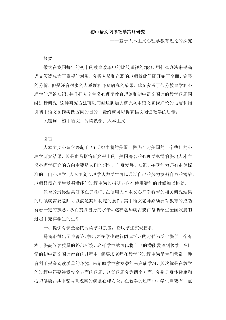 初中语文阅读教学策略研究一一基于人本主义心理学教育理论的探究摘要做为在我国每年的初中的教育改革中的比较重视的部分。用什么办法来提高语文阅读成为了重视的对象,分析人员和在职的老师就此问题开始了全面、完整的分析,但是还有很多的人质疑和怀疑研究的成果。此文参考了部分教育学和心理学的理论知识,并且把人文主义心理学教育理论和初中语文阅读的教学问题同时进行研究,这种研究方法可以同时达到加大研究初中语文阅读理论的力度和指引初中语文阅读实践方向的目的,最终就可以提高语文阅读教学的质量。关键词:初中语文;阅读教学:人本主义引言人本主义心理学兴起于20世纪中期的美国,做为当时美国的一个热门的心理学研究结果,其是由马斯洛研究得出的。美国著名的心理学家雷伯提出人本主义心理学研究的方向主要是人们的想法,自身发展、知识、接受能力还有审美标准的一门心理学。人本主义心理学认为学生可以通过自己的努力发掘自身的潜能,老师只需在学生发掘潜能的过程中为其指明方向在使用潜能的时候加以协助。教育的最终结果好坏在于教师。在使用人本主义心理学教育的相关研究结果的时候就需要老师可以满足其所制定的条件,其中语文老师必须要对教育的成功有着一定的执念,从而提高自身的水平。这样老师就需要在帮助学生全面发展的过程中充实学生的生活。一、提供有安全感的阅读学习氛围,帮助学生实现自我马斯洛得出了性善论,提出要在学生进行阅读学习的时候为学生提供一个有利于提高阅读质量的外部环境,这样学生就可以将自己的潜能发挥到极致。在日常的初中语文阅读教育的过程中,就要求老师在教学的过程中为学生们营造一种有利于提高阅读质量的环境,来帮助学生激发潜能来完成学习,其次就是在教学的过程中还要注意安全方面的问题,这类问题分为两个方面,分别是身体健康和心理健康,其中要着重观察的就是心理安全。在教学的过程中,学生需要有一点的心理安全感的前提下,才能进行自由的讨论,在安全的条件下,学生才可以自行进行阅读和学习、根据自己的内心需求去学习。这样才可以发掘自我潜能,明确自己的学习目的,进一步的实现自己的价值。罗杰斯所提出的自由学习观中认为学生在危险的环境中是无法进行高效的学习的。初中生有自己的思维方式、喜好学习新的知识,他们有自己的性格、三观,其所做所想是不愿被别人控制的。在阅读教学中,如果老师需要学生的每个动作和每句话都要遵守一定的规定,那么就会是学生有一定的心理压力。语文老师想让学生在想法和做法上有一定的提高,就需要对学生的答案表示认同,老师要告诉学生,不管大家的想法是怎样的,都可以进行讲述。这样做是因为语文本身就是一个多变的学科,许多问题是不存在统一的答案的。老师可以反驳学生的想法,但不可以限制其寻找答案和自由发言的权利。在进行初中语文阅读教学的时候,老师不仅要帮助学生去寻找不同的答案,还要支持学生提出对于课本的疑惑,指出课本中表达不正确的地方,在现实中课本也会出现一定的问题。在初中时期学生需要建立起一个正确的人际关系的体系,其中就包括和老师的关系。在上课的过程中是创建正确的人际关系的良好时机,对建立和谐的师生关系和引导学生的人生道路都是有帮助的。二、提供合适的阅读教学资源,帮助学生确立目标自主学习马斯洛所提出的自我实现理论中提到:在自身成长的过程中,选择的正确与否是占重要的一部分的,在实现自身价值的过程中是需要不断的自主选择的。其实在自我选择中,人不是单独存在的,我们不仅要使用自己的知识也要使用他人发知识。并且在自主选择的时候还能找到一定的学习兴趣,这就需要老师给学生一定的思考空间来帮助学生以自身的需求为目标来进行选择性的阅读。罗杰斯所提出的“以学生为主”的理论就需要学生在学习时找到自己的价值。我们所说的适合的阅读选择的意思就是以教材为中心所展开的有关于阅读书籍的选择。初中语文老师在对课外读物进行选择的时候,就要将学生个性的需求和兴趣方向考虑在内。在选择课外读物的时候,老师和学生应该注意双方的需求。选择的书籍需要涉及其所好奇的事物,还要提高其自尊感,这样才能提高学生的学习兴趣,并且在学生学习快乐的前提下让学生的积极性得到提高、学习的效果更加明显。三、创设情境,阅读教学中突出情感因素,丰富学生的情感体验人本主义心理学学习理论认为,在课堂上,应该考虑学生的感情色彩,知识和感情不进行结合就会导致学生的学习不是很全面。在进行初中语文阅读教学的时候,学生要在寻求知识的同时达到被关注、自己去实践、感受成功、创新、自尊心受到尊重、发挥自己的长处和解决好奇的问题等。马斯洛所提出的需求层次理论中认为,学生一定要有自己的审美标准,对爱和被爱有一定自己的理解。这样就要初中学生必须在进行语文阅读学习的时候提高自己对感情的了解充实自己的感情世界。要进行长久的学习,这样才能真正的实现马斯洛所提出的自我实现。感情就是学生长久学习的动力。罗杰斯所提出的知识和感情的统一,实际上是在学生除智力外的其他方面都有一定成长的前提下进行的,其实质就是对学生