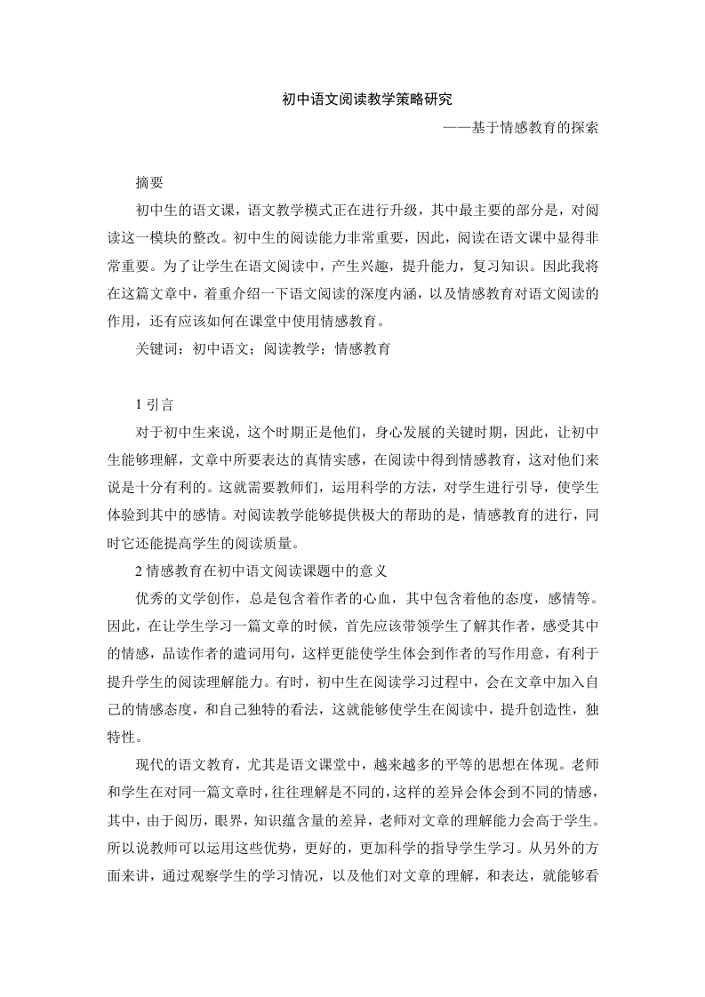 初中语文阅读教学策略研究一一基于情感教育的探索摘要初中生的语文课,语文教学模式正在进行升级,其中最主要的部分是,对阅读这一模块的整改。初中生的阅读能力非常重要,因此,阅读在语文课中显得非常重要。为了让学生在语文阅读中,产生兴趣,提升能力,复习知识。因此我将在这篇文章中,着重介绍一下语文阅读的深度内涵,以及情感教育对语文阅读的作用,还有应该如何在课堂中使用情感教育。关键词:初中语文:阅读教学:情感教育1引言对于初中生来说,这个时期正是他们,身心发展的关键时期,因此,让初中生能够理解,文章中所要表达的真情实感,在阅读中得到情感教育,这对他们来说是十分有利的。这就需要教师们,运用科学的方法,对学生进行引导,使学生体验到其中的感情。对阅读教学能够提供极大的帮助的是,情感教育的进行,同时它还能提高学生的阅读质量。2情感教育在初中语文阅读课题中的意义优秀的文学创作,总是包含着作者的心血,其中包含着他的态度,感情等。因此,在让学生学习一篇文章的时候,首先应该带领学生了解其作者,感受其中的情感,品读作者的遣词用句,这样更能使学生体会到作者的写作用意,有利于提升学生的阅读理解能力。有时,初中生在阅读学习过程中,会在文章中加入自己的情感态度,和自己独特的看法,这就能够使学生在阅读中,提升创造性,独特性。现代的语文教育,尤其是语文课堂中,越来越多的平等的思想在体现。老师和学生在对同一篇文章时,往往理解是不同的,这样的差异会体会到不同的情感,其中,由于阅历,眼界,知识蕴含量的差异,老师对文章的理解能力会高于学生。所以说教师可以运用这些优势,更好的,更加科学的指导学生学习。从另外的方面来讲,通过观察学生的学习情况,以及他们对文章的理解,和表达,就能够看出学生对文章的掌握情况。这样就可以因材施教,面对不同请款的学生,使用不同的教学方法。3初中语文阅读课堂中的情感教育应用3.1在课堂间实施师生情感交流在语文课堂上,通过教学课程的进行,教师在授课的过程中,以一种平等的态度跟学生进行交流,这样能够使学生,产生一种主体意识,因此在课堂的教学活动中,学生会发挥自己的学习积极性,主动地进行学习与交流。在各种类型的教学方式中,语文课,特别是语文课中的阅读课,它是一种开发式,引导性的教学模式,对培养学生的自主性,独立思考性,具有重要的意义。在这一教学内容中,学生能够体会到文章的中心思想,并能学会多角度思考问题的学习方法。通常我们的语文教材,所选择的文章都有经过多方研究,文章内容丰富,人物形象丰满。也许我们还记得《盲孩子和他的影子》这篇课文。在语文教学活动中,老师用自己所熟悉的方法,引导学生对课文进行学习,使他们在学习过程中,能够体会到文章中角色的心理动态,从而能够加深学生的学习印象,增强学习效果。那么当教师在使用这种教学方法的时候,要从现实生活的实际出发,切实关注学生的情感体验变化,了解每个学生的性格特点,这样才能使学生对课文中的人物,及情感有深刻的体会,并且能够运用自己的独特想法进行创造。3.2优化阅读过程结构教学,提升学生的阅读能力新教改中明确的提出,要更加关注每一个学生,确保学生的主体地位和独特性。那么由于我们的语文科目是一门开放,自由的,自主性很高的科目,所以说语文教学在新课改中就显得尤为重要。现在的一个社会趋向,社会大众更加关注结果,而非过程,导致了现阶段的教育越来越向应试教育发展,他们把学习内容巨象化,把学习内容强迫性的灌输给学生。因此让学生在学习中变得非常被动,所以就对学习失去了兴趣,失去了自主学习的动力,同时也不能够更好的理解知识。虽然有些老师,有教会学生学习能力的想法,但在实施过程中,往往因为一些这样那样的原因而搁浅,因此学生并不能从中学习到一些学习方法,只能学习到一些皮毛。3.3在课本的“精妙处”聚焦情感什么事课本的精妙地方呢?通过这个词语的表面就可以知道,这就是指课文中的那些优美的语言与段落。因此,当在教学过程中遇到了课文精彩的地方,教师就是用恰当的方法引导学生进行深度学习,这样一方面以来,故事学生对课文加深印象,另一方面,更能够使学生理解文章的意思与情感。这里我们举一个例子来讲,比方说优秀课文《春》,其中写其中写风来了,春来了的那一句,这句话有两层意思,即使对现实自然景物的描写,又通过拟人的方法把文章表现得更加生动形象。3.4注重初中语文阅读情境创设,加强学生情感体验情景创设,其意思就是说能在脑海中将文章中所描述的情景想象出来,他在我们的语文教学活动中,也是一个相当重要的教学技巧。有真情实感的文章会更能够吸引到学生,使学生对其产生兴趣。所以在我们的语文课堂上,教师可以通过情景模拟,情景再现等方法给学生们上课,让学生在类似的环境中,体会作者最初的感想,理解文章中作者想要表达的深意。同时还可以使用多媒体教室的各种工具,引导学生展开想象,进行自主思考,用自己的思想对文章进行解读。在这里,再讲一篇我们应该都有印象的课文,《安塞腰鼓》。在进行这堂课的教导前,教师可以提前布置作业,让学生们通过网络或一些其他途径,找到一些与课文相关的视频,音频或者是图片等等,这一方