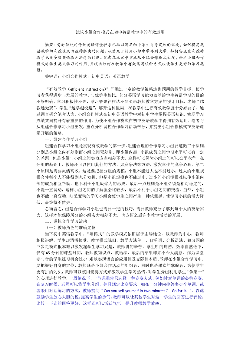 浅议小组合作模式在初中英语教学中的有效运用摘要:费时低效的传统英语课堂教学已雄以满足初中学生自身发展的需要,如何提高英语教学的有效性成为亟待解决的问题。从幼儿开始到小学中学再到大学,如何实现更有效的教学也是多数英语教师思考的问题。笔者在本文中重点从小组合作模式出发,分析小组合作模式对学生英文学习的作用,并提出如何在教学中有效运用该种方式以使学生更好的学习英关键词:小组合作模式:初中英语:英语教学“有效教学(efficient instruction)”即通过一定的教学策略达到预期的教学目标,使学习者获得进步与发展的教学。与优等生相比,部分英语学习能力较差的学生英语学习的目的不够明确,学习积极性不强,学习效果往往达不到英语教师教学方案的预计目标,老师“越教越无奈”,学生“越学越没趣”,解开这种僵局,在教学中进行有效教学就十分必要了。通过调查研究笔者认为,小组合作模式在初中英语教学中对初中学生掌握英语知识,实现学习成绩共同提升有着重要的作用。为使小组合作模式在初中英语教学中得到有效运用,笔者将从组建合作学习小组出发,重点分析调控合作学习活动部分,并提出小组合作模式在英语课堂开展的策略。一、组建合作学习小组组建合作学习小组是实现有效教学的第一步。组建合理的合作学习小组要遵循三个原则,分别是小组之内有差别而小组之间无差别。即小组内部,小组成员之间学习水平可以有一定的差距,但是小组与小组之间实力应当相差不大,这样可以保障小组之间可以公平竞争,在分组的基础上,教师还可以使用其他的方法,如竞争法等方法,激发学生的竞争心理。第二个原则是需要灵活高效。这是要把握分组的规模,小组不能过大也不能过小,过大的小组规模会使每个人不能得到充分发挥,但是小组规模也不能过小,过小的小组规模难以使小组内部的成员相互帮助,也不利于小组凝聚力的形成。最后一点规则是小组必须是相对稳定的,不能一直调动,这样小组之间的了解就会比较少,最后不利于小组之间的交流。当然,小组也不能一直变动,缺乏变动的学习小组会使学生之间产生一种依赖感,使学习小组的活力降低,最终得不偿失。总而言之,组建合作学习小组也需要一定的技巧,需要教师充分了解到每个人的英语实力,这样才能保障所分的小组实力相差不大,也方便之后许多教学活动的开展。二、调控合作学习活动(一)教师角色的准确定位当下初中英语教学中,“填鸭式”的教学模式依旧居于主导地位,以教师为中心,教师积极讲解,学生却消极接受,教学模式陈旧,教学方法单一,背单词、分析语法、做习题的三步走模式根本难以激发起学生学习兴趣,教师讲的辛苦,学生听的痛苦,效率自然低下,仅有45分钟的课堂时间,教师教知识点,教语法,最后的结果却并不令人满意。作为课堂参与者的学生练习机会过少,难以实现语言的应用性及交际性本质。教师在小组合作学习中,要把握好自身的定位,教师既是小组合作活动的组织者,同时也是课堂的掌舵者,为使学生更有拼的劲头,教师可以使用竞赛方式来激发学生学习热情。对学生分组利用学生“争第一”的心理进行教学,一般情况下,一节课通常只选择一种竞赛方式,例如针对单词的必答竞赛,在复习时候,老师可以将学生分组,并且规定比赛要求,如在一分钟内抢答多少个单词,或者采用对话练习的方式,教师提问“Can you sell yourself in two minutes?Go for it..”,以此鼓励学生放心大胆的说,提高学生的勇气,教师可以让其他学生对这一学生的回答进行评论,比较一下谁的回答更好。这样还可以活跃气氛,提升教师教学效率。(二)合作时机的合理选择“和谐安全的课堂氛围是成功教育的基础”是教育学家罗杰斯的教学观点,创造和谐轻松的课堂氛围可以使学生情感处于积极的状态,从而主动学习,部分学生本身基础偏差,潜在的一些自卑心理使其对所有文化课的学习都消极应对,英语并非母语,某些学生学习起来比较困难,一些学生甚至自嘲为“英盲”,对英语学习持排斥心理,对英语教师的教学消极应付,所以英语教师应当尽可能多的鼓励学生,使学生改变学习态度。教师的激励措施是激发学生学习的动力,“Excellent.”“You can do it..”“Wonderful!”“You are clever.”这些鼓励的语言是调节师生关系的调和剂,以表扬为主来使学生主动配合教师教学,(三)合作时间的准备把握小组合作是一种新型的教学方式,对学生英语学习有较大的帮助,但是教师也应该注意调控合作的时间,不能过长,如果合作时间太长,那么学生们变会利用这些时间聊天,或者作出其他的活动,而不单单只限于学习,这样的话,小组合作实际上就成为了“摆设”,没有半点用处。甚至还影响学生的进步。合作时间的准备把握还表现在可以在相应的时间及时停止小组合作,以达到更好的教学效果。如在讲解“what's your hobby?”一单元时,学生可以拿部分物品如篮球、乒乓球、跳绳等物件,在提升课堂活跃度的同时,学习相关知识。如学生在了解了本单元知识之后,在小组内进行提问“What can you do in your spare time?”学生在掌握了固定句型“I usually do.in my spare time.”之后,进行套用,这本是极大的提高了学习兴趣,但是这种玩具型的必然会使学生的聊天主题有所偏向,并偏离到游戏上去,这时候,即便是冷却当时课堂学习氛