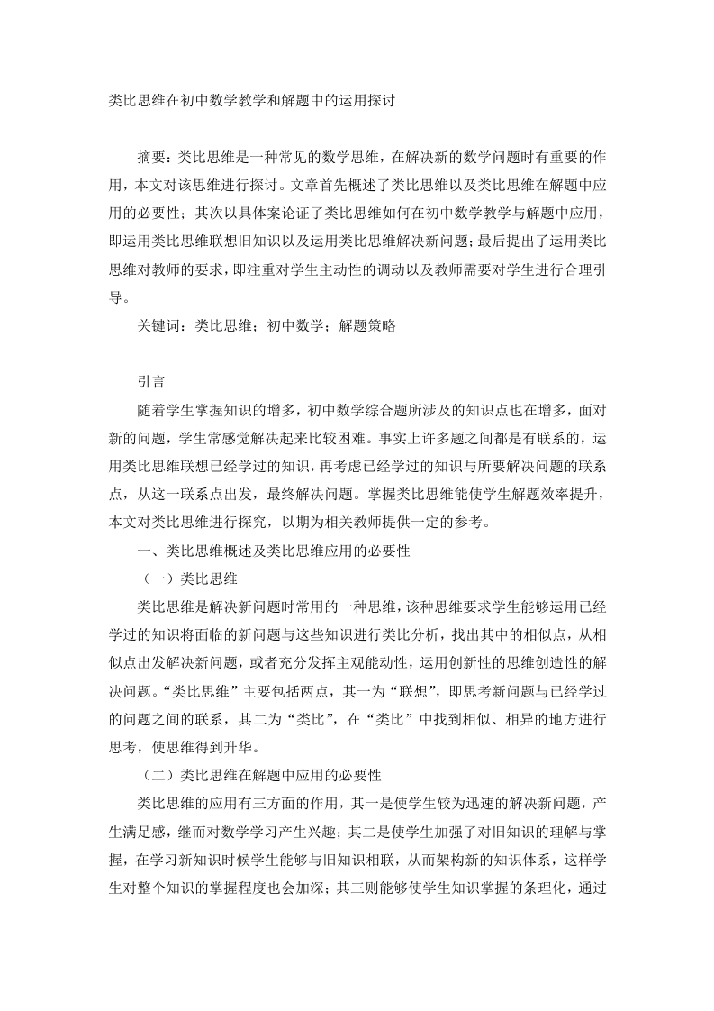 类比思维在初中数学教学和解题中的运用探讨摘要:类比思维是一种常见的数学思维,在解决新的数学问题时有重要的作用,本文对该思维进行探讨。文章首先概述了类比思维以及类比思维在解题中应用的必要性:其次以具体案论证了类比思维如何在初中数学教学与解题中应用,即运用类比思维联想旧知识以及运用类比思维解决新问题:最后提出了运用类比思维对教师的要求,即注重对学生主动性的调动以及教师需要对学生进行合理引导。关键词:类比思维:初中数学:解题策略引言随着学生掌握知识的增多,初中数学综合题所涉及的知识点也在增多,面对新的问题,学生常感觉解决起来比较困难。事实上许多题之间都是有联系的,运用类比思维联想已经学过的知识,再考虑已经学过的知识与所要解决问题的联系点,从这一联系点出发,最终解决问题。掌握类比思维能使学生解题效率提升,本文对类比思维进行探究,以期为相关教师提供一定的参考。一、类比思维概述及类比思维应用的必要性(一)类比思维类比思维是解决新问题时常用的一种思维,该种思维要求学生能够运用已经学过的知识将面临的新问题与这些知识进行类比分析,找出其中的相似点,从相似点出发解决新问题,或者充分发挥主观能动性,运用创新性的思维创造性的解决问题。“类比思维”主要包括两点,其一为“联想”,即思考新问题与已经学过的问题之间的联系,其二为“类比”,在“类比”中找到相似、相异的地方进行思考,使思维得到升华。(二)类比思维在解题中应用的必要性类比思维的应用有三方面的作用,其一是使学生较为迅速的解决新问题,产生满足感,继而对数学学习产生兴趣:其二是使学生加强了对旧知识的理解与掌握,在学习新知识时候学生能够与旧知识相联,从而架构新的知识体系,这样学生对整个知识的掌握程度也会加深:其三则能够使学生知识掌握的条理化,通过深入思考,学生必然对知识的掌握及使用能力得到加深,使知识更加有条理。二、类比思维在初中数学教学与解题中的实践运用类比思维进行解题,需要首先是进行联想,将旧知识与新知识连接起来,再从连接点出发解决新的问题。在教学中教师也应当对学生进行引导,使学生解决问题更加有效率。(一)课程导入阶段类比思维法的应用在课堂导入阶段便让学生充分的发挥主观能动性,进行探索,能够起到事半功倍的教学效果,当前学生大多习惯听老师的指导,老师说让如何便如何,很少进行思考,这样教师即便设计了很好的导入方式,学生的注意力也可能没有放在教师的教学上,所以为了充分的发挥学生的主观能动性,实现学生的自主的进行类比学习,必须让学生也充分的参与到课堂导入环节之中,这样既能激发了学生的学习兴趣,同时还能有助于教师其他教学活动的开展。例如在对于“正数”、“负数”的讲解,教师可以将“正数”、“负数”与数轴结合起来,使学生轻松的了解何为“正数”、何为“负数”。当然,数轴的绘画可以让学生自己来摸索,在学生进行绘画的时候,还可能从中看出“正数”、“负数”的变化规律,在不断的探索中,也能更好的解决较为复杂的问题。例如在正负数的基础上的习题,假设有a、b两个数,其中a>0,b<0,并且al