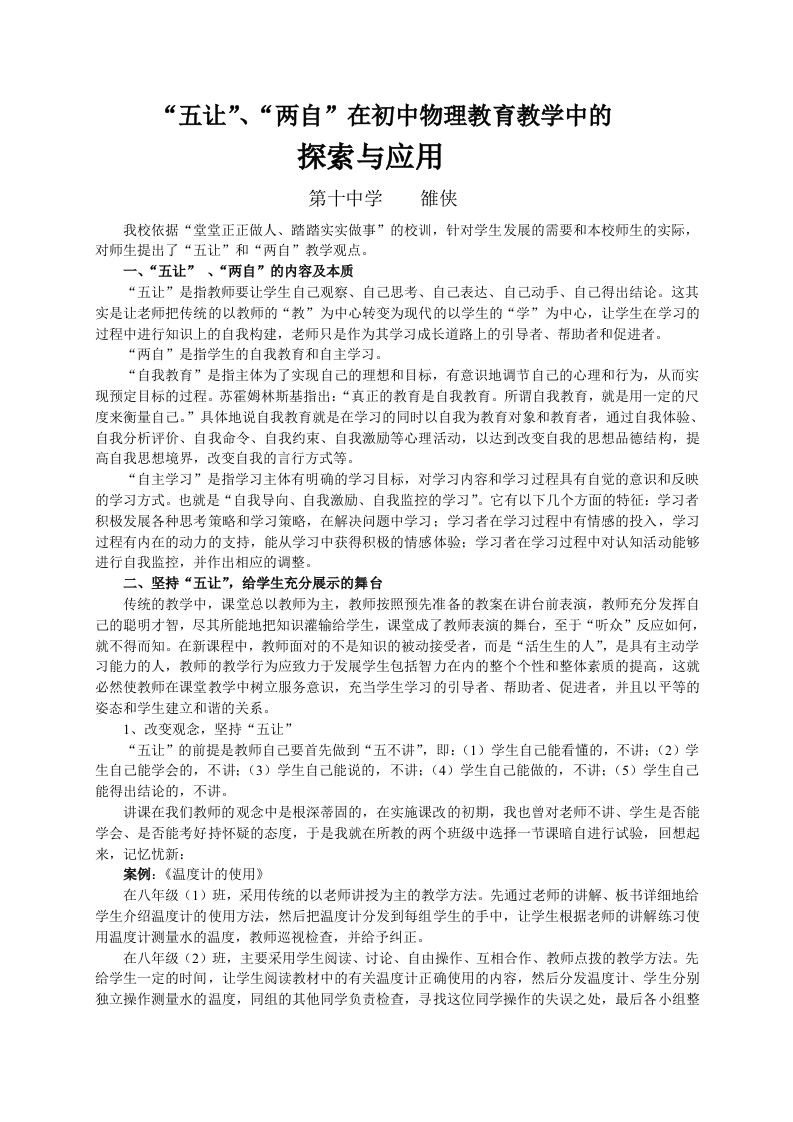 “五让”、“两自”在初中物理教育教学中的探索与应用第十中学雒侠我校依据“堂堂正正做人、踏踏实实做事”的校训,针对学生发展的需要和本校师生的实际,对师生提出了“五让”和“两自”教学观点。一、“五让”、“两自”的内容及本质“五让”是指教师要让学生自己观察、自己思考、自己表达、自己动手、自己得出结论。这其实是让老师把传统的以教师的“教”为中心转变为现代的以学生的“学”为中心,让学生在学习的过程中进行知识上的自我构建,老师只是作为其学习成长道路上的引导者、帮助者和促进者。“两自”是指学生的自我教育和自主学习。“自我教育”是指主体为了实现自己的理想和目标,有意识地调节自己的心理和行为,从而实现预定目标的过程。苏霍姆林斯基指出:“真正的教育是自我教育。所谓自我教育,就是用一定的尺度来衡量自己。”具体地说自我教育就是在学习的同时以自我为教育对象和教育者,通过自我体验、自我分析评价、自我命令、自我约束、自我激励等心理活动,以达到改变自我的思想品德结构,提高自我思想境界,改变自我的言行方式等。“自主学习”是指学习主体有明确的学习目标,对学习内容和学习过程具有自觉的意识和反映的学习方式。也就是“自我导向、自我激励、自我监控的学习”。它有以下几个方面的特征:学习者积极发展各种思考策略和学习策略,在解决问题中学习:学习者在学习过程中有情感的投入,学习过程有内在的动力的支特,能从学习中获得积极的情感体验:学习者在学习过程中对认知活动能够进行自我监控,并作出相应的调整。二、坚持“五让”,给学生充分展示的舞台传统的教学中,课堂总以教师为主,教师按照预先准备的教案在讲台前表演,教师充分发挥自己的聪明才智,尽其所能地把知识灌输给学生,课堂成了教师表演的舞台,至于“听众”反应如何,就不得而知。在新课程中,教师面对的不是知识的被动接受者,而是“活生生的人”,是具有主动学习能力的人,教师的教学行为应致力于发展学生包括智力在内的整个个性和整体素质的提高,这就必然使教师在课堂教学中树立服务意识,充当学生学习的引导者、帮助者、促进者,并且以平等的姿态和学生建立和谐的关系。1、改变观念,坚持“五让”“五让”的前提是教师自己要首先做到“五不讲”,即:(1)学生自己能看懂的,不讲:(2)学生自己能学会的,不讲:(3)学生自己能说的,不讲:(4)学生自己能做的,不讲:(5)学生自己能得出结论的,不讲。讲课在我们教师的观念中是根深蒂固的,在实施课改的初期,我也曾对老师不讲、学生是否能学会、是否能考好持怀疑的态度,于是我就在所教的两个班级中选择一节课暗自进行试验,回想起来,记忆忧新:案例:《温度计的使用》在八年级(1)班,采用传统的以老师讲授为主的教学方法。先通过老师的讲解、板书详细地给学生介绍温度计的使用方法,然后把温度计分发到每组学生的手中,让学生根据老师的讲解练习使用温度计测量水的温度,教师巡视检查,并给予纠正。在八年级(2)班,主要采用学生阅读、讨论、自由操作、互相合作、教师点拨的教学方法。先给学生一定的时间,让学生阅读教材中的有关温度计正确使用的内容,然后分发温度计、学生分别独立操作测量水的温度,同组的其他同学负责检查,寻找这位同学操作的失误之处,最后各小组整理、汇总,老师板书点评。通过两个班级的比较,我发现在(1)班上课的过程中,在老师讲解的时候,有一部分学生心不在焉(他们可能认为老师讲的教材中都有,没有必要听),在测量水温的操作中,依然按照生活中的习惯随便测量,不知道自己的操作是对还是错。在(2)班上课的过程中,由于老师的少讲,更多的时间留给了学生,又有了小组同学的监督促进,相互纠错、补充,同学们学得都很认真,几乎所有的同学都能正确使用温度计测量水的温度。特别是在下课前的课堂检测中,对于温度计的正确使用,从整体上看,(2)班的同学明显优于(1)班的同学。从作为老师的我的行为来说,在(1)班虽然讲得条理清晰、头头是道,但学生的学习效果并不是很好:在(2)班虽然没有讲多少,但学生却学到了许多东西。从中我深感到学生的学习并不在于老师讲得多、讲得好,温度计的使用方法教材中是有的,学生能看懂、能学会、能会做,老师的所谓的规范的、详细的讲解真有画蛇添足之嫌,也可见“多言何益哉”!“授之以鱼,不若授之以渔”,陶行知先生说得好:“我以为好的先生不是教书,不是教学生,而是教学生学。”在后来的教学中,我都努力使自己少讲、精讲,注重对学生学习方法的引导。经过近半个学期的努力,我们师生之间的关系更融洽了,学生也更喜爱学习物理了,物理成绩也提高了。皮亚杰的发展理论认为:“在教学过程中,学生是学习的主体,他们在学习中构筑自己的知识大厦,而不是被动地接受知识的灌输:他们有自己特定的思维方式,而不是照搬成人的观点。为了适合学生的特点,教师在传授知识时,应该给予每个学生足够的操纵环境的机会和丰富的感性经验。”因此我们教师应当少讲,坚持“五不讲”和“五让”,让学生自己观察、自己思考、自己表达、自己动手、自己得出结论,让学生在自己的学习体验中构建自己的知识体系,实现自身的发展。2、培养学生的兴趣兴趣是最好的老师