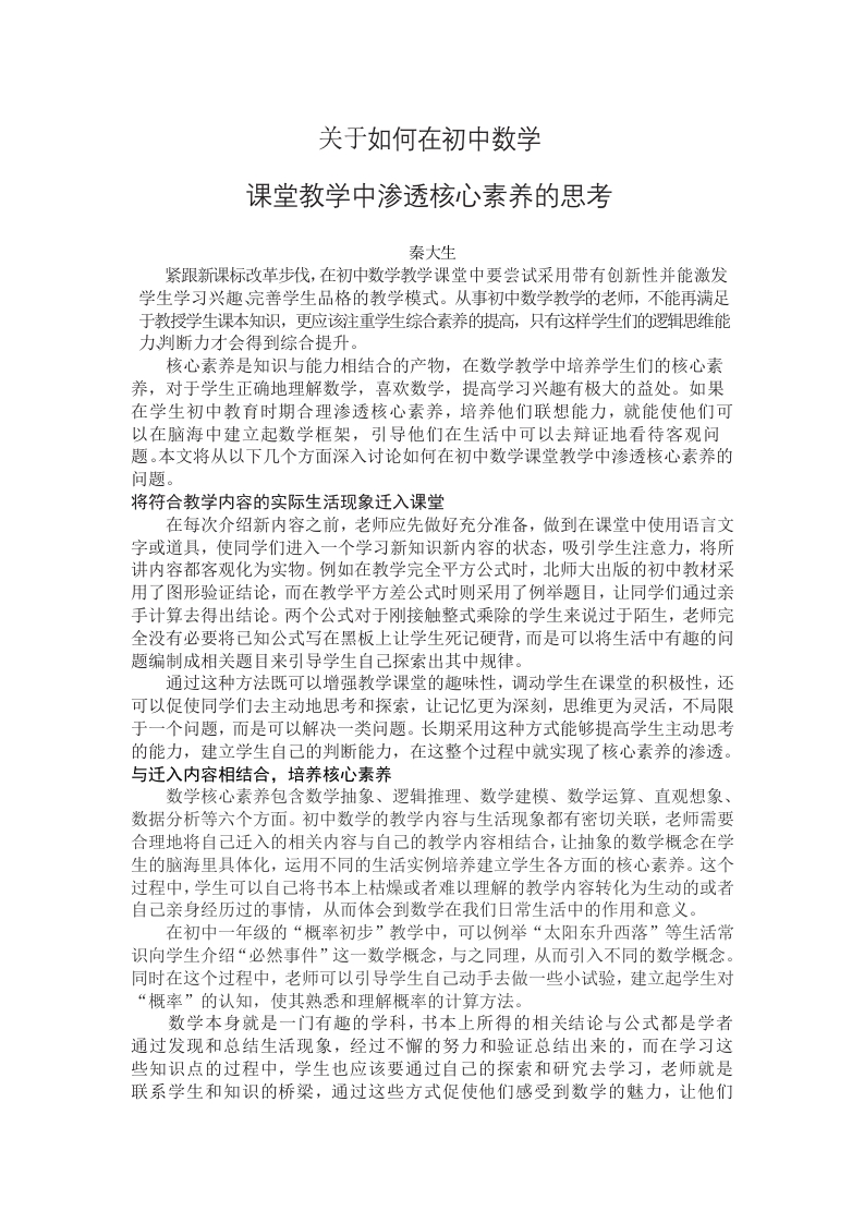 关于如何在初中数学课堂教学中渗透核心素养的思考秦大生紧跟新课标改革步伐,在初中数学教学课堂中要尝试采用带有创新性并能激发学生学习兴趣完善学生品格的教学模式。从事初中数学教学的老师,不能再满足于教授学生课本知识,更应该注重学生综合素养的提高,只有这样学生们的逻辑思维能力判断力才会得到综合提升。核心素养是知识与能力相结合的产物,在数学教学中培养学生们的核心素养,对于学生正确地理解数学,喜欢数学,提高学习兴趣有极大的益处。如果在学生初中教育时期合理渗透核心素养,培养他们联想能力,就能使他们可以在脑海中建立起数学框架,引导他们在生活中可以去辩证地看待客观问题。本文将从以下几个方面深入讨论如何在初中数学课堂教学中渗透核心素养的问题。将符合教学内容的实际生活现象迁入课堂在每次介绍新内容之前,老师应先做好充分准备,做到在课堂中使用语言文字或道具,使同学们进入一个学习新知识新内容的状态,吸引学生注意力,将所讲内容都客观化为实物。例如在教学完全平方公式时,北师大出版的初中教材采用了图形验证结论,而在教学平方差公式时则采用了例举题目,让同学们通过亲手计算去得出结论。两个公式对于刚接触整式乘除的学生来说过于陌生,老师完全没有必要将已知公式写在黑板上让学生死记硬背,而是可以将生活中有趣的问题编制成相关题目来引导学生自己探索出其中规律。通过这种方法既可以增强教学课堂的趣味性,调动学生在课堂的积极性,还可以促使同学们去主动地思考和探索,让记忆更为深刻,思维更为灵活,不局限于一个问题,而是可以解决一类问题。长期采用这种方式能够提高学生主动思考的能力,建立学生自己的判断能力,在这整个过程中就实现了核心素养的渗透。与迁入内容相结合,培养核心素养数学核心素养包含数学抽象、逻辑推理、数学建模、数学运算、直观想象、数据分析等六个方面。初中数学的教学内容与生活现象都有密切关联,老师需要合理地将自己迁入的相关内容与自己的教学内容相结合,让抽象的数学概念在学生的脑海里具体化,运用不同的生活实例培养建立学生各方面的核心素养。这个过程中,学生可以自己将书本上枯燥或者难以理解的教学内容转化为生动的或者自己亲身经历过的事情,从而体会到数学在我们日常生活中的作用和意义。在初中一年级的“概率初步”教学中,可以例举“太阳东升西落”等生活常识向学生介绍“必然事件”这一数学概念,与之同理,从而引入不同的数学概念。同时在这个过程中,老师可以引导学生自己动手去做一些小试验,建立起学生对“概率”的认知,使其熟悉和理解概率的计算方法。数学本身就是一门有趣的学科,书本上所得的相关结论与公式都是学者通过发现和总结生活现象,经过不懈的努力和验证总结出来的,而在学习这些知识点的过程中,学生也应该要通过自己的探索和研究去学习,老师就是联系学生和知识的桥梁,通过这些方式促使他们感受到数学的魅力,让他们主动地去学习数学,灵活的应用数学。将教学内容分层分级,并作出相应解决方法在初中数学的学习当中,综合题是最令学生头疼的地方,学生很难从大篇幅的题目中获取有用的解题信息。比如在分析平面几何的综合大题时,老师在讲解时需要引导学生学会划分层次,提取有效信息,利用好已知条件,避免将一道题囫囵吞枣地通读一遍,理不清解题思路。题目中所给出的数据和条件都有其特殊的含义和作用,老师需要让学生在读题做题时逐渐建立起自己的解题方法和体系。数学的逻辑严密,所有的因果关系都要经得起推敲,有定理和推理作为支撑,不能凭空想象。老师在教学过程中不应该“一把抓”,而是要分难易,分重点,让同学们不再局限于一种解题方法,跳出固定思维,扩展了他们的眼界,潜移默化地逐渐渗透核心素养。综上所述,渗透核心素养需要老师和学生共同实现,老师需要在这个过程中投入大量的精力,带动学生一起探索和探究。老师在这个过程中可以使学生形成多角度思维模式和综合运用能力,进一步培育学生的综合素养,为学生创造了开放式的学习空间,提高了课堂效率,从而推进了数学教学的发展。