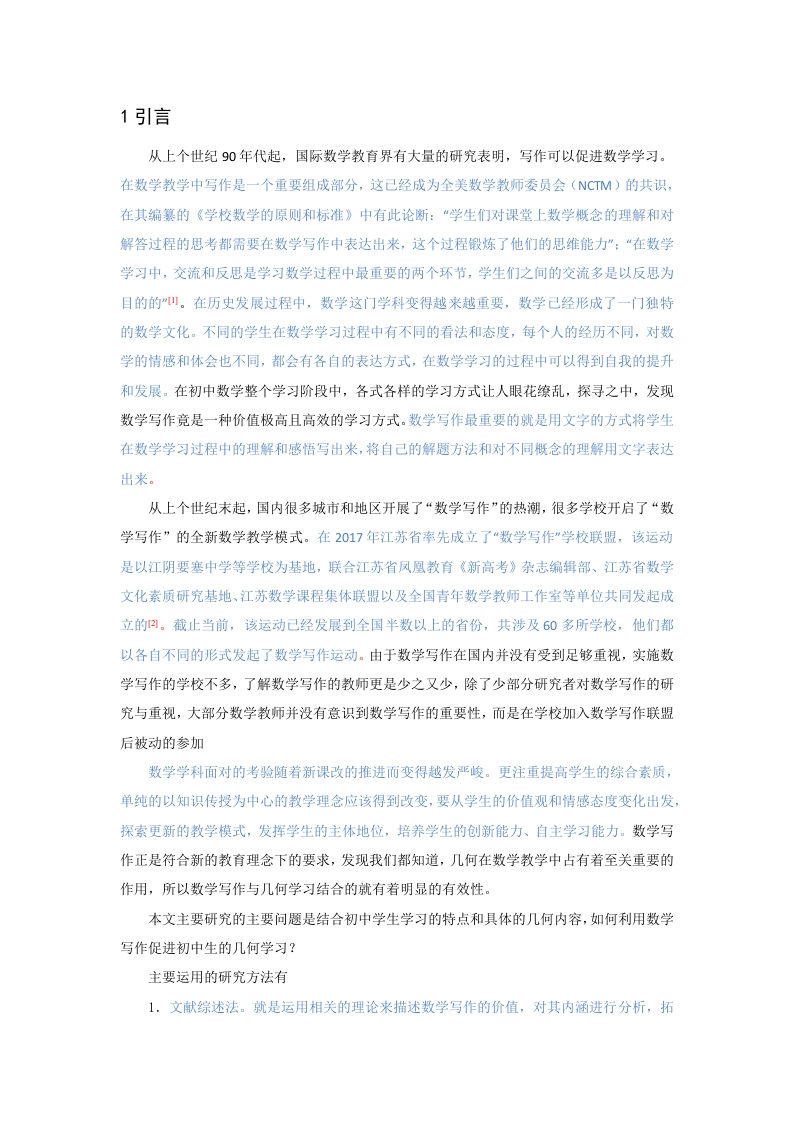 1引言从上个世纪90年代起,国际数学教育界有大量的研究表明,写作可以促进数学学习。在数学教学中写作是一个重要组成部分,这己经成为全美数学教师委员会(NCTM)的共识,在其编纂的《学校数学的原则和标准》中有此论断:“学生们对课堂上数学概念的理解和对解答过程的思考都需要在数学写作中表达出来,这个过程锻炼了他们的思维能力”:“在数学学习中,交流和反思是学习数学过程中最重要的两个环节,学生们之间的交流多是以反思为目的的山。在历史发展过程中,数学这门学科变得越来越重要,数学己经形成了一门独特的数学文化。不同的学生在数学学习过程中有不同的看法和态度,每个人的经历不同,对数学的情感和体会也不同,都会有各自的表达方式,在数学学习的过程中可以得到自我的提升和发展。在初中数学整个学习阶段中,各式各样的学习方式让人眼花缭乱,探寻之中,发现数学写作竞是一种价值极高且高效的学习方式。数学写作最重要的就是用文字的方式将学生在数学学习过程中的理解和感悟写出来,将自己的解题方法和对不同概念的理解用文字表达出来。从上个世纪末起,国内很多城市和地区开展了“数学写作”的热潮,很多学校开启了“数学写作”的全新数学教学模式。在2017年江苏省率先成立了“数学写作”学校联盟,该运动是以江阴要塞中学等学校为基地,联合江苏省凤凰教育《新高考》杂志编辑部、江苏省数学文化素质研究基地、江苏数学课程集体联盟以及全国青年数学教师工作室等单位共同发起成立的四。截止当前,该运动己经发展到全国半数以上的省份,共涉及60多所学校,他们都以各自不同的形式发起了数学写作运动。由于数学写作在国内并没有受到足够重视,实施数学写作的学校不多,了解数学写作的教师更是少之又少,除了少部分研究者对数学写作的研究与重视,大部分数学教师并没有意识到数学写作的重要性,而是在学校加入数学写作联盟后被动的参加数学学科面对的考验随着新课改的推进而变得越发严峻。更注重提高学生的综合素质,单纯的以知识传授为中心的教学理念应该得到改变,要从学生的价值观和情感态度变化出发,探索更新的教学模式,发挥学生的主体地位,培养学生的创新能力、自主学习能力。数学写作正是符合新的教育理念下的要求,发现我们都知道,几何在数学教学中占有着至关重要的作用,所以数学写作与几何学习结合的就有着明显的有效性。本文主要研究的主要问题是结合初中学生学习的特点和具体的几何内容,如何利用数学写作促进初中生的几何学习?主要运用的研究方法有1,文献综述法。就是运用相关的理论来描述数学写作的价值,对其内函进行分析,拓展其应用基础:2.问卷调查法、访谈法:采用问卷调查和访谈的形式,了解目前在初中学生学习数学和教师教学中开展数学写作的实际情况:3.实验研究法:就是以实验的方法,将初中学生为研究对象,验证数学写作在初中生数学教学中的效果。2数学写作及初中几何学习的理论分析2.1数学写作及其功能2.1.1数学写作的内涵写作并不是语文课程的专属,它也可以是学习数学课程的基本技能之一,有其独特而重要的价值。蒯红良、张群红等人发表的《浅析数学写作的教学策略》中明确指出,能够对数学的学习产生促进效果的写作活动,就被称为数学写作。在此类学习过程中,要求学生将正在学习的知识和原有知识贯通,这是一种更高层次的学习状态)。在此过程中,学生可以完善自己的数学知识框架,查漏补缺,可以对重要知识点以及遗漏的知识点进行二次的学习,加深理解和掌握,有利于探究更好的学习方法,可以使得自身的基础知识更加扎实。有利于对自己学习活动有更全面的反思。胡耀华在研究中指出,数学写作重要的就是巩固自己的知识结构,拓展自己对数学的认识,在用文字表达的过程中加深了自己对数学概念、解题思路以及学习方法的理解。区别于数学解题更关注结果,数学写作是对思维过程的锻炼,行为动机是不同的,注重的是非表述思维结果,学生会将自己的思考过程更大化输出周。综上可知:将自身对数学课的情感态度,对解题思路解题方法以及对数学知识的理解用书面语言形式写出来,就可以称为数学写作。2.1.2数学写作的教育价值盛登的研究方向是“数学作文的价值”,在研究过程中他比较全面地研究了数学作文的教育价值。重视新的评价方式和数学学习方法的探索,为师生构建交流平台,培养学生的思考创新能力,开辟师生心灵通道,释放数学个性,建和谐师生关系,这都是数学作文的价值所在。胡耀华发表于数学教育学报的《数学写作的价值及若干建议》,这篇文章引起了广泛的讨论,因为他从数学写作的角度剖析了此类方法的教育价值。文中指出,数学写作可以重构学生的知识框架可以在内在的方面审视学生的学习过程,是学生沟通自我的一种工具。由以上综述对数学写作的教育价值的阐述,不难发现,数学写作对于学生的数学学习和教师的教学都有着不可估量的价值。数学写作的价值仍有待于充分的挖掘,应该多将数学写作活动应用于实践教学中来。2.1.3数学写作的应用和实验研究在颜晓春等人发表的《数学写作在高中生中反思性学习中的应用研究》一文中明确数学写作有利于学生巩固自身的知识,完善逻辑架构,数学写作的应用