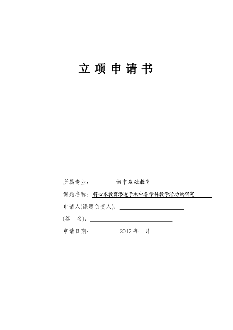 立项申请书所属专业:初中基础教育课题名称:将心本教育渗透于初中各学科教学活动的研究申请人(课题负责人):(签名):申请日期:2012年月(一)课题研究的现状及选题意义1、课堂研究的现状二十世纪九十年代至今,心理健康教育在中小学以星火燎原之势迅速铺开,而教育部也相继出台了若干文件,如教基[1999]13号文件《关于加强中小学心理健康教育的若干意见》、教基[2002]14号文件《中小学心理健康教育指导纲要》,粤教思[2007]42号《关于加强中小学心理健康教育师资队伍建设的意见》、粤教思[2008]83号《关于印发(中小学校心理健康教育工作规范(试行)〉等四个工作规范文件的通知》等,另外,还包括各中小学竞相招聘专职心理教师、申报国家和省市区各级心理健康教育优秀学校和心理课程等。而2009年初,华南师范大学心理学系、广东省中小学心理健康教育指导中心办公室主任吴发科研究员和他的团队率先提出“心本教育思想”,并且提出学教教育要从“人本”走向“心本”,要从“师本→生本→心本”和“班级心本管理”的观念进行转变,提出教育要“以心为本位”“心育乃教育之母”“育人先育心”等教育理念。心本教育理念的提出,是官大中小心育工作者的实践总结和教育科研成果的理论升华,它的提出,也引起了教育界同仁的广泛关注和讨论。2、选题意义一般而言,心本教育主要有以下几点解释:第一,中小学心理健康教育是根据中小学学生心理、生理发展特征,运用相关的心理教育手段和方法,培养学生良好的心理素质,从而促进学生身心全面和谐发展和素质全面提高的教育活动:第二,心理健康教育的具体目标是,让学生不断正确认识自我,增强调控自我、承受挫折、适应环境的能力,以及培养学习健全的人格和良好的人际关系的形成。1(二)要解决的主要问题、研究的主要内容及主要观点在中小学教育中开展心本教育,在传授学生知识、解题答疑的过程中,对学生开展养心育性的教育,培养学生的良好品行,同时,要注重学生的内心素质、想法的教育,一切都从新开始。其研究的主要内容包括以下几点:第一,将学生作为教育的主体,充分尊重学生的个性:第二,将心本教育作为教学重点,真正关爱学生,理解学生:第三,以培养学生素养为前提,重视学生综合素质的教育:(三)研究的主要思路及具体操作方法本文主要探讨关于心灵健康教育与心本教育的关系,以及如何正确认识和理解心本教育。并且提出一些对心本教育的错误认识和错误做法,同时,破解心本教育实践过程中的难题,以期推进心本教育的顺利开展。其具体操作方法如下:第一,心本教育是心品教育,要对学生进行心品教育,即从人格、个性、和谐心态等方面进行;第二,心品教育是教育思想品德的教育;第三,心本教育要注重实践活动,即学科教育,教育思想,在教育实践活动中进行,主要从心理教育、管理心理方面和社会心理方面进行。2