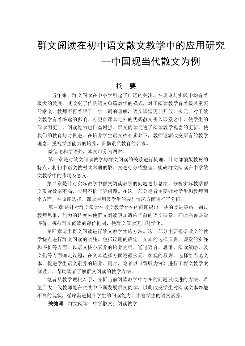 群文阅读在初中语文散文教学中的应用研究-中国现当代散文为例摘要近年来,群文阅读在中小学引起了广泛的关注。在理论与实践中均有着极大的发展。其改变了传统语文单篇教学的模式,对于阅读教学有着极其重要的意义。教师不再着眼于一字一词的理解,语文课堂更加开放、多元。对于散文教学有着深远的影响。将更多课本之外的优秀散文引入课堂之中,使学生的阅读面更广,阅读能力也日益增强。群文阅读促进了阅读教学观念的更新,使我们的教育与时俱进。在培养学生语文核心素养下,教师逐渐改变原有的教学理念,重视学生能力的培养,贯彻素质教育的要求。除绪论和结语外,本文可分为四章。第一章是对散文阅读教学与群文阅读的关系进行梳理,针对部编版教材的特点,将初中语文教材共六册的散。文进行分类整理,明确群文阅读在中学散文教学中的作用及意义。第二章是针对实际教学中群文阅读教学的问题进行总结,分析实际教学群文阅读效率不高、应用不恰当等问题。在这一部分笔者主要针对学生和教师两个方面,在议题选择、课堂应用及学生的参与情况方面进行了分析。第三章是针对群文阅读在散文教学存在的问题提出一些的改进策略。通过教师思维、能力的转变来使群文阅读更加适应当前的语文课堂。同时完善课堂评价,规范群文阅读的评价机制,使群文阅读更加科学化。第四章运用群文阅读进行散文教学实施方法。这一部分主要根据散文的教学特点进行群文阅读的实施。包括议题的确定、文本的选择原则,课堂的实施和评价等方面。以语文核心素养的培养为纲,通过语言、思维、阅读策略、及文化等方面确定议题,在文本选择方面遵循多元、客观的原则,选择恰当地文本,促进学生语文素养的培养。同时,笔者以《背影为例》进行了群文教学案例设计,帮助读者了解群文阅读的教学方法。笔者从教学现状入手,分析当前阅读教学中存在的问题及改进的方法。希望广大一线教师能在实践中不断发展群文阅读,以此改变学生对阅读文本兴趣不高的现状,循序渐进提升学生的阅读能力,丰富学生的语文素养。关键词:群文阅读:中学散文:阅读教学AbstractIn recent years,group reading has attracted wide attention in primary and secondaryschools.In theory and practice,there has been great development.It has changed the mode ofteaching in traditional Chinese,which is of great significance to reading teaching.Teacher nolonger focus on the understanding of the words the language classroom is more open andpluralistic.It has a profound influence on prose teaching.The introduction of more excellentessays beyond textbooks into the classroom will make students read more widely and theirreading ability is becoming more and more important.Group reading promotes the renewal ofreading teaching concepts and makes our education keep pace with the times.Under the corequality of cultivating students'language,teachers gradually change their original teachingphilosophy,attach importance to the cultivation of students'ability,and carry out therequirements of quality education.In addition to the introduction and conclusion,this article is divided into four chapters.The first chapter is to comb the relationship between prose reading teaching and groupreading.In view of the characteristics of the department's edited textbooks,the six-volume proseof junior high school language teaching materials is sorted and sorted,so as clearly the role andsignificance of group text reading in the teaching of prose in middle school.The second chapter summarizes the problems of group reading teaching in practicalteaching,analyzes the problems such as low reading efficiency and inappropriate application ofthe actual teaching group text.In this part,the author mainly focuses on students and teachers,in the choice of issues,classroom application and student participation in the analysis.The third chapter puts forward some improvement strategies for the problems of group textreading in prose teaching.Through the change of teacher's thinking and ability to make groupreading more adapted to the current language dlassroom.At the same time,improve theevaluation of the classroom,standardize the evaluation mechanism of group reading,makegroup reading more scientific.The fourth chapter uses group reading to carry out the method of prose teaching.This partmainly carries on the implementation of group reading according to the teaching characteristicsof prose.Including the determination of topics,text selection principles,classroomimplementation and evaluation.Taking the training of the core language literacy as the outline,1through language,thinking,reading strategy,and culture to determine the topic,in the textselection to follow the principle of pluralism,objectivity,choosing the appropriate text,promoting the cultivation of students'language literacy.At the same time,the author takes"Backas an example"to carry out the design of group language teaching case to help readers tounderstand the teaching methods of group reading more cearly.Key Words:Group text reading;Middle School Prose;reading teaching目录(一)“群文阅读”的相关背景61.群文阅读的缘起.72.群文阅读在大陆的发展(二)“群文阅读”概念的界定…82.群文阅读概念的界定(三)研究现状及成果分析.…1.群文阅读的相关文献…92.群文阅读教学应用…(四)研究内容及其理论依据…101.建构主义学习理论…2.互文性理论….113.核心素养下的语文阅读教学…11(五)研究价值与实践意义.12一、部编版散文课文选篇与群文阅读教学的可行性分析122