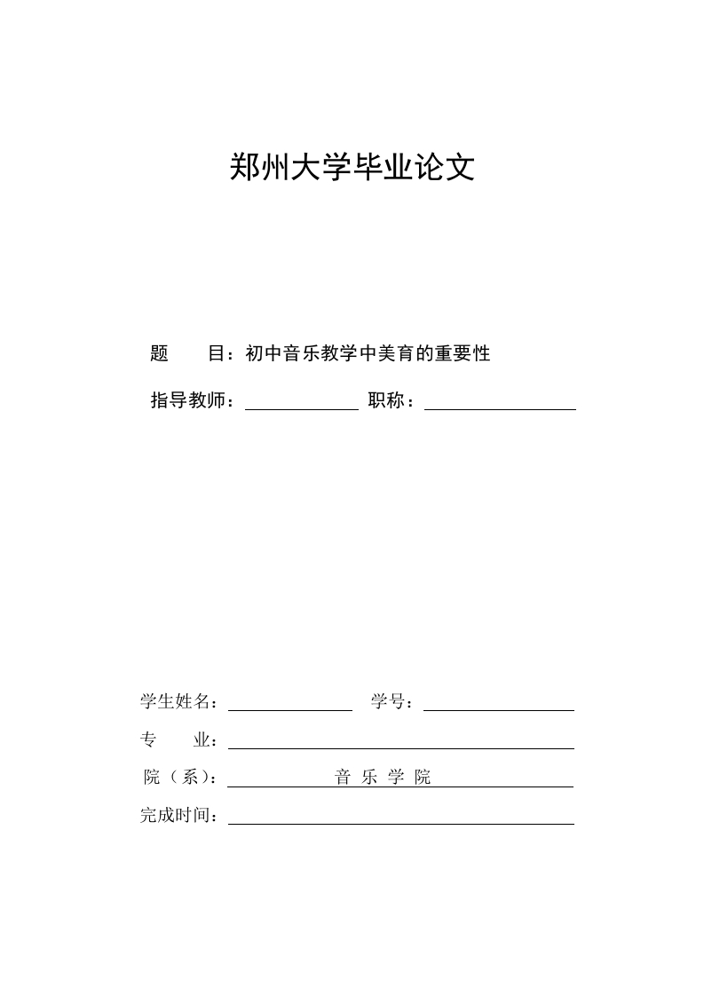 郑州大学毕业论文题目:初中音乐教学中美育的重要性指导教师:职称:学生姓名:学号:专音乐学院完成时间:郑重声明本人的学位论文《》是在导师的指导下独立撰写并完成的,没有剽窃、抄袭等违反学术道德、学术规范的侵权行为,凡涉及其它作者的观点和材料,均作了注释,若有不实,本人愿意承担由此产生的一切后果,特此郑重声明。论文作者(签名):年月日内容摘要随着新世纪的来临,在我国教育体系中美育已变成不可或缺的一部分,也作为基础素质教育的要求。作为审美教育的重要形式,音乐教育将学生的审美情感体验受到极大的丰富,使他们欣赏音乐审美的能力得到提升,极大的丰富生活品质。审美教育受到深化改革,学生的审美能力得到培养,将作为全部音乐教师共同承担的重要任务。美育的地位在现如今的基础教育教学中是无与伦比的。审美教育是一种课堂教育的重要方法,在音乐教学中也发挥着独特的作用。为了实现审美教育,在音乐教学过程中,将育人为主要目的,对音乐审美教育进行加强,以保证审美教育的成果。关键词:初中音乐教学审美教育融合