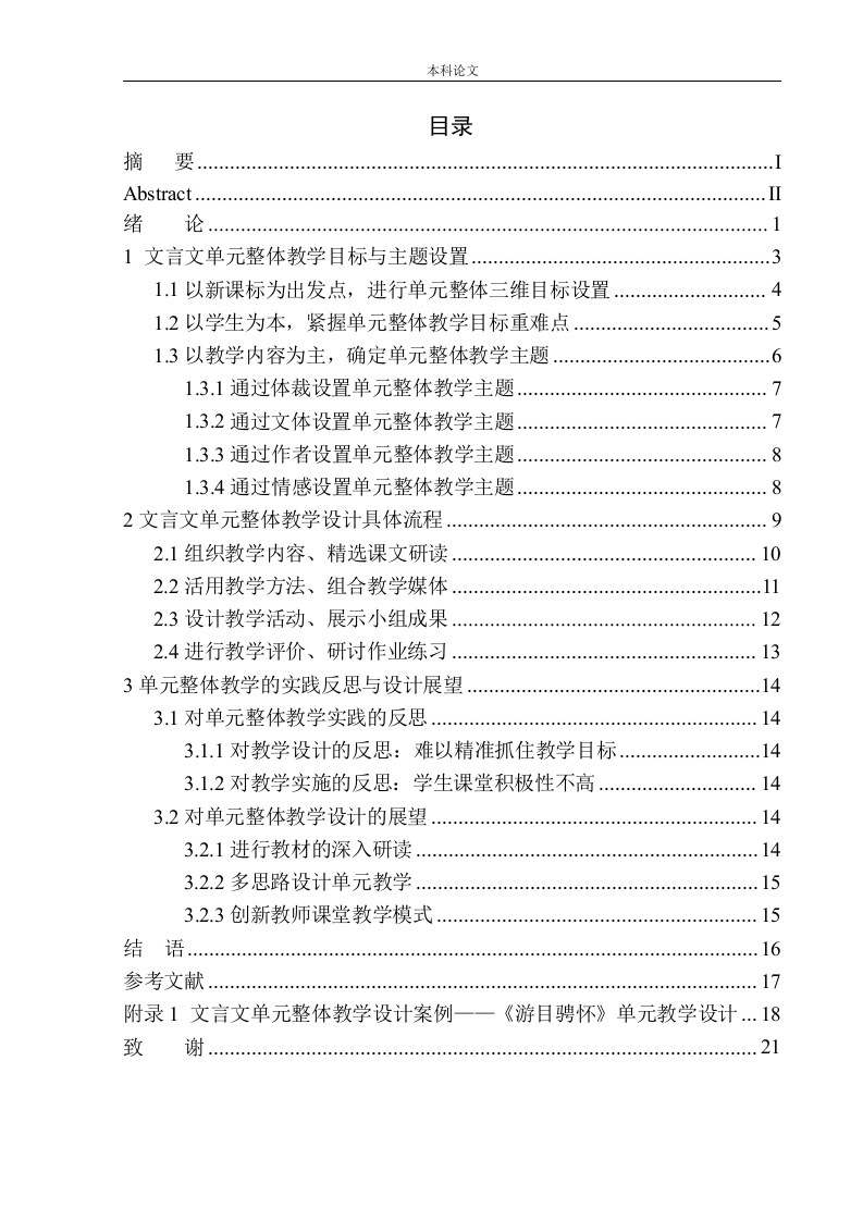 本科论文目录摘绪1文言文单元整体教学目标与主题设置1.1以新课标为出发点,进行单元整体三维目标设置…41.2以学生为本,紧握单元整体教学目标重难点1.3以教学内容为主,确定单元整体教学主题1.3.1通过体裁设置单元整体教学主题.71.3.2通过文体设置单元整体教学主题.1.3.3通过作者设置单元整体教学主题1.3.4通过情感设置单元整体教学主题2文言文单元整体教学设计具体流程92.1组织教学内容、精选课文研读102.2活用教学方法、组合教学媒体.…2.3设计教学活动、展示小组成果122.4进行教学评价、研讨作业练习…133单元整体教学的实践反思与设计展望.143.1对单元整体教学实践的反思.143.1.1对教学设计的反思:难以精准抓住教学目标.….143.1.2对教学实施的反思:学生课堂积极性不高…143.2对单元整体教学设计的展望.143.2.1进行教材的深入研读…3.2.2多思路设计单元教学….153.2.3创新教师课堂教学模式.…15结语…参考文献.…附录1文言文单元整体教学设计案例一一《游目骋怀》单元教学设计.18致谢本科论文摘要本文以统编本教材九年级上册第三单元为例,分析和探讨了初中语文文言文单元整体教学模式,对初中语文文言文单元整体教学进行教学设计,最后提供统编本九年级上册第三单元整体教学的具体课例,为初中语文单元整体教学实践提供帮助。本文第一部分绪论对文章主要概念以及学术史进行阐述,选题原因主要是19年统编本教材的全国普及以及单元整体教学法的风靡,选题意义是为教师教学设计提供理论和实践借鉴,减轻学生学习负担。国内外研究现状和发展趋势为单元整体教学设计提供理论依据。第二部分是提出教学目标设置的设计方案,从新课标、学生学情、教学内容方面给出教学目标设置的方法论。第三部分主要是阐述单元整体教学设计的具体流程,第一步是通过教学时间、专题以及课型的确定,组织好教学内容,第二步可以运用讲授法、讨论法等等教学方法,第三步是设计小组教学活动,第四步是通过教学反馈,进行教学评价。第四部分根据教学内容,对单元整体教学的设计和实施的过程提出反思和总结,并思考其对教师的挑战和要求。最后附录部分放上统编本九年级上册第三单元“游目骋怀”完整的单元整体教学设计案例。关键词:初中;文言文;单元整体教学本科论文AbstractIn this paper,in order to compile for universal use textbook grade nine topvolume unit 3 as an example,analyzes and discusses the junior middle schoolwritings in classical style of Chinese unit teaching mode,teaching designteaching of junior middle school Chinese writings in classical style unit,finallyprovides compile for universal use this grade nine top volume unit 3 overallteaching cases,the specific class for junior middle school Chinese unit teachingpractice to offer help.The first part of this paper is the introduction to the main concepts andacademic history of the article.The main reason for selecting the topic is thenationwide popularization of the unified textbook in the past 19 years and thepopularity of the overall unit teaching method.The second part is to put forwardthe design scheme,from the new curriculum standards,students learning andability,teaching content to give the teaching goal setting methodology.The thirdpart mainly explained the specific process unit whole teaching design,the firststep is determined by teaching time,project type and class,organize the teachingcontent,the second step is to use teaching method,teaching method,discussionmethod and so on the third step is to design team teaching activities,the fourthstep is to pass the teaching feedback,teaching evaluation.The fourth part,according to the content of teaching design,puts forward the thinking andsummary of the design and implementation process of the unit teaching as awhole,and thinks about the challenges and requirements to teachers.Theappendix part on compile for universal use this grade nine top volume unit 3"swim eye great scenes and let fancy free"complete unit teaching design case asa whole.Keywords:Junior high school;classical Chinese;Unit integrated teaching
