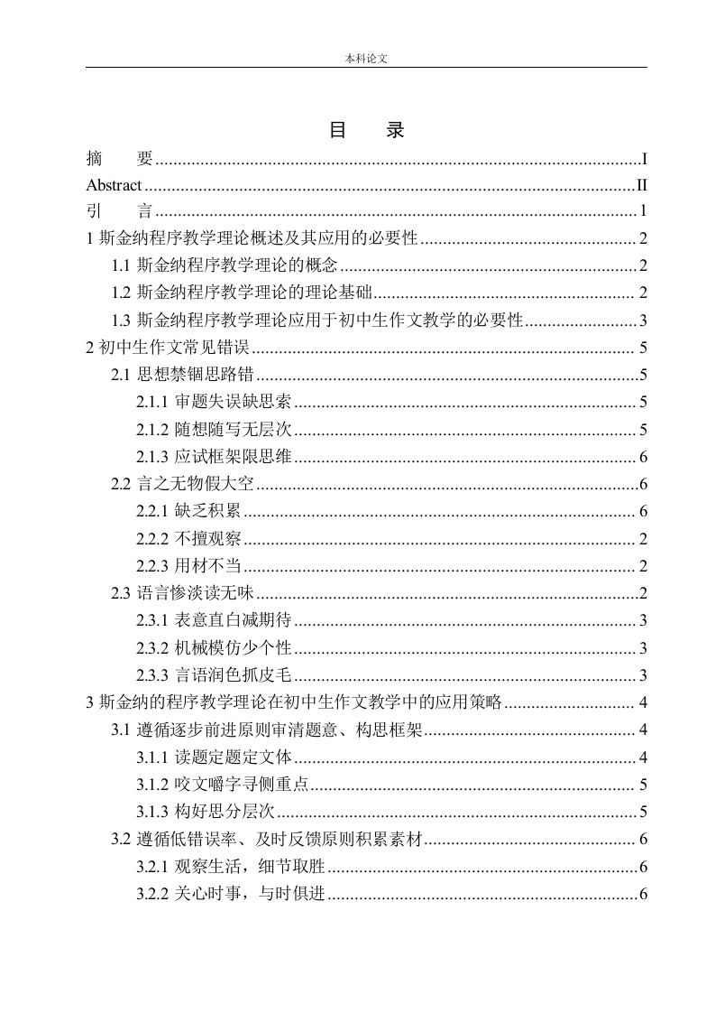 本科论文目录摘Abstract.…引言1斯金纳程序教学理论概述及其应用的必要性1.1斯金纳程序教学理论的概念21.2斯金纳程序教学理论的理论基础.21.3斯金纳程序教学理论应用于初中生作文教学的必要性…32初中生作文常见错误52.1思想禁锢思错.…2.1.1审题失误缺思索52.1.2随想随写无层次52.1.3应试框架限思维62.2言之无物假大空2.2.1缺乏积累…62.2.2不擅观察22.2.3用材不当22.3语言惨淡读无味22.3.1表意直白减期待…44444442.3.2机械模仿少个性32.3.3言语润色抓皮毛3斯金纳的程序教学理论在初中生作文教学中的应用策略43.1遵循逐步前进原则审清题意、构思框架3.1.1读题定题定文体.…43.1.2咬文嚼字寻侧重点…53.1.3构好思分层次.…3.2遵循低错误率、及时反馈原则积累素材63.2.1观察生活,细节取胜..3.2.2关心时事,与时俱进本科论文3.2.3坚持阅读,分类集锦3.3遵循及时强化、自定步调原则巧用手段润文字.73.3.1选定表达方式,制造语句波澜.73.3.2善用修辞技巧,凸显文字灵气3.3.3巧用表现手法,增添言语文采8结论9参考文献10致谢.12本科论文摘要写作能力与学生的表达能力、思维能力和创造力都息息相关,斯金纳的程序教学理论认为这种能力可通过有效训练得到。论文通过对程序教学理论的分析,讨论了作文教学常见错误,并通过五要素保障教学效果,从而提高学生写作能力,为作文教学提供新思路。用文献法收集相关信息,并将近几年中考作文题、初中生作文常见错误、教师作文教学常见问题作为研究资料以发现作文教学的应用策略。论文研究发现初中生在思路、内容、语言上易出现错误,这与老师的教学有不可分割的联系。学生思想禁锢思路出错是因为教师在教学时步子过大过快,学生写作时思路不清,操之过急,从而在题目、思路、层次上杂乱。学生的作文言之无物呈现假大空的状态是因为教师未将教学目标落到实处,教师让学生去积累素材却只停留在口头上,未能及时检查积累的成果。学生文章的语言惨淡是由于教师在言语润色上缺乏反馈,学生对语言修饰技巧运用不熟悉。在程序教学理论的指导下,如果教师调整教学方法,就能减少初中生在写作时思路出错、言之无物、语言寡淡情况的发生。关键词:程序教学理论:初中作文教学;应用策略