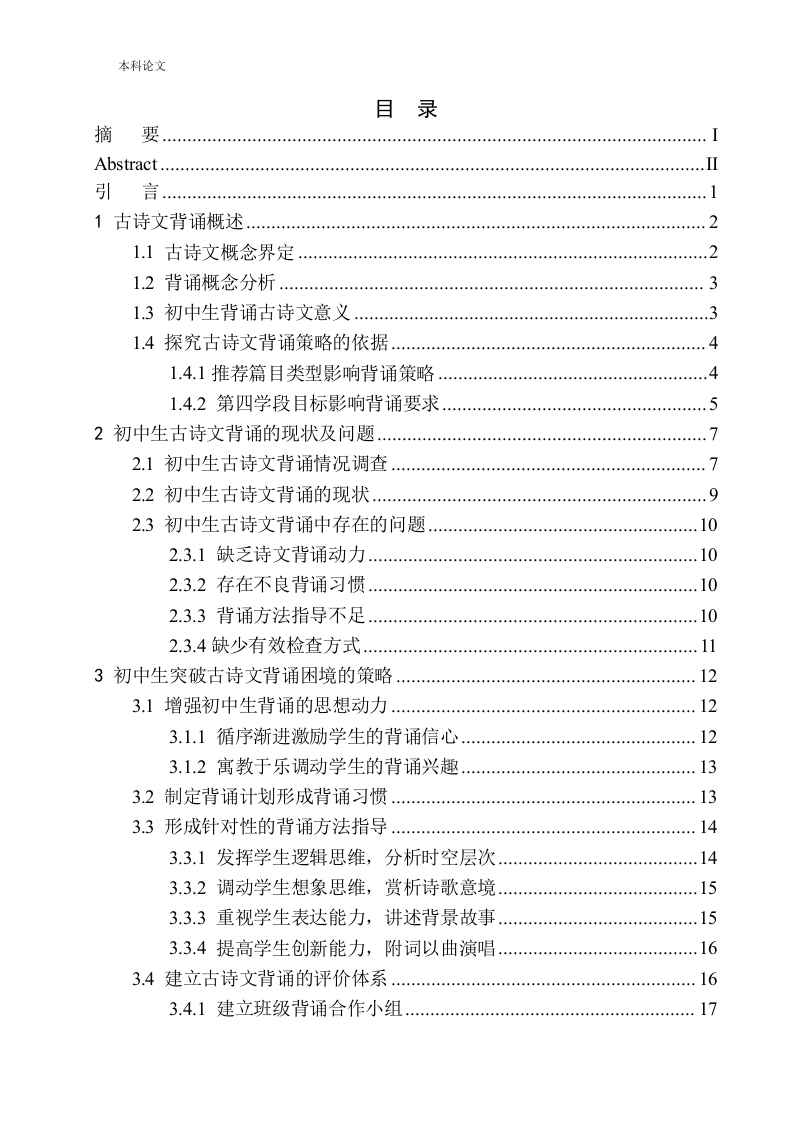 本科论文目录摘Abstract....1古诗文背诵概述1.1古诗文概念界定21.2背诵概念分析31.3初中生背诵古诗文意义31.4探究古诗文背诵策略的依据…41.4.1推荐篇目类型影响背诵策略,.41.4.2第四学段目标影响背诵要求52初中生古诗文背诵的现状及问题.2.1初中生古诗文背诵情况调查.…2.2初中生古诗文背诵的现状…2.3初中生古诗文背诵中存在的问题2.3.1缺乏诗文背诵动力….102.3.2存在不良背诵习惯..102.3.3背诵方法指导不足..…2.3.4缺少有效检查方式…3初中生突破古诗文背诵困境的策略.123.1增强初中生背诵的思想动力…123.1.1循序渐进激励学生的背诵信心.…123.1.2寓教于乐调动学生的背诵兴趣.…133.2制定背诵计划形成背诵习惯3.3形成针对性的背诵方法指导.…3.3.1发挥学生逻辑思维,分析时空层次.143.3.2调动学生想象思维,赏析诗歌意境533.3重视学生表达能力,讲述背景故事3.3.4提高学生创新能力,附词以曲演唱.163.4建立古诗文背诵的评价体系…163.4.1建立班级背诵合作小组17本科论文3.4.2完善背诵效果检查方式…17结18参考文献19附录1初中古代诗歌背诵推荐篇目类型汇总21附录2初中古代散文背诵推荐篇目类型汇总22附录3初中古诗文背诵现状调查问卷…23附录4初中古诗文背诵现状调查问卷数据统计表24致25本科论文摘要古诗文是中华文化中的瑰宝。学生背诵古诗文,不但对学生道德修养和价值观念形成具有重要意义,而且对提高学生审美情趣和欣赏品味有重要作用。背诵作为学习语言文字最古老的方法之一,首先可以帮助学生积累写作素材,其次还起到锻炼学生记忆力的效果。随着全社会对学习传统文化的重视,古诗文背诵在中高考占据更加重要的地位。但是目前初中生缺少古诗文背诵策略的指导,学生的古诗文背诵效果不理想,很难达到语文课程标准背诵优秀诗文80篇(段)的目标。本文结合课堂观察和问卷调查结果,找到初中生古诗文背诵的现状和背诵中存在的问题,提出具有针对性的解决策略,帮助学生走出古诗文背诵的困境。本文主要分为三个部分,第一部分主要是对古诗文背诵进行概述。第二个部分笔者通过结合实习学校的课堂观察记录和问卷调查结果,对初中生古诗文背诵过程中存在的问题进行了分析和归纳。第三部分为本文的重点部分,主要是针对学生在背诵中遇到的主要问题提出对应的解决策略。关键词:初中古诗文;背诵教学:背诵兴趣:背诵策略