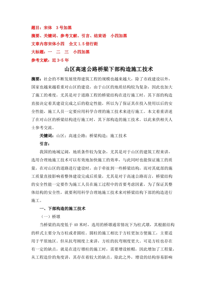 题目:宋体3号加黑摘要、关键词、参考文献、引言、结束语小四加黑文章内容宋体小四全文1.5倍行距大标题:一二三小四加黑参考文献:近3-5年山区高速公路桥梁下部构造施工技术摘要:社会的不断发展使得建筑工程的规模也越来越大,除了市政建设以外,国家也越来越看重对山区的建设,由于山区的地质结构较为复杂,因此也加大了施工的难度,尤其是对于道路工程的桥梁结构在进行施工时,其下部的构造直接决定着其建设完成之后的稳定性能,所以为了保证其在投入使用以后的安全性能,施工人员一定要应用科学合理的施工技术来进行施工。本文着重讲述了在对山区的桥梁结构进行施工时,其下部构造的施工技术。以此来供相关人士参考交流。关键词:山区;高速公路:桥梁构造:施工技术引言:我国的地域辽阔,地质条件较为复杂,尤其是对于山区的建筑工程来讲,选用合理地施工技术可以有效地加快施工的效率,与此同时也能保证施工的质量,在对山区的道路进行建设时,由于牵扯到一些桥梁结构,而对其底部的施工质量直接影响着整体建设完成后质量,尤其是对于高速公路而言,桥梁结构的安全性能一定要作为施工人员在施工过程中的首要考虑因素,为了保证其整体结构的安全性,就要利用科学合理地施工技术来对桥梁结构下部的构造进行施工。一、下部构造的施工技术(一)桥墩当桥梁的高度低于40米时,选用的桥墩通常情况下为柱式墩,其根据结构的样式主要分为方柱或者圆柱。圆柱的施工相比于方柱更加方便施工,主要适用于平原地区。但从抗弯刚度上来讲,方柱的抗弯刚度更大。可是方柱也存在有一定的缺点,就是在进行墩柱的施工时,需要增设桩帽,因此增加了工程量,从工程造价的角度讲,其存在着较大的缺点。除此之外,增设的结构容易影响到边坡的稳定性,所以在对具体的桥墩结构样式选择时,还应该根据地形以及其上部结构形式要求来选择出针对性的样式。(二)高墩在对高墩进行施工时,首先需要保证在施工过程中桥梁墩的稳定性。因此在具体的施工过程中,需要按照设计规范的要求来进行施工。《公路钢筋混凝土及预应力混凝土桥涵设计规范》(JTGD62-2004)中的条文明确提出。“当10/h>30时,构件将变成失稳破坏”上述不等式之中的10代表的是受压柱的长度。其具体的取值与多种因素有关,包括有上部构造的重量以及施工状态等。(三)下部构造形式的选择山区公路的路基形式主要分为两种,一种是整体式路基,另一种是分离式路基。为了提升对土地资源的利用率,减少施工过程中浪费,通常情况下均使用的是整体式路基,但对于一些中等或者更长的隧道形式在进行选择时,由于受到施工技术以及外界因素的限制,通常选择的是分离式路基。而对于绝大部分山区道路工程来讲,其均使用的是整体式路基。因此对于桥梁的下部构造形式,也就有两种形式,一种是整体式下构,另一种是分离式下构,在对其下部构造进行设计时,通常使用的分离式下构,即双幅四柱的形式。而对于高墩的长桥,设计人员在设计的过程中,为了有效落实环保政策,减少开挖量,此方式便不再适用,此时就需要选择整体式下构,即双幅两柱的形式,此不仅可以满足设计中对环保的要求,还可以节约施工的成本。其相较于双幅四柱的形式而言,在条件相同的情况下,有着诸多的优点,主要体现在下部构造中的横纵向刚度上,其均为双幅四柱模式的两倍。但运用整体式路基时,也应该考虑到在车辆行驶的过程中对扭矩的影响,因此在对梁进行设计时,应该注意帽梁的设置。在实际的桥梁建设过程中,无论是选择哪种方式,都应该结合所有的因素进行考虑,保证其能够在最大程度上满足施工的要求。(四)桥台在对桥台进行设计时,通常选择的桥台有三种形式,一是重力式U型台,二是肋板台,三是桩柱式台。但是在实际的工程中最为常用的是重力式U型台。其也有相关的规定,如《墩台与基础》中已经明确指出,选用该结构时,填土的范围主要为4米以上,但不能超过十米。在山区中建设桥梁时,要根据其对地形进行设计,因此设计人员在设计过程中可以将其合理的分阶设置国。而对于桩柱式桥台,因为其抗推刚度相对较小,因此为了保证其稳定性,应该设置在台背填土高度较低的地区。对于肋板台,其相较于桩柱式台适用范围更广泛,但是台背的填土高度也不能过高,通常情况下在设置时,对其高度控制在12米以内。山区的高速公路通常情况下纵向地形均过于陡峭,所以在对边坡设计时,不会设置成锥坡,此就加大了设置桩柱式以及肋板台的难度。除此之外,对于有些地质条件过差的地区,在进行桥台建设时,还需要对其基础进行处理。(五)基础在对山区的高速公路桥梁基础进行处理时,通常情况下有两种结构方式,一种是扩大基础,一种是桩基础。其各自有着适用的范围,扩大基础主要应用于地质情况良好的山区,并且同时选用的是分离式扩大基础。而对于桩基础,主要适用于地质条件较差的地区,在对桩基础进行施工时,具体的施工方法也主要有两种,一种是为挖孔桩,一种为钻进桩。但是对施工方法在选择时,也要结合实际的施工条件选择针对性的方法进行施工。对于挖孔桩,该工艺可以有效节省施工的成本,但是其受地质因素的影响较大。钻孔桩可用于地质较差的施工环境当中,但是其在施工时,工艺相对较为复杂,所以设计人员