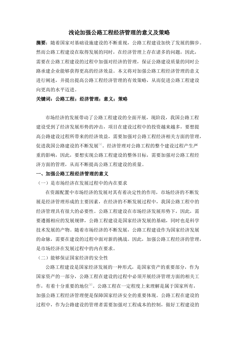浅论加强公路工程经济管理的意义及策略摘要:随着国家对基础设施建设的不断重视,公路工程建设加快了发展的脚步。然而公路工程建设在取得发展的同时,在经济管理上存在诸多的问题,因此,需要在公路工程建设的过程中加强对经济的管理,保证公路建设质量的同时公路承建企业能够获得更高的经济效益。本文将对加强公路工程经济管理的意义进行阐述,并提出提高公路工程经济管理的有效策略,从而促进公路工程建设向更高的水平迈进。市场经济的发展带动了公路工程建设的全面开展,现阶段,我国公路工程建设受到了经济发展形势的冲击,项目在建设过程中的投资越来越多,要想提高公路建设过程所带来的经济效益,需要加强对公路工程经济相关方面的管理,促进我国公路建设的不断发展。经济管理对公路工程的整个建设过程产生严重的影响,因此,要想实现公路工程建设的整体目标,需要加强对公路工程经济方面的管理,从而不断提高公路工程建设的质量。一、加强公路工程经济管理的意义(一)是市场经济在发展过程中的内在要求在资源配置中市场经济的发展对其有着决定性的作用,市场经济的不断发展是经济管理形成的主要因素,在经济的不断发展过程中,我国公路工程中的经济管理具有很大的必要性。公路工程建设在市场经济发展形势下,因此,需要遵循相应的发展规律,公路工程建设是国家经济发展的基础,同时也是科学技术发展的产物。随着市场经济的不断发展,公路工程建设作为国家经济发展的命脉,需要在建设的过程中面对新的挑战。因此,加强公路工程经济的管理,是市场经济在发展过程中的内在要求。(二)能够保证国家经济的安全性公路工程建设是国家经济发展的一种形式,是国家资产的重要部分,作为国家资产的一部分,公路工程在建设的过程中必须开展经济管理方面的相关工作,有着十分重要的地位。公路工程在一定程度上来理解是属于国家所有,加强公路工程经济管理便是保障国家经济安全的重要体现。公路工程在建设的过程中,作为公路建设的管理者需要加强对工程成本的控制,做好工程建设的相关预算,对公路工程进行有效的经济管理,保证整个公路工程建设的安全性,从而在提高公路工程质量的同时,能够有效增强国家的经济效益,保证国家经济的安全性。(三)是公路工程在质量控制方面的需要公路工程属于国家基础设施的建设,具有很强的公益性特征。公路工程的建设是为社会服务的,从某种层度上来理解是公共产品,是一种非市场竞争性产品,给人们的出行提供了交通上的便利。在公路工程建设过程中,有效的经济管理能够保证工程质量上得到提升,经济管理是指在公路建设过程中对施工材料进行质量上的把关,做好成本上的控制,同时对整个施工过程进行监督,确保公路工程的建设质量。因此,我国公路在质量上的相关要求,需要在公路工程建设过程中对经济进行管理,能够有效提高人们日常出行交通上的便利。二、加强公路工程经济管理的有效策略(一)树立正确的公路工程经济管理理念由于对经济管理理念缺乏正确、充分的认识,造成我国在公路工程建设的过程中经济管理的总体水平较低,在市场竞争中处于劣势地位。要想提高我国公路工程建设的市场竞争力,需要树立正确的公路工程经济管理理念。首先,作为公路工程建设的管理阶层,需要率先进行经济管理观念上的转变,可以采取培训的方式提高管理者的经济管理水平,从而在公路工程建设过程中能够强化管理意识,做好日常管理方面的工作,逐步提高公路建设的质量。此外,作为管理者需要对工程建设过程中的成本进行有效的核算。然后,在整个公路工程施工过程中,将经济管理的观念推广到整个工程建设团队中去,使得施工人员经济管理观念能够得到整体性的提升。最后,在公路工程建设过程中,需要清晰认识到施工人员与经济管理之间存在的联系,对施工人员实行责任制,提高施工人员参与经济管理的积极性,从而不断提升公路经济管理的水平。(二)完善公路经济管理的相关工作材料管理、监督管理以及成本预算是公路工程经济管理的主要内容,要想加强我国公路工程经济管理的水平,需要不断完普经济管理的相关工作。在公路工程建设中需要做好对成本的预算,做好相关的管理工作,在确保公路质量的同时,尽量降低成本的输出同。同时,公路工程承建企业需要做好对材料管理,在进行材料的选择时需要结合公路建设的特点,将材料的价格和工程预算成本进行比较,尽量缩小二者之间存在的差距。此外,公路工程建设在施工现场会存在众多的机械设备,因此,在公路施工阶段,相关管理人员需要做好对设备的管理工作。(三)建立健全公路经济管理体制建立健全公路经济管理体制是提高我国公路工程经济管理水平的重要前提,采用科学的经济管理方法,能够有效提升公路工程经济管理的整体水平。在公路工程施工的过程中,任何环节都需要实施完整的经济管理体制,施工人员在日常的工作中从自身做起,严把公路工程建设质量关,减少施工成本的浪费,保证公路建设的质量。结语:综上所述,随着我国市场经济的快速发展,经济管理在各行各业的发展过程中引起了足够的重视。市场的发展给我国公路工程的建设带来了巨大的冲击,在工程建设的过程中加强经济管理方面的工作有着