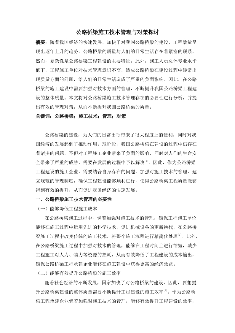 公路桥梁施工技术管理与对策探讨摘要:随着我国经济的快速发展,加快了对我国公路桥梁的建设,工程数量呈现出逐年上升的趋势。公路桥梁的质量与人们的日常生活存在着紧密的联系,然而,复杂性是公路桥梁工程建设的主要特征,此外,施工人员总体专业水平低下,工程施工单位对技术管理意识不高,造成公路桥梁在建设过程中经常出现质量方面的问题,给人们的日常生活造成了严重的负面影响。因此,在公路桥梁的施工建设中需要加强对技术方面的管理,不断提升我国公路桥梁工程建设的整体质量。本文将对公路桥梁施工技术管理存在的必要性进行分析,并提出有效的管理对策,从而不断提升我国公路桥梁的质量。公路桥梁的建设,为人们的日常出行带来了很大程度上的便利,同时对我国经济的发展起到了推动作用。现阶段,我国公路桥梁在建设的过程中仍存在着诸多的问题,不但对工程施工企业带来了负面的影响,同时对人们的生命安全带来了严重的威胁,需要在发展的过程中予以解决。因此,作为公路桥梁工程建设的施工企业,需要结合自身存在的问题,加强对施工技术的管理,建立规范的管理制度,确保工程建设能够顺利进行,使得公路桥梁工程质量能够得到有效的提升,从而促进我国经济的快速发展。一、公路桥粱施工技术管理的必要性(一)能够降低工程施工成本在公路桥梁施工过程中,倘若加强对施工技术的管理,确保工程施工单位能够在施工过程中运用先进的科学技术,促进机械设备的更新换代,在公路桥梁施工过程中改变传统的施工技术,将整个施工流程进行精简化处理。此外,在公路桥梁施工过程中加强对技术的管理,能够在工程时间上进行缩短,减少工程施工对人力、物力等资源的损耗,从而有效降低了工程建设的成本输出,确保公路桥梁工程承建企业能够在施工建设中获得更高的经济效益。(二)能够有效提升公路桥梁的施工效率随着社会经济的不断发展,国家加快了对公路桥梁的建设,因此,要想提升公路桥梁建设的整体质量需要不断提升工程建设的施工效率。作为公路桥梁工程承建企业倘若加强对施工技术的管理,能够有效提升工程建设的效率,从而保证公路桥梁在有效的时间内高质量完成。此外,在施工的过程中在一定成本的控制前提下引进先进的设备,加强对施工人员的技术培训,提升公路桥梁工程建设的整体效率,推动我国城市化发展的步伐。(三)能够保证公路桥梁工程的质量作为公路桥梁工程承建企业,加强对施工技术管理能够从根本上保证公路桥梁工程的质量。在我国公路桥梁工程建设的现阶段,公路桥梁经常出现质量方面的问题,产生的问题原因有多种,其中,施工人员在技术上达不到相关的标准是工程出现质量问题的重要原因,施工人员技术水平低,使得公路桥粱经常出现跳车的现象,严重影响了交通出行。不断提升对施工技术的管理,能够有效提升公路桥梁的建设质量,避免由于公路本身的质量而造成交通事故的发生,因此,公路桥梁加强对施工技术的管理具有很高的必要性。二、提高公路桥梁施工技术管理的有效措施(一)做好对公路桥梁施工技术的准备工作公路桥梁要想取得良好的效果,需要做好公路桥梁施工技术的前期准备工作,作为施工企业在进行工程建设的前期阶段,需要对工程建设的相关文件进行仔细的审核,对施工周边的整体环境做个全面的了解,做好对施工成本的预估算,将工程施工成本控制在一定的范围之内,制定科学合理的施工方案。与此同时,作为公路桥梁设计者,在前期阶段,需要对自身的设计图稿进行检查,确保图稿在实际施工中的可实施性。此外,作为施工人员在施工的过程中需要严格按照设计图稿的要求来进行工程建设,倘若在建设的过程中发现工程存在质量问题,需要报告给相关管理部门,从根本上提升公路桥梁工程质量,避免在施工的过程中出现人员上的伤亡,保证了施工人员的安全。(二)采用先进的公路桥梁施工技术在我国发展现阶段,科学技术随着经济的不断发展得到了很大程度上的提升,在公路桥梁施工建设过程中不断引进先进的技术,对提高公路桥梁工程的质量产生了很大的帮助。作为公路桥梁工程承建企业,在施工中采用新技术的同时需要保证工程施工的科学性,针对技术不成熟的情况,需要进行反复的试验,确保工程质量能够达到国家相关的标准。此外,施工人员在工程建设过程中遇到新的问题,需要保持冷静的心理,采取科学的态度合理解决施工建设过程中存在的问题。同时,还需要保证公路桥梁本身的地基高度,采用科学的计算方法,确定公路桥梁建设的施工方案,加强对公路桥梁施工技术的管理,确保工程质量能够得到有效的提升。(三)加强对公路桥梁施工技术安全方面的管理安全性是公路桥梁施工过程中需要注意的重点问题,安全性直接影响到公路桥梁工程能否正常施工,同时对工程质量也有着重要的影响。因此,作为工程承建企业需要在施工的过程中加强对公路桥粱施工技术安全方面的管理,加强对施工人员的安全宣教,提高施工人员的安全意识,确保工程施工中能够规范化进行。此外,加强对施工人员综合素质的提升,在施工的过程中真正实现安全性与质量并存的局面,从而推动我国公路桥梁工程施工向更高的水平方向发展。(四)做好对公路桥梁质量的监督和检查作为公路桥梁工程承建企
