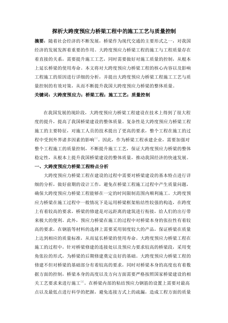 探析大跨度预应力桥梁工程中的施工工艺与质量控制摘要:随着社会经济的不断发展,桥梁作为现代交通的主要形式之一,对我国经济的发展发挥着重要的作用。大跨度预应力桥梁工程的施工与工程质量存在着直接的关系,需要提升施工工艺,同时需要做好对施工质量的控制,从根本上延长桥梁的使用寿命。本文将对大跨度预应力桥梁工程的核心内容以及影响工程施工的原因进行详细的分析,并提出大跨度预应力桥梁工程施工工艺与质量控制的有效对策,从而不断提升我国大跨度预应力桥梁的整体质量。关键词:大跨度预应力;桥粱工程;施工工艺;质量控制在我国发展的现阶段,大跨度预应力桥梁工程建设在技术上得到了很大程度的提升,提高了我国桥梁建设的整体质量。复杂性是大跨度预应力桥梁工程施工的主要特征,对施工人员的技术提出了更高的要求,整个工程在施工的过程中受到外界诸多因素的影响。因此,作为桥梁工程承建企业,需要加强对整个工程施工的质量控制,不断提升施工工艺,保证大跨度预应力桥梁的整体稳定性,从根本上提升我国桥粱建设的整体质量,推动我国经济的快速发展。一、大跨度预应力桥粱工程特点分析大跨度预应力桥梁工程在建设的过程中需要对桥梁建设的基本特点进行详细的分析,做好前期的设计工作,避免在桥梁工程施工过程中产生质量问题,确保大跨度预应力桥梁工程能够在一定的时间限制范围内顺利施工。大跨度预应力桥梁在施工过程中一般情况下是运用桥梁框架粘结性较强的构造,在跨度上有着较高的要求,桥梁的修建是对远距离的建筑进行衔接,给人们的出行带来极大的便利。此外,预应力桥梁在施工的过程中对桥梁本身的张拉性有着较高的要求,在钢筋等材料的选择上需要采用韧度较大的产品,保证桥梁在质量上达到相应的质量标准,从而延长桥梁的使用寿命。大跨度预应力桥梁工程在施工的过程中,针对桥梁修建的连接处以及预应力要求较高的桥梁段,采用变角张拉的形式,为桥梁的后期修建奠定良好的基础。大跨度预应力桥梁工程的修建不但对桥梁的基础部分有着较高的要求,同时对桥梁本身的高度也有着数据方面的控制,桥梁本身的高度以及方向方面需要严格按照国家桥梁建设的相关工艺要求来进行施工。在桥梁内部的粘结预应力钢筋的设置上需要对最高点以及最低点进行科学的把握,避免连接方式上的疏漏,造成工程方面的质量问题,不断提升我国大跨度预应力桥梁工程的整体质量,为人们的正常出行带来便利。因此,在大跨度预应力桥梁工程建设过程中,需要结合桥梁工程本身的设计要求,进行工程的施工设计,使得桥梁在质量上得到不断的提升。如图1,桥梁结构设计规范图。图1桥梁结构设计规范图桥梁分类多孔跨径总长L(m)单孔跨径L。(m)小桥8≤L≤305≤L。<20中桥30