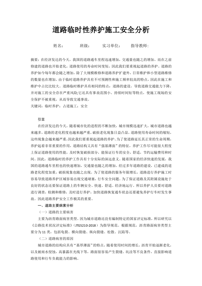 道路临时性养护施工安全分析姓名:班级:实习单位:指导教师:摘要:在经济发达的今天,我国的道路通车里程迅速增加,交通量也随之的增加。而在之前修建的道路也开始老化,道路使用的寿命时间变短,因此我们要重视起道路的养护。道路的养护如今每年都会随之增加,除了大规模维修和道路养护扩建外,日常维护和小型道路维修的数量也在增加。由于临时道路养护具有不可预测性和施工频率较高的特点,因此在施工和维护中占比比较大。道路临时维护具有相同的特点:道路的建设,导致道路交通能力下降,并对施工的安全存在严重风险:它还具有事故范围小、持续时间短等特点,使施工现场的安全保护不被重视,从而导致交通事故。关键词:临时养护:占道施工:安全引言在经济发达的今天,随着城市化的进程的不断加快,城市规模迅速扩大,城市道路也越来越多,道路的老化程度也越来越严重,破损老化现象日益凸显,道路使用寿命时间的缩短,这些现象会越来越严重,因此我们要重视起道路的养护。为了使道路延长其正常的生命周期,养护起着非常重要的作用,道路结构又具有“强基薄面”的特征,养护工作尽可能很大程度上保证道路使用的性能,及时恢复破损部分,能保证行车的安全,舒适,节约运输费用和时间。因此,道路临时的养护工作具有十分实际的深远意义。随着国家的经济快速的发展,我国的道路通车里程也的快速增加,交通量也随之的增加。经过多年道路的建设,己建成的道路老化程度加重,破损现象也随之出现。为了使道路的服务年限增长,道路进行养护施工时容易导致道路养护区域容易出现交通堵塞,行车安全问题。为了保证道路及其附属设施处于良好的状态还要保证道路上的车辆安全、快速、舒适、经济地运行。所以养护人员要对道路进行调查,检测和维修,及时进行养护,加快道路恢复通车状态还要避免养护行车时发生事故。因此道路养护安全工作极其的重要。一、道路主要病害分析(一)道路的主要病害主要为沥青路面病害类型。因为城市道路还没有编制特定的国家评定标准,所以研究以《公路技术状况评定标准》(TG5210-2018)为指导规范。根据规范,沥青路面病害类型主要分为11类,包括龟裂、横向裂缝、纵向裂缝、松散、沉陷等。(二)道路病害的原因城市道路的结构应具有“基厚薄面”的特点,随着使用时间的增长,沥青开始逐渐老化,以及被雨水侵蚀,高暴露在光线下等,路面很容易产生裂缝、坑注等不良条件,直接影响道路使用和行车负载能力的影响。(1)裂缝类道路上道路裂缝的出现主要是由于路面的温度和沥青混凝土路面材料的抗裂性,例如,当道路铺设沥青混凝土时,在施工过程中有两个连接位置没有得到适当的处理,这将导致在行驶时受力影响的路面开裂。(2)变形类变形类又分为沉陷、车辙和波浪,拥包等。沉陷是因为路基路面产生竖向的变形从而导致路面的下沉的现象。通常情况有三种:1.均匀沉降:这是因为在道路上行驶时和在自然因素的情况下,是密实和稳定的,这会导致沉降,通常不会对道路造成损坏。2.不均匀沉降:这是因为道路不均匀地压碎,不够密实,也是由于道路在行驶时造成的水蚀和变形造成的。3.部分沉降:这是因为道路施工过程中的部分填充不够密集,或者因为平台有凹槽,树坑等,被水侵蚀时就会减少。拥包是沿行车方向或横向出现局部隆起。波浪形成是因为是夏天天气太过炎热,从而使沥青路面变软,汽车制动时的推动,在下一个汽车制动时处于一个低注然后车轮进一步加强了这个趋势,最后路面就形成了波浪形。(3)坑槽类坑槽指的是在行车时,道路路面骨料的局部脱落从而产生的坑洼,这是沥青路面常见病害,影响行车安全,舒适和路面路貌。二、灌浆法在道路养护中的运用(一)灌浆法技术特点(1)防渗:可以降低材料的渗透性,减少渗流量,提高抗渗能力,降低孔隙压力:(2)堵漏:可以封填孔洞,达到堵截流水的特点:(3)加固:提高岩土的力学强度和硬度,使混凝土结构得以维持和加固。(二)灌浆法技术要求在灌浆之前,材料必须适当混合,包括水泥、粘土、混合砂和化学聚合物。不同的材料根据一定比例合理混合。此外,在配置灌浆材料时,水泥灰还可用于降低灌浆成本并提高可塑性。一旦灌浆材料的配置完成,必须选择施工段进行测试施工,以测试灌浆材料的性能。根据实际沉降情况,选择合理的灌浆位置,特别是在裂缝严重的,适当增加灌浆材料在水泥浆施工过程中,必须确保灌浆水平饱和,以确保泥浆可以完全填满地基。在灌浆过程中,必须不断计算注浆量,并且必须根据项目的进度和项目的要素来确定灌浆情况。还需要控制灌浆压力。对于工程效果,最重要的影响是灌浆压力。一般情况下,灌浆压力应控制在0.3MPa~0.5MPa。如果遇到特殊情况,必须调整灌浆压力。灌浆施工过程首先在裂缝和密封处钻孔,然后搅拌灌浆材料,然后填充灌浆过程并等待悬浮液固化,最后密封灌浆口。在建造灌浆时,必须有效实施每个环节,并采取有效措施保证灌浆施工质量,确保每个环节的顺利连接。(三)灌浆法技术要点在施工中,在用灌浆法加固时,必须合理设计注浆材料的比例,并且必须严格控制灌浆材料的质量,以确保灌浆和道路工程的质量能够达到所需的质量标准。一般来说,水灰比为0.5~0.53,煤灰与水泥的比例为1:4。但因为地理环境的差异,水泥煤灰的强