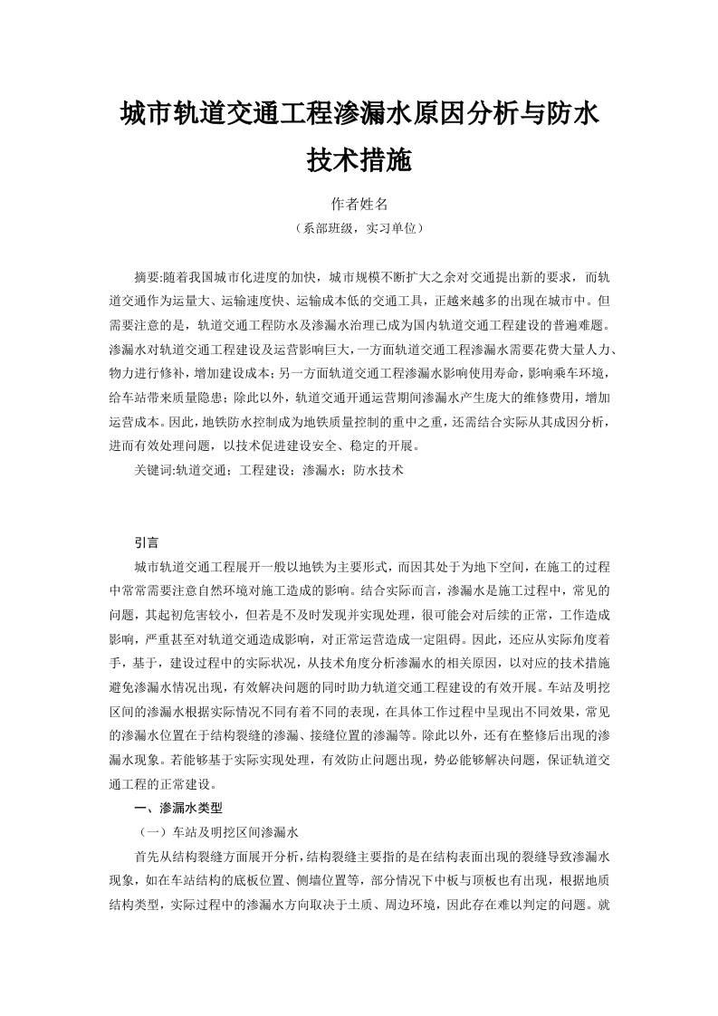 城市轨道交通工程渗漏水原因分析与防水技术措施作者姓名(系部班级,实习单位)摘要:随着我国城市化进度的加快,城市规模不断扩大之余对交通提出新的要求,而轨道交通作为运量大、运输速度快、运输成本低的交通工具,正越来越多的出现在城市中。但需要注意的是,轨道交通工程防水及渗漏水治理已成为国内轨道交通工程建设的普遍难题。渗漏水对轨道交通工程建设及运营影响巨大,一方面轨道交通工程渗漏水需要花费大量人力、物力进行修补,增加建设成本:另一方面轨道交通工程渗漏水影响使用寿命,影响乘车环境,给车站带来质量隐患:除此以外,轨道交通开通运营期间渗漏水产生庞大的维修费用,增加运营成本。因此,地铁防水控制成为地铁质量控制的重中之重,还需结合实际从其成因分析,进而有效处理问题,以技术促进建设安全、稳定的开展。关键词:轨道交通:工程建设:渗漏水:防水技术引言城市轨道交通工程展开一般以地铁为主要形式,而因其处于为地下空间,在施工的过程中常常需要注意自然环境对施工造成的影响。结合实际而言,渗漏水是施工过程中,常见的问题,其起初危害较小,但若是不及时发现并实现处理,很可能会对后续的正常,工作造成影响,严重甚至对轨道交通造成影响,对正常运营造成一定阻碍。因此,还应从实际角度着手,基于,建设过程中的实际状况,从技术角度分析渗漏水的相关原因,以对应的技术措施避免渗漏水情况出现,有效解决问题的同时助力轨道交通工程建设的有效开展。车站及明挖区间的渗漏水根据实际情况不同有着不同的表现,在具体工作过程中呈现出不同效果,常见的渗漏水位置在于结构裂缝的渗漏、接缝位置的渗漏等。除此以外,还有在整修后出现的渗漏水现象。若能够基于实际实现处理,有效防止问题出现,势必能够解决问题,保证轨道交通工程的正常建设。一、渗漏水类型(一)车站及明挖区间渗漏水首先从结构裂缝方面展开分析,结构裂缝主要指的是在结构表面出现的裂缝导致渗漏水现象,如在车站结构的底板位置、侧墙位置等,部分情况下中板与顶板也有出现,根据地质结构类型,实际过程中的渗漏水方向取决于土质、周边环境,因此存在难以判定的问题。就具体情况而言,在渗漏水现象出现时,一般而言裂缝均呈现出竖向裂缝的情况,在两侧出现的同时从两侧的腋角位置开始渗水、漏水,随着情况严重程度向施工位置的顶板方向不断延伸,形成一个区域。施工过程中能够发现,这种渗漏水情况多出现在拆模完毕后的一到两个月内,渗漏水量一般较低。其次是接缝位置的渗漏,主要是施工缝位置、变形缝位置的漏水,在施工过程中有一定几率由于施工顺序先后或是前期完成、后续施工过程中出现震动等原因导致裂缝出现,漏水问题逐渐严重。最后需要注意的是,在车站及明挖区间出现的渗漏水情况常常较为隐蔽,即便修整好后仍然可能出现渗水问题,主要表现在漏水位置在1-2个月内可能会渗漏,在外表上呈现出渗水位置出现湿渍、滴漏的特点。(二)盾构区间渗漏水盾构区间渗漏水状况的出现与盾构机施工的关联不大,一般在施工结束后出现渗漏水的情况,这种情况与相关设备设施并未有效展开存在一定关联,具体分为管片自身情况导致问题出现、管片接缝不严实导致问题出现、联络通道并未紧密相连导致问题出现。首先从管片自身原因展开分析,此类问题的表现多在于裂缝方面的渗漏,也有因为螺栓导致的渗漏,如螺栓孔渗漏水便会出现滴水的情况。从渗漏位置的形状来看,一般是窄小的裂缝,从中渗水或是直接滴落在地面,分布并不均匀,因此需要尤为注意才能发现。螺栓孔渗漏水则是螺栓孔存在孔隙,水随着螺栓孔渗漏,多以滴漏的形式出现。其次是管片接缝的渗漏水,这种情况的主要原因在于管片之间的接合不严密导致液体滴漏、渗水,具体情况取决于水量的大小,最常见的渗漏情况是渗漏出水渍,沿着管片接缝出现,相对于管片自身原因造成的渗漏水而言更容易被发现,也更容易得到解决。最后是联络通道的渗漏水,这种渗漏水的情况是轨道交通建设过程中最常见的情况,也是相对而言能够被允许、方便解决的渗漏水情况。就实际而言,滴漏与线漏都存在于实际状况中,相对来说线漏更普遍一些,渗水的主要位置在于联络通道与钢管片的接缝区域,沿着接缝出现线漏。部分情况下也有联络通道结构导致的渗漏水问题,即联络通道本身的结构存在问题,但这种情况较少(三)其他部位渗漏水其他部位渗漏水主要存在于离壁沟积水导致的渗水、洞门位置产生的渗漏现象。首先从离壁沟积水导致的渗漏水展开分析,这种渗漏水现象,的出现根本在于离壁沟内存在积水,而存在积水则说明排水不畅,因此,离壁沟的排水问题是导致此类渗漏水情况出现的根本。举例而言,若是离壁沟,的排水情况欠佳,那么一段时间之后就必然会出现渗漏的现象。就渗漏水的表现形式而言,一般是当水滴落在下一层时会被发现,即离壁沟中的积水较多、一部分水溢出结构后顺着地砖出现渗漏,渗漏至下一层时便会出现水滴落在站台或是相关空间中的情况。另一种其他部分的渗漏水情况是洞门处的渗水,这种区域的渗漏水现象体现为渗水,是接缝问题导致的渗水,一般宽度不高但长度偏长,需要切实找到具体位置以确定渗水点,避免渗漏水问题影向后续