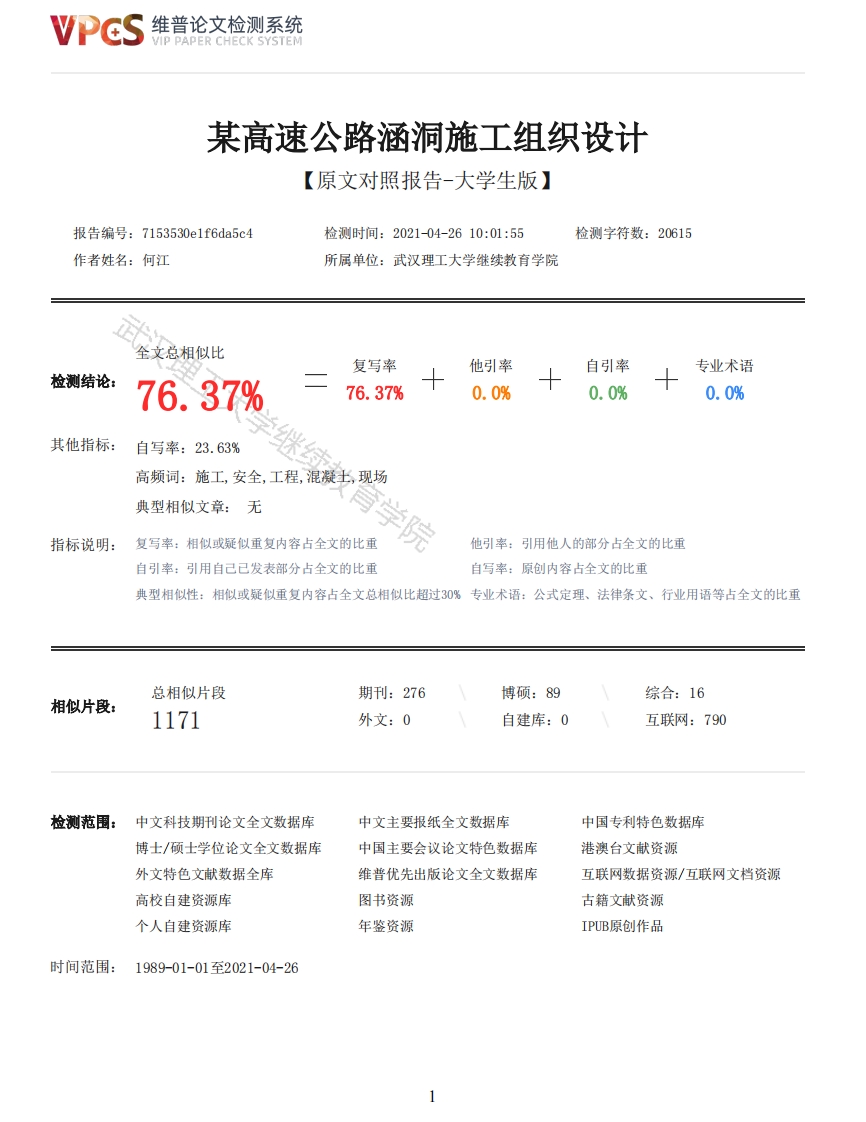 维普论文检测系统VIP PAPER CHECK SYSTEM某高速公路涵洞施工组织设计【原文对照报告-大学生版】报告编号:7153530e1f6da5c4检测时间:2021-04-2610:01:55检测字符数:20615作者姓名:何江所属单位:武汉理工大学继续教育学院全文总相似比复写率他引率自引率专业术语检测结论:76.37%76.37%0.0%0.0%0.0%其他指标:自写率:23.63%高频词:施工,安全,工程,混凝土,现场典型相似文章:无指标说明:复写率:相似或疑似重复内容占全文的比重院他引率:引用他人的部分占全文的比重自引率:引用自己已发表部分占全文的比重自写率:原创内容占全文的比重典型相似性:相似或疑似重复内容占全文总相似比超过30%专业术语:公式定理、法律条文、行业用语等占全文的比重总相似片段期刊:276博硕:89综合:16相似片段:1171外文:0自建库:0互联网:790检测范围:中文科技期刊论文全文数据库中文主要报纸全文数据库中国专利特色数据库博士/硕士学位论文全文数据库中国主要会议论文特色数据库港澳台文献资源外文特色文献数据全库维普优先出版论文全文数据库互联网数据资源/互联网文档资源高校自建资源库图书资源古籍文献资源个人自建资源库年鉴资源IPUB原创作品时间范围:1989-01-01至2021-04-26维普论文检测系统VIP PAPER CHECK SYSTEM原文对照颜色标注说明:■自写片段■复写片段(相似或疑似重复)口引用片段(引用)■专业术语(公式定理、法律条文、行业用语等)武汉理工大学毕业设计(论文)某高速公路涵洞施工组织设计产学习中心(函授站)专业年级层次学生姓名续教育学院云南函授站土木工程201916842何江导师姓名黎杰学位论文原创性声明本人郑重声明:所呈交的论文是本人在导师的指导下独立进行研究所取得的研究成果。除了文中特别加以标注引用的内容外,本论文不包括任何其他个人或集体已经发表或撰写的成果作品。本人完全意识到本声明的法律后果由本人承担。作者签名:何江2021年4月22日学位论文版权使用授权书本学位论文作者完全了解学校有关保障、使用学位论文的规定,同意学校保留并向有关学位论文管理部门或机构送交论文的复印件和电子版,允许论文被查阅和借阅。本人授权省级优秀学士论文评选机构将本学位论文的全部或部分内容编入有关数据进行检索,可以采用影印、缩印或扫描等复制手段保存和汇编本学位论文。本学位论文属于1、保密口,在年解密后适用本授权书2、不保密口√。(请在以上相应方框内打“√”)作者签名:何江2021年4月22日导师签名:年月日(注:此页内容装订在论文扉页)摘要当前涵洞在实际施工过程中,往往结构稳定,性能好,能够满足高速公路建设的需要,在施工过程中也得到较为广泛的普及。对此,提高钢筋盖板涵施工的质量就变得尤为重要。在施工过程中,需要加强各个环节的质量控制,从而保障高速公路的畅通运行。本文将会针对实际施工过程中所遇到的不确定问题进行分析探讨,并且提出自己的见解,能够为以后的高速公路工程钢筋盖板涵工程施工提供宝贵的参考。对两种情况进行了比较,所得结果对于涵洞施工具有重要的指导意义。论文主要研究了涵洞进度、质量、涵洞施工方法及技术措施。2维普论文检测系统VIP PAPER CHECK SYSTEM研究结果表明:涵洞施工精细化管理,工程是按照预防为主、先导试点的原则,在分项工程中选择第一个施工项目作为首件工程,并将工程中的每一个工序作为首件工序,对每一道工序制定作业指导书和施工工艺方案,按照严格程序进行策划、修正、实施、验证总结,成熟后进行推广实施。通过全面推行工程认可制,以工程样板示范,引领后续同类工程的标准化施工,以指导后续工程批量生产,预防和纠正后续批量生产中可能产生的质量问题,有效减少返工损失,缩短施工工期。本文的特色:涵洞施工方法及技术措施。关键词:高速公路建设:钢筋砼盖板涵:施工技术:钢筋砼浇筑;解决方案目录引言:51.编制说明51.1编制原则51.2编制依据52.工程概况63.首件工程63.1首件工程63.2地质岩性73.3主要工程数量73.4工程目的74.工程质量控制及目标要求84.1质量控制84.2目标要求85.施工安排8工大学继续教育学院5.1工期安排85.2人员安排95.3机械设备安排96.施工方法及技术措施106.1基坑开挖116.2基坑处理126.3涵洞基础施工126.3.1测量126.3.2钢筋加工及安装126.3.3立模136.3.4沉降缝设置136.3.5基础混凝土施工136.3.6涵底铺砌146.4墙身施工146.4.1涵身模板及支撑146.4.2涵身混凝土146.4.3砼养护156.5台帽施工156.5.1涵身模板及支撑156.5.2钢筋加工及安装156.5.3台帽混凝土166.5.4砼养护166.5.5防水167.质量控制177.1质量目标173