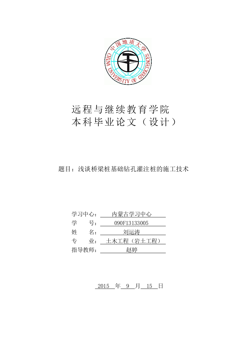 远程与继续教育学院本科毕业论文(设计)题目:浅谈桥梁桩基础钻孔灌注桩的施工技术学习中心:内蒙古学习中心学号:090F13133005姓名:刘运涛专业:土木工程(岩土工程)指导教师:赵婷2015年9月15日中国地质大学(武汉)远程与继续教育学院毕业设计(论文)中国地质大学(武汉)远程与继续教育学院本科毕业论文(设计)指导教师指导意见表学生姓名:刘运涛学号:090F13133005专业:土木工程(岩土工程)毕业设计(论文)题目:浅谈桥梁桩基础钻孔灌注桩的施工技术指导教师意见:(请对论文的学术水平做出简要评述。包括选题意义:文献资料的掌握:所用资料、实验结果和计算数据的可靠性:写作规范和逻辑性:文献引用的规范性等。还须明确指出论文中存在的问趣和不足《浅谈桥梁桩基础钻孔灌注桩的施工技术》一文选题较新颗,收集掌握的文献资料较全面,内蒙古包头市南绕城公路改建工程中的郑二窑子大桥的施工过程进行具体分析,参考规范、文献等总结完成,写作规范性和逻辑性较强:所用资料、实验结果数据可靠性高,保证了结论的有效性,已按评阅意见严格修改,达到本科论文要求。指导教师结论:合格(合格、不合格)指导教赵婷所在单位内蒙古农业大学指导时间2015.10.23师姓名中国地质大学(武汉)远程与继续教育学院毕业设计(论文)中国地质大学(武汉)远程与继续教育学院本科毕业设计(论文)评阅教师评阅意见表学生姓名:刘运涛学号:09013133005专业:土木工程(岩土工程)毕业设计(论文)题目:浅谈桥梁桩基础钻孔灌注桩的施工技术评阅意见:(请对论文的学术水平做出简要评述。包括选趣意义:文献资料的掌握:所用资料、实验结果和计算数据的可靠性:写作规范和逻辑性:文献引用的规范性等。还须明确指出论文中存在的问题和不足之处。)以桩的施工工艺为研究内容,选趣基本正确。首先介绍了工程概况及工程地质条件,对成孔工艺进行了选择,确定了成孔工艺,对钻孔灌注桩谑工工艺及施工中存在问趣进行了较详细的介绍。论文已经在第一稿的基础上按照修改意见进行了修改,但文中存在以下问趣:1、旋挖桩和泥浆护壁的钻孔灌注桩是不同的,请该同学在概念上要分清楚,由于概念上的错误,使得论文在桩型选定旋挖桩后,后文论述的是钻孔灌注桩的施工工艺,前后矛盾,请该同学今后多加注意。修改意见:(针对上面提出的问趣和不足之处提出具体修改意见。评阅成绩合格,并可不用修改直接参加答辩的不必填此意见。)毕业设计(论文)评阅成绩(百分制):60评阅结论:同意答辩(同意答辩、不同意答辩、修改后答辩)评阅人姓名时红莲所在单位中国地质大学评阅时间2015.10.252