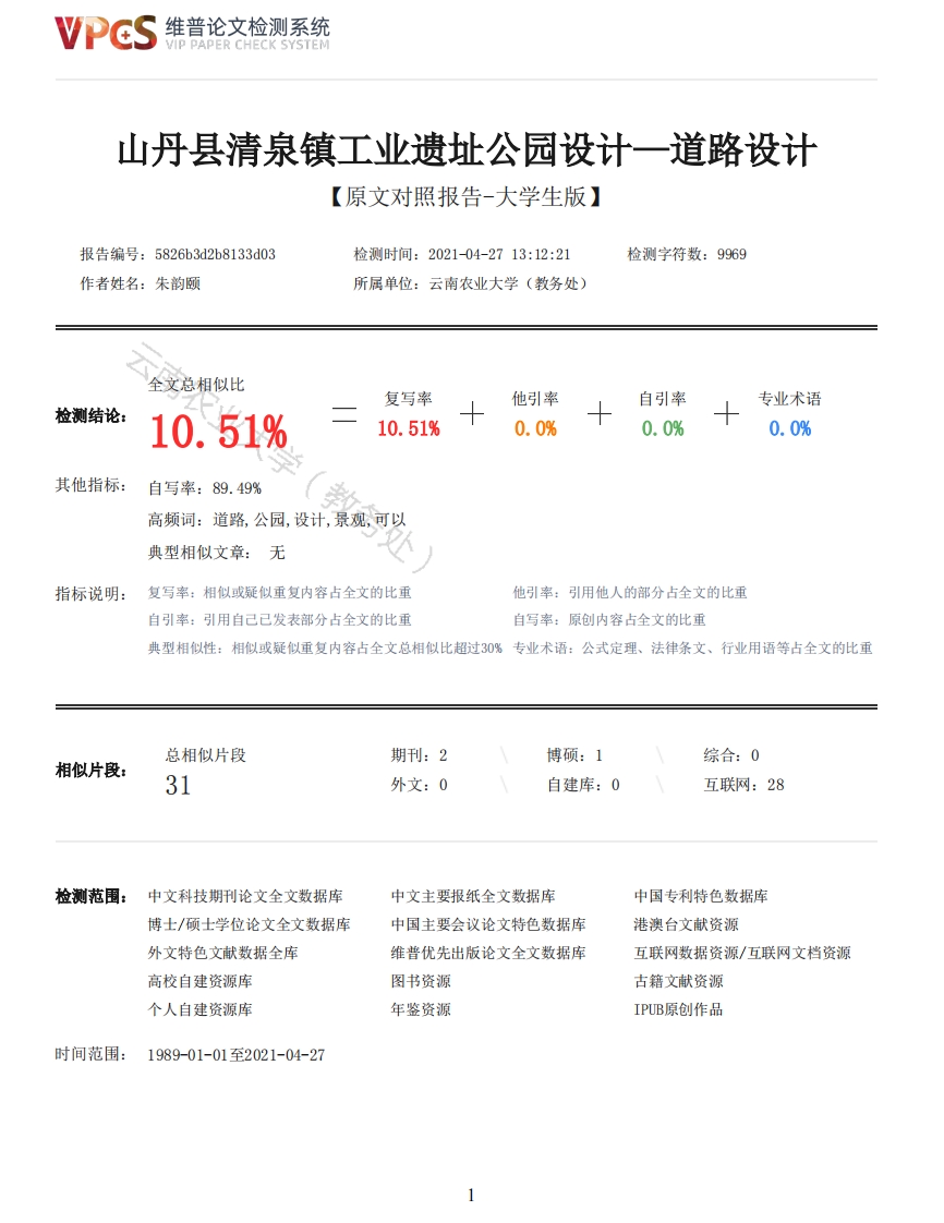 维普论文检测系统/IP PAPER CHECK SYSTEM山丹县清泉镇工业遗址公园设计一道路设计【原文对照报告-大学生版】报告编号:5826b3d2b8133d03检测时间:2021-04-2713:12:21检测字符数:9969作者姓名:朱韵颐所属单位:云南农业大学(教务处)全文总相似比复写率他引率自引率专业术语检测结论:10.51%10.51%0.0%0.0%0.0%其他指标:自写率:89.49%高频词:道路,公园,设计,景观,可以典型相似文章:无指标说明:复写率:相似或疑似重复内容占全文的比重他引率:引用他人的部分占全文的比重自引率:引用自己已发表部分占全文的比重自写率:原创内容占全文的比重典型相似性:相似或疑似重复内容占全文总相似比超过30%专业术语:公式定理、法律条文、行业用语等占全文的比重总相似片段期刊:2博硕:1综合:0相似片段:31外文:0自建库:0互联网:28检测范围:中文科技期刊论文全文数据库中文主要报纸全文数据库中国专利特色数据库博士/硕士学位论文全文数据库中国主要会议论文特色数据库港澳台文献资源外文特色文献数据全库维普优先出版论文全文数据库互联网数据资源/互联网文档资源高校自建资源库图书资源古籍文献资源个人自建资源库年鉴资源IPUB原创作品时间范围:1989-01-01至2021-04-27维普论文检测系统VIP PAPER CHECK SYSTEM原文对照颜色标注说明:■自写片段■复写片段(相似或疑似重复)口引用片段(引用)■专业术语(公式定理、法律条文、行业用语等)云南农业大学(教务处毕业论文资料学院:园林园艺学院专业:环境设计年级:2017级姓名:朱韵颐学号:2017310635日期:2021年月日云南农业大学教务处制类工学编号(学号)2017310635本科生毕业论文(设计)山丹县清泉镇工业遗址公园设计道路设计Design of Industrial Relic Park in Qingquan Town,Shandan County-road design朱韵颐指导教师:王有国职称:副教授、讲师云南农业大学昆明黑龙潭650201学院:园林园艺学院专业:环境设计年级:2017级论文(设计)提交日期:2017年4月答辩日期:2017年5月12日答辩委员会主任:2维普论文检测系统VIP PAPER CHECK SYSTEM云南农业大学2017年5月山丹县清泉镇工业遗址公园设计道路设计朱韵颐(云南农业大学园林园艺学院,昆明650201)摘要随着山丹县工业生产经营活动的进一步结束而涌现出许多被遗弃的闲置土地,对于这类土地需要重新进行开发和利用,通过对该地区的气候条件,周围环境及地形地貌等因素进行分析,充分利用山丹县自身的地域条件来打造一个具有当地特色的综合型商务景观公园。构图形式呈现为不等边平行四面三角形或多边形。游客或许对于园区内各个风景名胜点印象深刻,但对于公园路径的印象不那么深刻,公园路径作为连接各个风景名胜点的重要性和核心,起着不可或缺且潜移默化的推动作用。因此道路设计将配合公园总体风格打造一个整体,重建新的生态景观,在规划中把休憩、景观和商业有机的结合在一起,实现功能和景观并重,互相联络的局部构成一个完整的公园道路线网系统。关键词:商业景观公园;公园道路:景观.Design of Industrial Relic Park in Qingquan Town,Shandan County--road design摘要Zhu Yunyi(College of Landscape and Horticulture,Yunnan Agricultural University,Kunming 650201)ABSTRACTWith the further end of industrial production and operation activities in Shandan County,manyabandoned and idle lands have emerged.This type of land needs to be re-developed and used.Throughanalysis of the climatic conditions,surrounding environment,topography and other factors in thearea Make full use of Shandan County's own geographical conditions to create a comprehensivebusiness landscape park with local characteristics.The composition form is presented as a unequal-sided parallel four-sided triangle or polygon.Visitors may be deeply impressed by the variousscenic spots in the park,but they are not so impressed by the park path.As the importance and coreof connecting the various scenic spots,the park path plays an indispensable and imperceptible rolein promoting.Therefore,the road design will match the overall style of the park to create a whole,rebuild a new ecological landscape,and organically combine recreation,landscape and commerce inthe planning to achieve equal emphasis on function and landscape,and interconnected parts form acomplete park road line.Network system.Keywords:commercial landscape park;park road:landscape.山丹县清泉镇工业遗址公园设计道路设计1.引言道路是公园的骨干,因此道路的设计必须与公园的整体风格相匹配才能使其整体化。公园道路的方向对公园的通风,照明和环境保护有一定的影响。该设计应基于公园的类型,公园的交通方向,交通流量等来规划公园道路的路线,以便公园的各个部分可以相互通信。方便引导游客观看和参观公园,从而形成一个整体的公园路网系统。因此,公园道路在其实际的功能及美化环境方面都起着非常重要的作用。园区道路不仅必须具有集散游客的交通功能,还必须根据园区内的绿化,建筑物的维护,保养与管理等各种交通运输任务,以及安全,消防,公共食堂,小卖部等各种交通运输任务。实施园艺责任。对于一个小型的公园,我们可以从整体上来综合地去考虑。对于一个大型的公园,由于其园艺项目的工作量较大,所以在有必要时可以设置特殊路线与入口。园区的道路作为公园空间交通界面的一个重要方面而共同存在,并始终伴随着游客:其美丽的曲线,层次多样的人行道和周围的群山、水、建筑花卉、树木、石头风景和其他风景紧密结合在一起,不仅是”为风景设计道路“和“