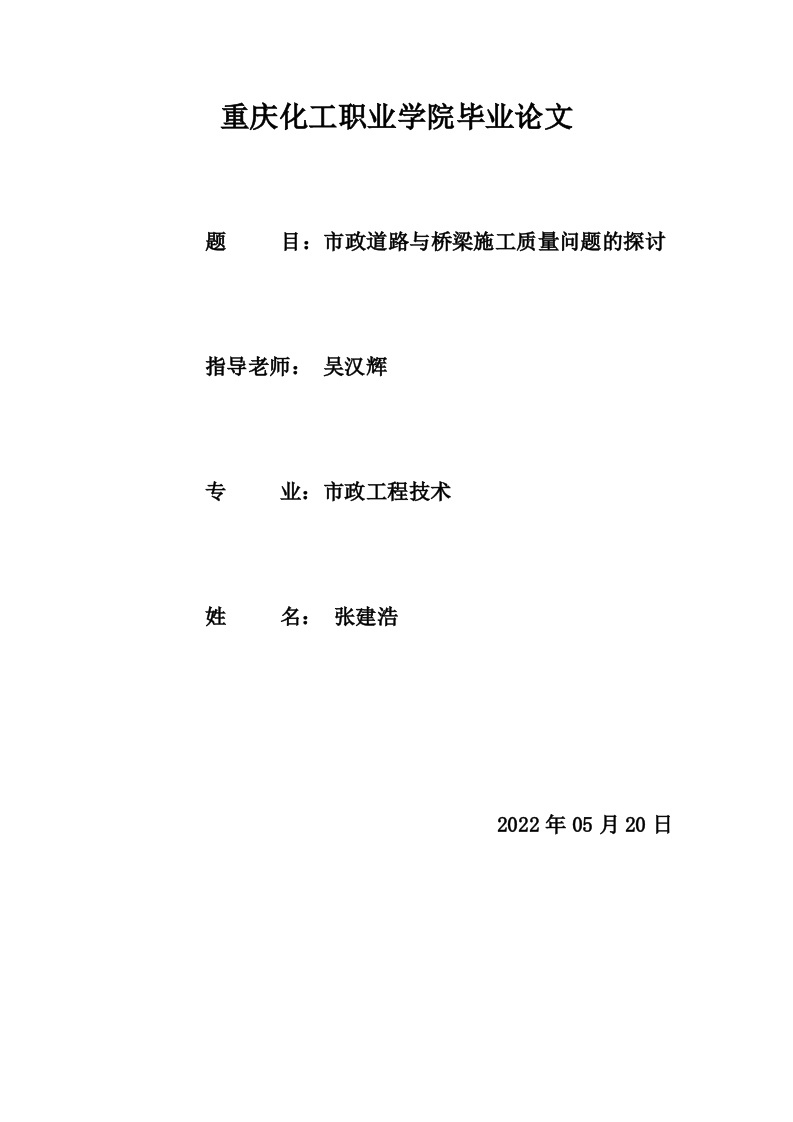 重庆化工职业学院毕业论文题目:市政道路与桥梁施工质量问题的探讨指导老师:吴汉辉专业:市政工程技术姓名:张建浩2022年05月20日重庆化工职业学院毕业论文市政道路与桥梁施工质量问题的探讨摘要在我国国民经济的大力支持下,城市基础设施的发展进程正在逐步加快,主体基础设施也在逐步增加。道路桥梁的建设是城市交通传输和运营必不可少的重要基础设施,道路建设的质量直接影响到一个城市所有人的安全。一般来说,道路桥梁的质量控制工作应从第一个施工阶段的工序质量检查开始,加强施工各环节的质量监控和管理,根据以往施工经验,对路桥施工后期的通病采取预防措施,加强对个别建筑连接的质量管理和控制,规范单体建筑管理阶段,有效保障和提高工程质量。在此背景下,本文主要针对我国城市道路桥梁建设过程中桥梁养护质量管理和建筑质量控制进行研究。关键词:市政工程:道路桥梁施工;施工质量重庆化工职业学院毕业论文市政道路与桥粱施工质量问题的探讨目录11道路桥梁工程施工质量影响因素21.1环境因素…21.2设备方面…21.3人员方面22市政道路桥梁工程施工质量提升措施42.1路面碾压施工质控措施42.2路桥接缝处理质控措施423钢筋混凝土施工质控措施…3市政道路桥梁工程施工质量管理策略…63.1做好环境勘察工作,优化施工设计3.2加强现场人机材管理,规范施工秩序.63.3加强队伍建设,提高路桥施工质量管理水平4案例分析…4.1项目简介.74.2项目施工管理中存在的问题.…74.2.1施工材料问题4.2.2施工成本控制与施工质量关系问题74.2.3管理机制问题.84.3改进措施4.3.1创新施工技术、加强成本与质量控制84.3.2加强对施工的全过程管理8结论9参考文献…10