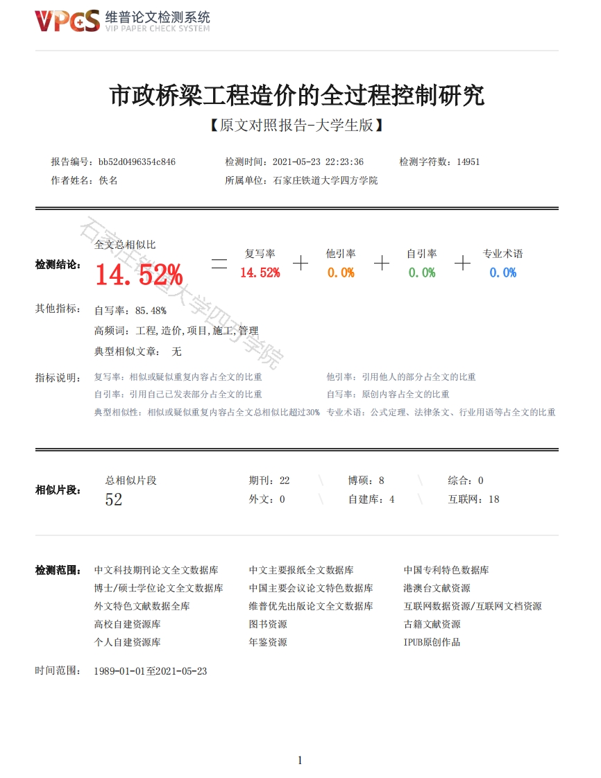 维普论文检测系统VIP PAPER CHECK SYSTEM市政桥梁工程造价的全过程控制研究【原文对照报告-大学生版】报告编号:bb52d0496354c846检测时间:2021-05-2322:23:36检测字符数:14951作者姓名:佚名所属单位:石家庄铁道大学四方学院全文总相似比复写率他引率自引率专业术语检测结论:14.52%14.52%0.0%0.0%0.0%其他指标:自写率:85.48%高频词:工程,造价,项目,施工,管理典型相似文章:无指标说明:复写率:相似或疑似重复内容占全文的比重他引率:引用他人的部分占全文的比重自引率:引用自己已发表部分占全文的比重自写率:原创内容占全文的比重典型相似性:相似或疑似重复内容占全文总相似比超过30%专业术语:公式定理、法律条文、行业用语等占全文的比重总相似片段期刊:22博硕:8综合:0相似片段:52外文:0自建库:4互联网:18检测范围:中文科技期刊论文全文数据库中文主要报纸全文数据库中国专利特色数据库博士/硕士学位论文全文数据库中国主要会议论文特色数据库港澳台文献资源外文特色文献数据全库维普优先出版论文全文数据库互联网数据资源/互联网文档资源高校自建资源库图书资源古籍文献资源个人自建资源库年鉴资源IPUB原创作品时间范围:1989-01-01至2021-05-23维普论文检测系统VIP PAPER CHECK SYSTEM原文对照颜色标注说明:■自写片段■复写片段(相似或疑似重复)口引用片段(引用)■专业术语(公式定理、法律条文、行业用语等)摘要伴随着我国国民经济的不断飞速发展,我国的城市化工程建设也热火朝天的进行着,催生了大批市政桥梁建设项目的开启。项目建设中的桥梁工程造价风险问题也逐渐开始受到了重视。加强对一些市政大型桥梁工程的项目造价风险控制,可以带来巨大的经济效益和社会效益。市政桥梁工程项目投资建设的成本造价控制问题涉及到项目投资决策管理阶段、工程设计管理阶段、招投标管理阶段、施工阶段、交付结算使用(包括竣工交付结算)各个阶段,在每个市政桥梁工程建设项目的每一个阶段都可能存在不同的造价风险控制因素,而这些风险因素都非常有可能对桥梁工程项目建设有不利的影响。本文通过研究搜集整理相关文献资料,探究了对我国市政公桥梁工程项目造价管理全过程风险控制中包括投资决策、设计、招投标、施工、竣工前后结算各个阶段可能存在的一些问题,并且根据实际情况、具体问题找出解决方案,控制工程造价,提高市政桥梁工程项目的经济效益。关键词:市政桥梁工程;全过程控制管理:工程造价AbstractWith the rapid development of my country's economy,my country's urbanization construction isalso in full swing,and the management of municipal engineering projects has also made greatprogress.Bridge engineers are one of the main engineering projects of social transportation Chinesemunicipal infrastructure.Important social attributes can bring huge economic and social benefits.The whole process management of Municipal Bridge Project construction includes investmentdecision-making stage,engineering design stage,bidding stage,construction stage,delivery anduse (final settlement)stage,there are different risk factors in every phase of Municipal BridgeProject,and these factors may have a negative impact on the project.Through collecting andsorting out the literature,this paper probes into the problems existing in the stages ofinvestment decision-making,design,bidding,construction and final settlement in the wholeprocess control of the construction cost of municipal bridge projects,and according to the actualsituation,specific problems to find solutions to improve the economic benefits of municipal bridgeprojects.Key Words:Municipal Bridge Project:Whole Process Control Management:project cos.Keywords:municipal bridge engineering whole process control management engineering cost第一章绪论一、选题的研究背景和意义(一)选题的研究背景伴随着近年我国国民经济的不断飞速发展,我国的现代城市化工程建设也如日中天的正在进行着,据2010年相关国家统计部门文件数据显示,中国长江大桥设计跨度已经连续位居我国世界跨度前列,同时与之紧密相关的新型建筑设计技术也进一挤进入了全球先进建筑队伍。随着国家现代化建设脚步不断加快,国内交通高速公路极为便利,各主要城市之间修建了各种各样的高速立交桥、高架桥等。2维普论文检测系统VIP PAPER CHECK SYSTEM同时,市政工程设施项目的建设管理工作也已经取得了巨大的的进步,桥梁工程项目是我国市政公共基础工程设施的主要建设工程项目之一,桥梁也逐渐发展成为我们衡量一个国家经济发展的重要标准之一,不仅仅局限于居民出行和交通运输,还有较为重要的一种社会经济属性,可以为其带来巨大的社会经济效益和其他社会效益。现阶段,我国的市政桥梁工程大多数都已经是由地方政府、国家直接支持的,市政桥梁工程需要许多资金,而且规模较大、内容多,因此做好市程中仍会出现许多问题,例如忽视前期阶段预算,缺乏全局监控意识,管理人员及相关人员专业素质不够,偷工减料现象的存在,工程项目管理体系的不完善等等的这些问题,都会使得国家支出增多,或最后的工程质量不高。所以我们需要对市政桥梁工程建设造价管理全过程成本控制问题进行深入研究,让工程建设项目在保证质量的必要情况下达到经济效益最大化。(二)选题的研究意义1.能够有效促进市政桥梁工程的顺利施工对目前我国的市政桥梁工程建设施工来说,若相关的工程管理人员不能够对工程相应