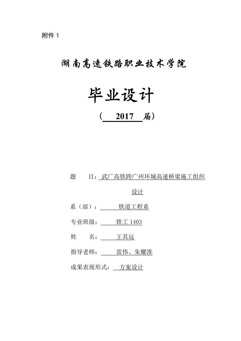 附件1湖南高速铁路职业技术学院毕业设计(2017届)题目:武广高铁跨广州环城高速桥梁施工组织设计系(部):铁道工程系专业班级:铁工1403姓名:王其远指导老师:雷伟、朱耀淮成果表现形式:方案设计目录第一章绪论第二章工程概况……22.1工程说明2.2编制依据…2.3编制原则……32.4桥梁工程程特点认知…3第三章施工措施…3.1施工期间安全措施…3.2工期保障措施…3.4文明、环保施工措施…3.5雨季施工安排……7第四章工程进度…4.1施工方法……74.1.1施工准备4.1.2桥梁工程……84.2.1桥梁施工方案…4.2.2桩基础施工…94.2.3钻孔灌注桩施工…94.2.4承台施工…4.2.5墩、台身施工…4.2.6砼连续箱梁施工……13第五章桥面及附属结构施工…235.1桥台锥体护坡施工……235.2桥梁伸缩缝安装…5.3桥梁施工工艺流程图…25结论…28参考文献…29致谢…31附件2湖南高速铁路职业技术学院铁道工程系毕业设计任务书设计题目武广高铁跨广州环城高速桥梁施工组织设计成果表现形式方案设计学生姓名专业班级联系电话电子信箱/QQ王其远铁工1403184734935021582666392@gg.com指导教师教研室联系电话电子信箱/QQ雷伟、朱耀勘测教研室、力学教研14789356083150112543@qq.c0m淮室15211459215851293230@qq.c0m1、桥梁施工组织编制、施工方案施工措施。2、桥梁墩基础计算、桥面承受荷载计算。3、施工技术难点分析、现代桥梁技术发展主要技术应用。设计任务和4、设计内容与时俱进,使用新的规范技术标准。目标1,根据所学知识及系部毕业设计要求对该课题进行查阅深度调查、研究可行性。2.对该设计中所面对的知识难点进行分析、查阅相关资料和指导实施步骤和老师交流。方法3.了解该工程施工技术标准、相关规范。4.编制该桥施工组织。