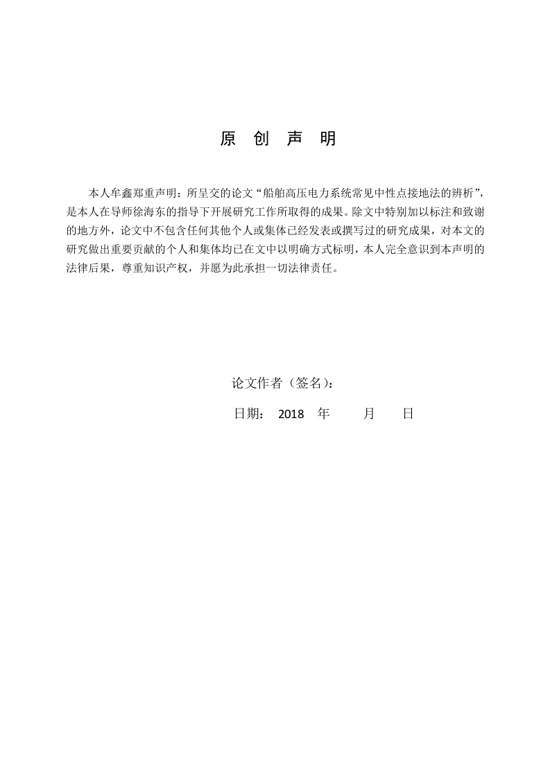 原创声明本人牟鑫郑重声明:所呈交的论文“船舶高压电力系统常见中性点接地法的辨析”,是本人在导师徐海东的指导下开展研究工作所取得的成果。除文中特别加以标注和致谢的地方外,论文中不包含任何其他个人或集体已经发表或撰写过的研究成果,对本文的研究做出重要贡献的个人和集体均已在文中以明确方式标明,本人完全意识到本声明的法律后果,尊重知识产权,并愿为此承担一切法律责任。论文作者(签名):日期:2018年月日牟鑫:船舶高压电力系统常见中性点接地法的辨析摘要目前船舶电气设备功率的日益增加,系统复杂程度、智能化程度、自动化程度的提高及其科学技术水平得到了空前的发展,低压系统已经不能满足船舶总功率增加的需要,采用高压电力系统对船舶供电已是大型船舶电力系统发展的必然趋势。船舶高压系统提高了船员专业技能水平的标准,船员必须能够在最短的时间内对故障做出迅速反应并且采取最有效的处理措施,才能有效减少各项损失。目前研究船舶高压电力系统中性点接地方式是需要解决的关键技术问题。本文通过分析对比中性点接地方式的原理,得出中性点经电阻接地的系统在投资方面更经济,在供电方面可靠性更高,接触电压小,跨步电压对人员的安全威胁小,维护工作较少,设备绝缘程度高,可以通过阻值调节电弧接地故障过电压数值,对通信线路的干扰弱,系统更稳定,更适合被应用于现代大型船舶电力系统的中性点接地。关键词:船舶高压电力系统,中性点,接地方式II牟鑫:船舶高压电力系统常见中性点接地法的辨析AbstractAt present,the power of the electrical equipment of the ship is increasing,the complexityof the system,the degree of intelligence,the improvement of the degree of automation and thelevel of its science and technology have been developed unprecedentedly.The components ofthe low voltage power station can not meet the need of the increase of the total power of theship,and also improve the standard of the professional skill level of the ship crew.The crewmust be able to respond quickly to failures in the shortest possible time and take the mosteffective measures to effectively reduce the losses.At present,what kind of grounding methodis adopted in the neutral point of China's marine high voltage power system is the keytechnical problem we need to solve.In this paper,the characteristics of different grounding systems are analyzed in detail.Byanalyzing and comparing the principle of neutral grounding,advantages and disadvantages,plus its practical scope.After comparing and analyzing the characteristics and advantages anddisadvantages of different grounding methods,the more effective grounding scheme is furtherexplored.The system of neutral point through resistance grounding is more economical ininvestment,more reliable in power supply,small in contact voltage,small in the threat ofstride voltage to human safety,less in maintenance,and in equipment.The high degree ofedge can regulate the earth fault overvoltage value by resistance,and the interference tocommunication lines is weak,and the system is more stable.But the relay did not movequickly.Due to the application of computer protection,the speed of system protection hasbeen greatly improved.It is of great significance to the selection of neutral grounding mode inthe current transformation of ship power network.Key words:Marine high voltage electrical system,Neutral point,Grounding operation modeIII