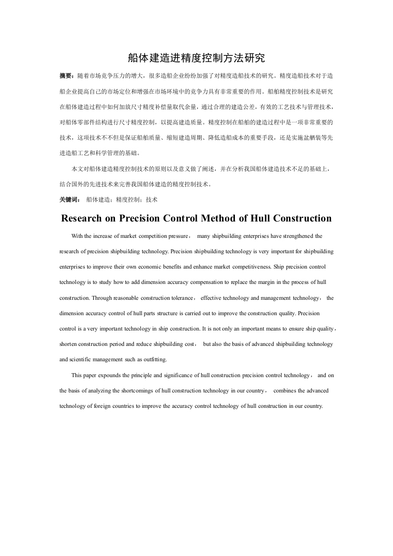 船体建造进精度控制方法研究摘要:随着市场竞争压力的增大,很多造船企业纷纷加强了对精度造船技术的研究。精度造船技术对于造船企业提高自己的市场定位和增强在市场环境中的竞争力具有非常重要的作用。船舶精度控制技术是研究在船体建造过程中如何加放尺寸精度补偿量取代余量,通过合理的建造公差,有效的工艺技术与管理技术,对船体零部件结构进行尺寸精度控制,以提高建造质量。精度控制在船舶的建造过程中是一项非常重要的技术,这项技术不不但是保证船舶质量、缩短建造周期、降低造船成本的重要手段,还是实施盆舾装等先进造船工艺和科学管理的基础。本文对船体建造精度控制技术的原则以及意义做了阐述,并在分析我国船体建造技术不足的基础上,结合国外的先进技术来完普我国船体建造的精度控制技术。关键词:船体建造:精度控制:技术Research on Precision Control Method of Hull ConstructionWith the increase of market competition pressure,many shipbuilding enterprises have strengthened theresearch of precision shipbuilding technology.Precision shipbuilding technology is very important for shipbuildingenterprises to improve their own economic benefits and enhance market competitiveness.Ship precision controltechnology is to study how to add dimension accuracy compensation to replace the margin in the process of hullconstruction.Through reasonable construction tolerance,effective technology and management technology,thedimension accuracy control of hull parts structure is carried out to improve the construction quality.Precisioncontrol is a very important technology in ship construction.It is not only an important means to ensure ship quality,shorten construction period and reduce shipbuilding cost,but also the basis of advanced shipbuilding technologyand scientific management such as outfitting.This paper expounds the principle and significance of hull construction precision control technology,and onthe basis of analyzing the shortcomings of hull construction technology in our country,combines the advancedtechnology of foreign countries to improve the accuracy control technology of hull construction in our country.目录第一章引言31.1选题的科学依据和工程意义…1.1.1选题的科学依据…31.1.2选题的工程意义…4第二章国内外精准度管理研究现状及发展趋势2.1国内外精准度管理研究现状.52.2国内外精准度管理研究发展趋势第三章我国船舶建造技术存在的问题…3.1测量技术落后…4.1船舶建造精度控制的内容.…4.2船舶建造精度控制在船舶建造中的意义..84.3过程中的精度控制4.4精度控制过程中的数据测量.4.5对反馈数据的分析…95.1增加反变形…5.2加放补偿量…5.3检验线设置.5.4现场数据监测及分析谢辞参考文献13第一章引言船体建造精度管理是综合性的过程管理。船体设计精度管理保证了产品质量的起点,而船体建造是精度管理的关键,辅助技术工作是精度管理的基础,质量检验是精度管理工作的保证。积极开展精度管理技术的研究,在精度管理的过程中收集各种反馈数据并应用数理统计的方法加以分析,尽快形成标准化,形成完普的精度控制体系。1.1选题的科学依据和工程意义1.1.1选题的科学依据造船管理的重要组成部分是控制精度和质量。在科学技术迅速发展的时代影响,以及现代科学对科学管理的要求下,在造船企业管理中,精密管理的地位越来越高,起到的作用也越来越大。对于他的理论和方法的探索,也变得越来越丰富。精密控制技术的全面采用是实现现代造船的“里程碑”。基于船体结构精度标准,船体结构精度管理的核心就是精确控制,通过科学的管理方法和先进的技术和工艺,实现了船体结构全过程的尺寸精度分析和控制,以达到最大化。减少现场维修工作量,提高工作效率,降低施工成本,确保产品质量。船体精度管理系统的研究是船体施工过程中相关技术实施的基础,也是整个中国造船业发展的瓶颈。因此,船舶精密控制技术是提高船舶质量和降低生产成本的主要手段。当今社会,造船业之间的竞争激烈程度也在不断加剧,中国的造船业还处于发展阶段,距离造船强国这个地位还有一定的距离。造船模型已经发展到巨型截面施工模式,相应的造船精度管理至关重要。造船精确管理本质上是一种管理技术。通过建立合理的施工精度标准和采用科学的管理方法,辅以改进设计和工艺,包括工装,设备改进和各种对策,以防止施工错误。在船体结构的整个过程中进行尺寸精度分析和控制,从而保证在造船过程中的各个工艺阶段,所有船体部件的尺寸精度都基本达到规定的度数,在最大限度上减少现场修整所要消耗的工作量,提高工作效率。随着船体加工精度的不断提高,船体组装和焊接的精度也得到提高,从而可靠地保证了船体的施工质量。1.1.2选题的工程意义对造船精度管理体系的研究具有重要的工程意义,主要体现在以下几点:(1)造船精度管理系统的研究是改造造船模式,实现壳,阳,涂一体化的重