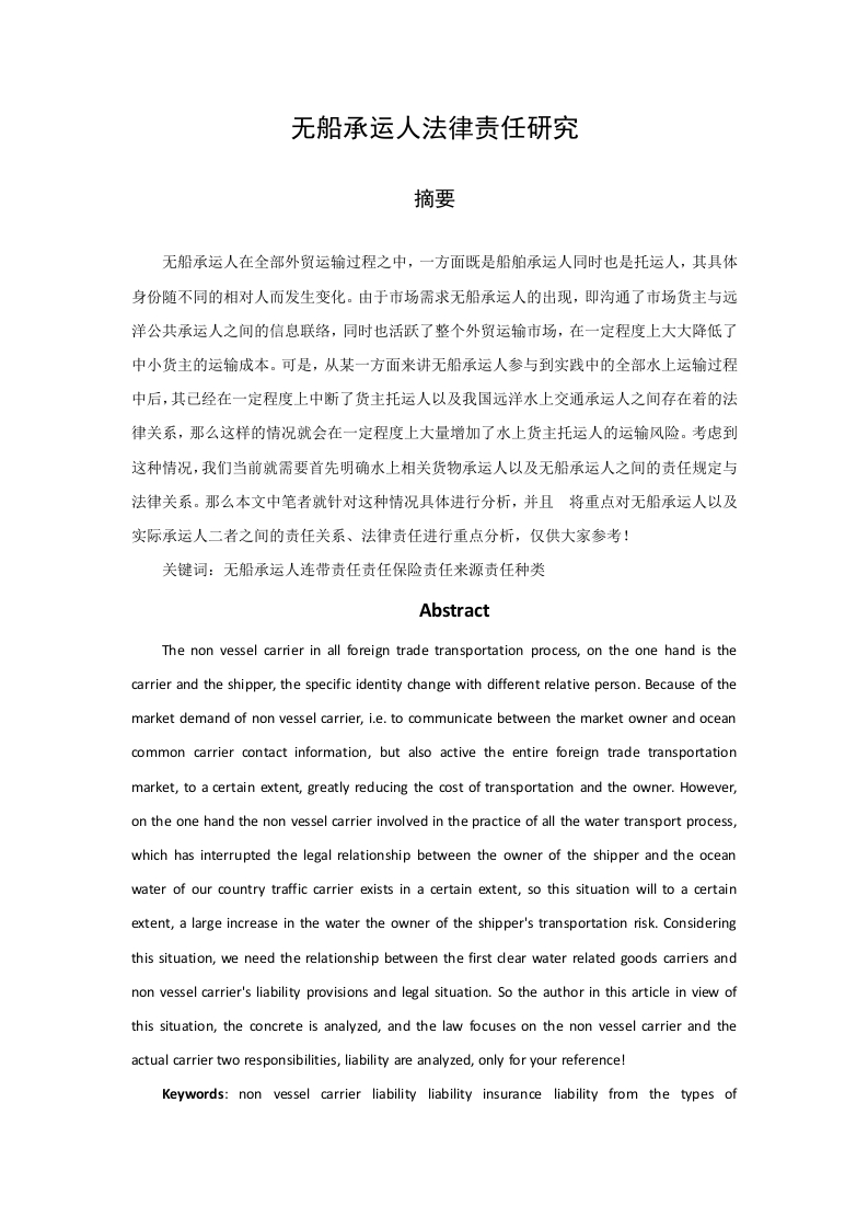 无船承运人法律责任研究摘要无船承运人在全部外贸运输过程之中,一方面既是船舶承运人同时也是托运人,其具体身份随不同的相对人而发生变化。由于市场需求无船承运人的出现,即沟通了市场货主与远洋公共承运人之间的信息联络,同时也活跃了整个外贸运输市场,在一定程度上大大降低了中小货主的运输成本。可是,从某一方面来讲无船承运人参与到实践中的全部水上运输过程中后,其己经在一定程度上中断了货主托运人以及我国远洋水上交通承运人之间存在着的法律关系,那么这样的情况就会在一定程度上大量增加了水上货主托运人的运输风险。考虑到这种情况,我们当前就需要首先明确水上相关货物承运人以及无船承运人之间的责任规定与法律关系。那么本文中笔者就针对这种情况具体进行分析,并且将重点对无船承运人以及实际承运人二者之间的责任关系、法律责任进行重点分析,仅供大家参考!关键词:无船承运人连带责任责任保险责任来源责任种类AbstractThe non vessel carrier in all foreign trade transportation process,on the one hand is thecarrier and the shipper,the specific identity change with different relative person.Because of themarket demand of non vessel carrier,i.e.to communicate between the market owner and oceancommon carrier contact information,but also active the entire foreign trade transportationmarket,to a certain extent,greatly reducing the cost of transportation and the owner.However,on the one hand the non vessel carrier involved in the practice of all the water transport process,which has interrupted the legal relationship between the owner of the shipper and the oceanwater of our country traffic carrier exists in a certain extent,so this situation will to a certainextent,a large increase in the water the owner of the shipper's transportation risk.Consideringthis situation,we need the relationship between the first cear water related goods carriers andnon vessel carrier's liability provisions and legal situation.So the author in this article in view ofthis situation,the concrete is analyzed,and the law focuses on the non vessel carrier and theactual carrier two responsibilities,liability are analyzed,only for your reference!Keywords:non vessel carrier liability liability insurance liability from the types ofresponsibility目录Abstract一、无船承运人的责任3二、无船承运人与实际承运人承担连带责任的问题3三、无船承运人责任承担的保障(一)保证金制度…(二)责任保险2、必要性…3、其责任的米源…54、责任险的种类…6参考文献…7一、无船承运人的责任无船承运人就是承运人,相对于无船承运人法律责任的认定,一般情况下是参照我国海商法第四章第二节规定的承运人的责任来加以确定。在我国海商法规定中承运人的责任制采取的是不完全过失责任制,这样一来远洋公共承运人享受的不完全过失责任制无船承运人同样也可以享受,与此同时还有许多的免责事由也可以使无船承运人免于对货物的灭失、损害承担相关责任。不仅如此,无船承运人还同时享有船舶承运人的收取运费、留置货物等等权