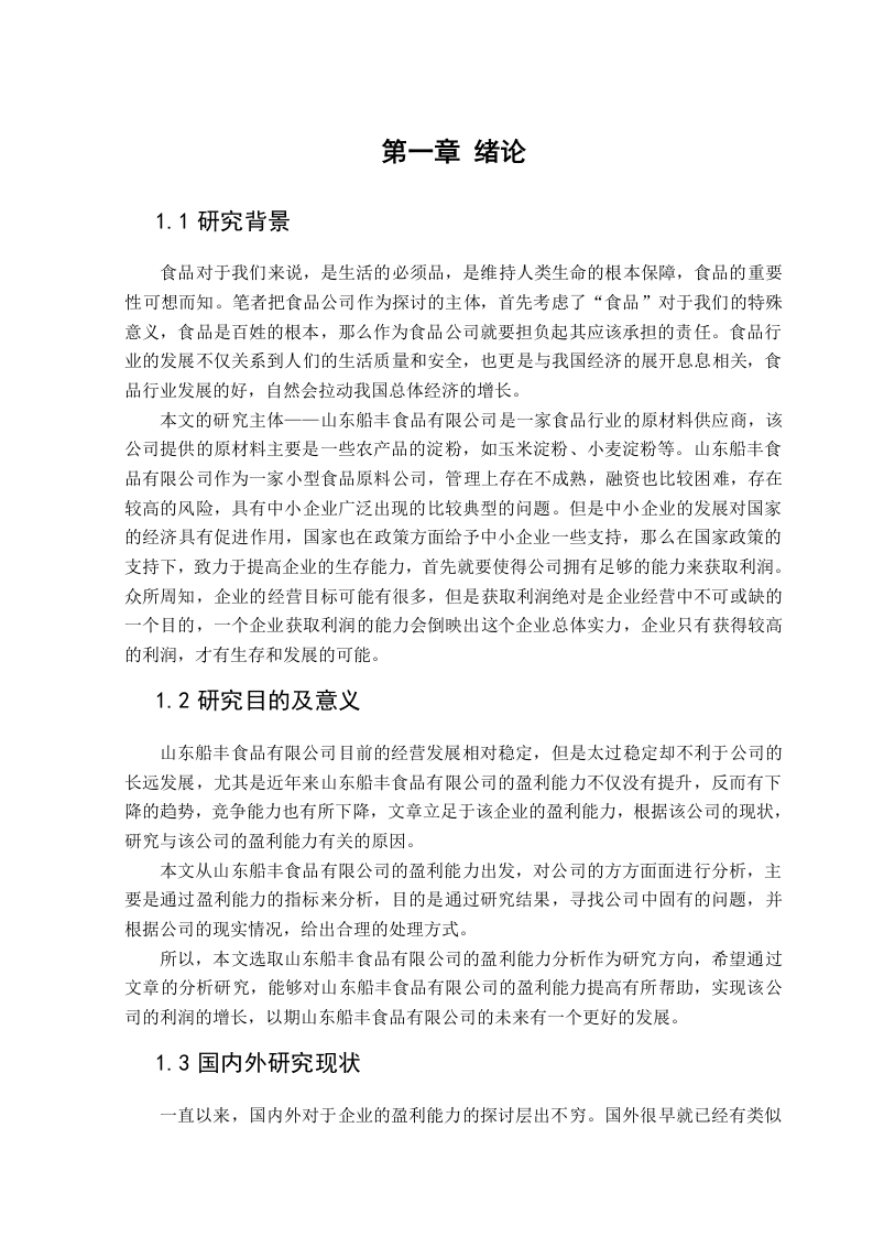 第一章绪论1.1研究背景食品对于我们来说,是生活的必须品,是维持人类生命的根本保障,食品的重要性可想而知。笔者把食品公司作为探讨的主体,首先考虑了“食品”对于我们的特殊意义,食品是百姓的根本,那么作为食品公司就要担负起其应该承担的责任。食品行业的发展不仅关系到人们的生活质量和安全,也更是与我国经济的展开息息相关,食品行业发展的好,自然会拉动我国总体经济的增长。本文的研究主体一一山东船丰食品有限公司是一家食品行业的原材料供应商,该公司提供的原材料主要是一些农产品的淀粉,如玉米淀粉、小麦淀粉等。山东船丰食品有限公司作为一家小型食品原料公司,管理上存在不成熟,融资也比较困难,存在较高的风险,具有中小企业广泛出现的比较典型的问题。但是中小企业的发展对国家的经济具有促进作用,国家也在政策方面给予中小企业一些支持,那么在国家政策的支持下,致力于提高企业的生存能力,首先就要使得公司拥有足够的能力来获取利润。众所周知,企业的经营目标可能有很多,但是获取利润绝对是企业经营中不可或缺的一个目的,一个企业获取利润的能力会倒映出这个企业总体实力,企业只有获得较高的利润,才有生存和发展的可能。1.2研究目的及意义山东船丰食品有限公司目前的经营发展相对稳定,但是太过稳定却不利于公司的长远发展,尤其是近年来山东船丰食品有限公司的盈利能力不仅没有提升,反而有下降的趋势,竞争能力也有所下降,文章立足于该企业的盈利能力,根据该公司的现状,研究与该公司的盈利能力有关的原因。本文从山东船丰食品有限公司的盈利能力出发,对公司的方方面面进行分析,主要是通过盈利能力的指标来分析,目的是通过研究结果,寻找公司中固有的问题,并根据公司的现实情况,给出合理的处理方式。所以,本文选取山东船丰食品有限公司的盈利能力分析作为研究方向,希望通过文章的分析研究,能够对山东船丰食品有限公司的盈利能力提高有所帮助,实现该公司的利润的增长,以期山东船丰食品有限公司的未来有一个更好的发展。1.3国内外研究现状一直以来,国内外对于企业的盈利能力的探讨层出不穷。国外很早就已经有类似企业盈利能力的分析了,但是由于以前的企业与现在有差异,因此那时候关于盈利能力分析与现在的略有差异。但是经过这些年以来的研究和发展,一些国家对于企业盈利能力分析的研究有了许多新的发展,尤其在分析的方法和技术上,有了显著的成就。美国的经济学家Joe.S.Baim,有一个著名的研究,他发现不同的行业的盈利能力是不同的,即使是同一行业的公司的盈利能力同样存在不同。企业本身的经营发展状况是形成这种不同的原因之一,其中最本质的原因是产业结构的差异。国内关于盈利能力的研讨明显晚于国外学者的研究,目前国内的研究主要以国外的盈利能力研究理论和分析指标为基础,在此基础上,国内的学者在盈利能力分析方法和技术上不断创新发展,逐步形成了符合国内特点的盈利能力分析方法,结合企业的生产成本,产品价格、数量和品质之间的联系,使企业在正常运转的基础上节约成本,获取利润。国内学者的主要研究成果有:万玉晶学者在2011年的文章《民营中小企业盈利能力分析》中,通过大量的数据分析,认为企业的盈利能力会遭到资本结构的影响,还与公司的资产营运效率有关。孙亚男在2018年的文章《GE公司盈利能力分析》中,通过研究分析,认为关于某一行业的盈利能力研究,国内的很多学者沿用了M资本结构理论,就是从影响公司的盈利能力的外部和内部两方面的因素分析。根据国内外对盈利能力的探讨,我们发现随着时代进步和管理需要的不断增加,对盈利能力的研究方法也始终在进步,没有一个完全固定的模型。但是现在国内对于盈利能力的评价主要还是以国外的几种主要理论为基础的。1.4研究内容和研究方法本篇论文以山东船丰食品有限公司为研究主体,主要对其盈利能力进行分析,并对公司与盈利能力有关的问题给出适当的解决办法,文章大致分为以下几个部分。第一章的内容是绪论,是对文章的总体描述,论文开篇探讨了相关背景,目的及意义,接着对关于盈利能力的国内外研究的现状有一个大体的总结,然后对文章运用的研究方法作出说明。。第二章的内容是盈利能力的理论知识阐述,主要介绍了企业盈利能力的具体指标分析有哪些以及盈利能力对公司发展的地位及作用。第三章的内容是山东船丰食品有限公司的概况及其盈利能力的分析。本章首先对整个食品行业目前的情况作出探讨,然后再对山东船丰食品有限公司的经营和盈利能力的现状进行简要分析,最后是对阻碍公司近两年盈利能力提高的原因分析。第四章的内容是提高山东船丰食品有限公司盈利能力的对策分析及建议,主要是根据公司的实际情况寻找合理的解决方法,致力于帮助企业盈利,使公司获得更可观的利润,帮助企业顺利经营,更好的发展。第五章是结论,对山东船丰食品有限公司未来的盈利能力目标做一个展望,同时提出论文中仍然存在的不足,致力于在之后的论文探讨中不断作出改进。本篇论文主要运用了盈利能力指标分析法、对比分析法、文献查阅法这三个研究方法,其中运用盈利能力指标分析法和文献查阅法的地方比较多,对比分析法相比另外两