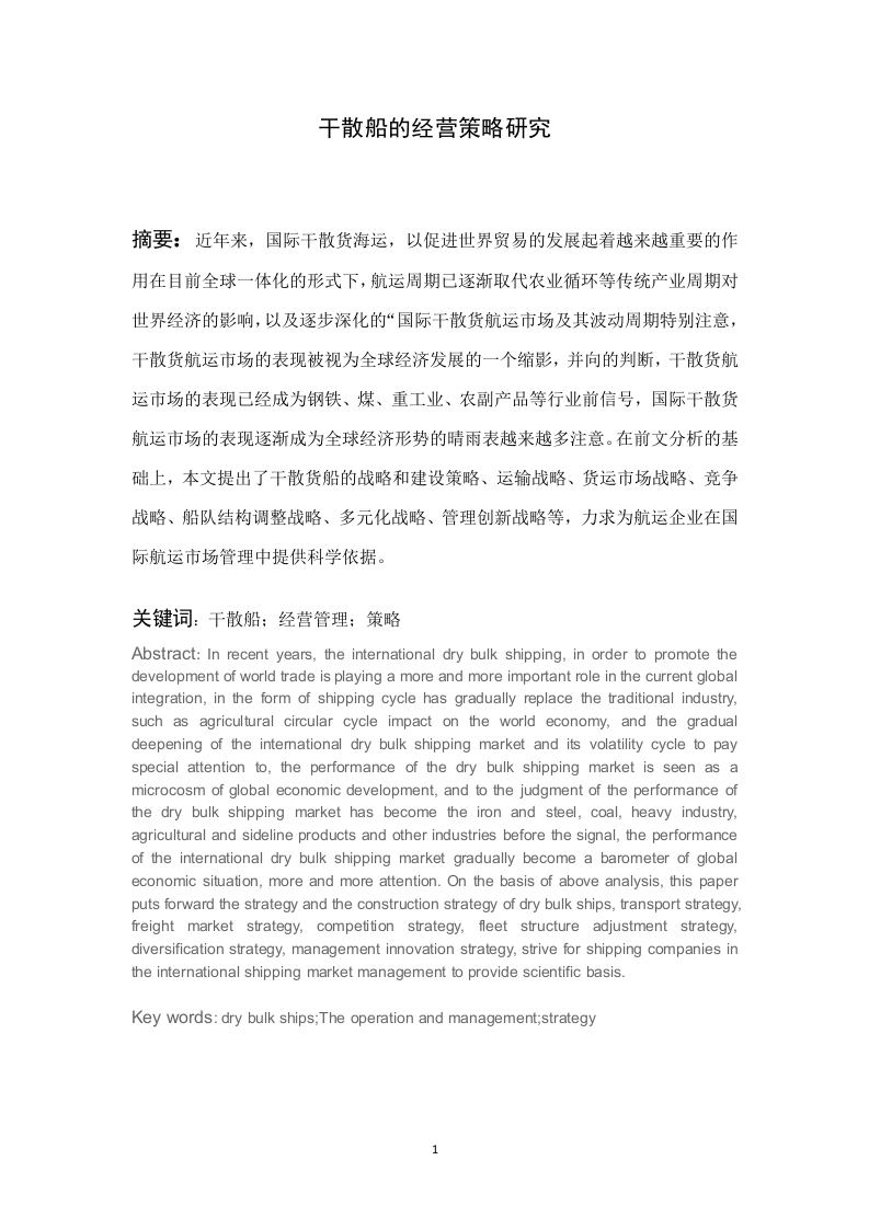 干散船的经营策略研究摘要:近年来,国际干散货海运,以促进世界贸易的发展起着越来越重要的作用在目前全球一体化的形式下,航运周期已逐渐取代农业循环等传统产业周期对世界经济的影响,以及逐步深化的“国际干散货航运市场及其波动周期特别注意,干散货航运市场的表现被视为全球经济发展的一个缩影,并向的判断,干散货航运市场的表现已经成为钢铁、煤、重工业、农副产品等行业前信号,国际干散货航运市场的表现逐渐成为全球经济形势的晴雨表越来越多注意。在前文分析的基础上,本文提出了干散货船的战略和建设策略、运输战略、货运市场战略、竞争战略、船队结构调整战略、多元化战略、管理创新战略等,力求为航运企业在国际航运市场管理中提供科学依据。关键词:干散船:经营管理;策略Abstract:In recent years,the international dry bulk shipping,in order to promote thedevelopment of world trade is playing a more and more important role in the current globalintegration,in the form of shipping cycle has gradually replace the traditional industry,such as agricultural circular cycle impact on the world economy,and the gradualdeepening of the intemational dry bulk shipping market and its volatility cycle to payspecial attention to,the performance of the dry bulk shipping market is seen as amicrocosm of global economic development,and to the judgment of the performance ofthe dry bulk shipping market has become the iron and steel,coal,heavy industry,agricultural and sideline products and other industries before the signal,the performanceof the international dry bulk shipping market gradually become a barometer of globaleconomic situation,more and more attention.On the basis of above analysis,this paperputs forward the strategy and the construction strategy of dry bulk ships,transport strategy,freight market strategy,competition strategy,fleet structure adjustment strategy,diversification strategy,management innovation strategy,strive for shipping companies inthe international shipping market management to provide scientific basis.Key words:dry bulk ships;The operation and management;strategy目录5(三)研究内容…(四)国内外研究状况二.干散货船经营现状分析…7(一)干散货船相关概念分析…(二)干散货船国际市场的构成要素(三)干散货船的发展环境分析.9(四)干散货船经营现状分析…9三.干散货船的经营策略研究.9(二)干散货船经营策略存在的问题.1.干散船交通不足,供需矛盾。112.资金不足。3.货物需求管理不好,很多地无系统的私用干散货船的激增占用水路资源。114.干散货船的管理体制有待改进。5.整体上服务网络未完善服务业务效率低。111.积极实施“散货船优先”的战略优先发展货物航运交通,这能解决其需求不够无法满足经济发展的需要。.112.实施干散货的交通需求管理策略。123.完善竞争市场机制。4.实行差异化政策支持,优劣淘汰。125.实施多元化战略。12四.未来干散船发展方向与趋势分析参考文献:.14(一)研究背景现代航海运输业是目前经济社会发展的重要的支柱性产业之一,干散船属于航运产业,它与物流行业、电子工业、机械金属加工业等许多产业紧密相关,这处在整个产业链上的航海运输链条属于劳动密集型产业,自然其中的航海行业也是劳动密集型产业,涉及到港口业、船舶业、集装箱业以及造船业等四大行业。船舶业的干散船作为整个劳动更密集型航运产业中的重要行业工具自然有着重要的航运地位,它对整个全球的经济交往和我国经济贸易的长远发展都有着重要的作用,因此基于其有着重要的经济价值,学术界自然也应对其有相关的研究和探讨。从已有的干散船的发展中可以看出,在80年代以前,国际整体上的干散船货运量,是大于整个国际海运总量50%。接下来80年代之后,随着多数国家的经济结构得到足够的调整,尤其是发达国家的经济结构,整个集装箱业务在很快的发展起来,因此,国际上原有的干散船站的航运比例有所下降,但仍然保持在40%的比例。目前为止,世界经济全球化和网络的快速发展和繁荣,各国经济支柱的变动和科技的大力提升,使得各个国家对原材料和起始能源的需求逐渐加大,国际上干散船的发展在逐渐增长,并保持稳定的态势。其干散货运的海运量从2002年到2010年由原来的24.50亿吨增至34.16亿吨,可见干散船的经营和管理得到的重视,但是其发展也有着些许的问题,如在2012年全球两大船舶经纪公司一英国ICAP与挪威Platou均未完成预期计划,在持续的推迟风向中,半数原计划在年内交付的干散货并不能如愿以偿地如期交付,长时期的延期交付货物等现象的出现会极大地影响到干散船的长远发展。而在这个过程中,伦敦克拉克森研究董事斯托普福德则认为,中国近几年干散船大力发展的缘故有关,在中国船厂中目前持有最多的干散货的新船订单,因此中国船厂可能遭受的有关船舶被撤单或推迟下水日期的风险仍然很高。已有的ICAP报告之处,在2012年中国船厂的交付量还未及60艘,并且可能仍有50%的交付进度未来无法完成虽然目前为止,中国的多数干散船得到了重大的发展,但是其仍