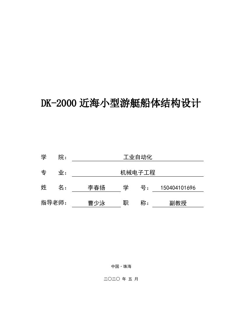 DK-2000近海小型游艇船体结构设计学工业自动化专业:机械电子工程姓名:李春扬学号:150404101696指导老师:曹少泳职称:副教授中国·珠海北京理工大学珠海学院2020届本科生毕业设计诚信承诺书本人郑重承诺:我所呈交的毕业论文《DK-2000近海小型游艇船体结构设计》是在指导教师的指导下,独立开展研究取得的成果,文中引用他人的观点和材料,均在文后按顺序列出其参考文献,论文使用的数据真实可靠。承诺人签名:日期:年月日北京理工大学珠海学院2020届本科生毕业设计摘要随着国内经济的发展,小型游艇市场变得活跃,特别是在沿海地区,用户对于小型游艇的需求不断增加,使得小型游艇建造技术不断发展更新换代。我国作为造船大国,不应忽视这个方面的需求,更应关注小型游艇市场的发展。本文主要针对8.8m的4类小型游艇DK-2000进行结构上面的设计,本船按照中华人民共和国海事局《游艇法定检验暂行规定》(2013)和《游艇入级与建造规范建造规范》(2012年)的有关规定按4类游艇的有关要要求进行计算与强度校核。本文主要内容:1.我国近海游艇的发展情况、标准设计方法,结构设计特点及设计过程中应注意的问题2.船体结构设计载荷计算,结构尺寸计算及船强度校核计算。3.Autocad图纸和三维建模图纸的绘制。关键词:游艇:规范设计:横剖面图:基本结构图1
