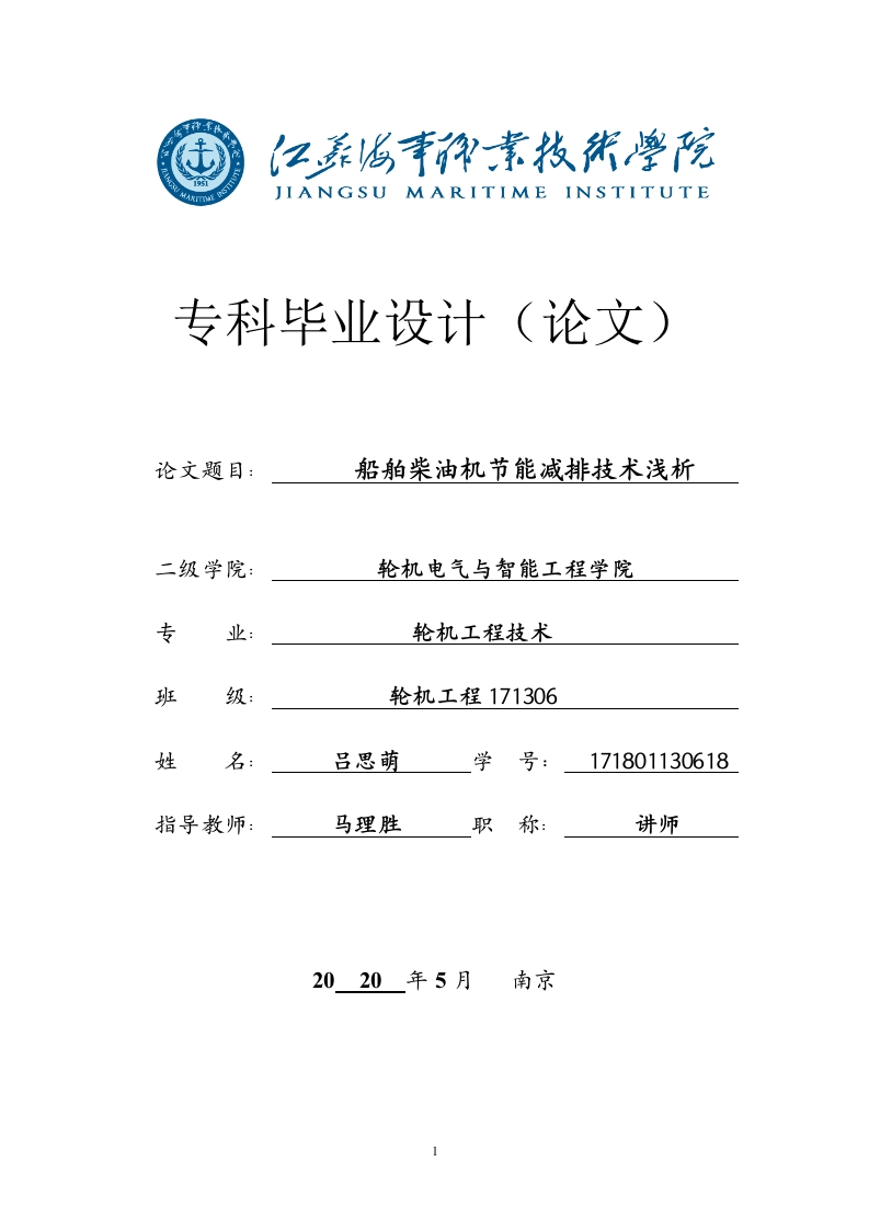 ⊕JIANGSU MARITIME INSTITUTE专科毕业设计(论文)论文题目:船舶柴油机节能减排技术浅析二级学院:轮机电气与智能工程学院专业:轮机工程技术班级:轮机工程171306姓名:吕思萌学号:171801130618指导教师:马理胜职称:讲师2020年5月南京原创性声明本人郑重声明:所呈交的论文,是本人在指导教师的指导下,独立进行研究工作所取得的成果。除文中已经注明引用的内容外,本论文不含任何其他个人或集体己经发表或撰写过的作品成果。对本文的研究做出重要贡献的个人和集体,均己在文中以明确方式标明。本人完全意识到本声明的法律结果由本人承担。作者签名:日期:年月日论文使用授权本人完全了解江苏海事职业技术学院有关保留、使用论文的规定,学院有权保留并向国家有关部门或机构送交论文的复印件和磁盘,允许论文被查阅和借阅。本人授权江苏海事职业技术学院可以将论文的全部或部分内容编入有关数据库进行检索,可以采用影印、缩印或扫描等复制手段保存、汇编论文。(保密的论文在解密后应遵守此规定)作者签名:指导教师签名:日期:年月2摘要随着经济全球化的快速发展,船舶作为运输工具在经济全球化中承担重要作用,船舶柴油机作为船舶的主要动力来源,它在航行中会产生大量废气污染物,将会对全球环境造成恶劣影响。目前,国际海事组织已制定了船舶废气污染物排放标准。本文首先对船舶柴油机废气污染物的成分、危害和生成机理进行了总结,并对重点污染物NO、SO的排放控制措施进行了分析。其次,对现有的节能减排技术进行了归纳,对相应技术的发展难点和应用效果进行了总结。最后,针对船舶在远洋和内河两种不同工作环境下的不同排放指标,结合现有的船舶废气污染物节能减排技术,给出了远洋和内河两种环境下船舶所采用的节能减排方案,为远洋和内河船舶在节能减排技术的发展、船员对于船舶节能减排设备的管理等方面提供了一定的参考。关键词船舶柴油机废气污染物节能减排技术3