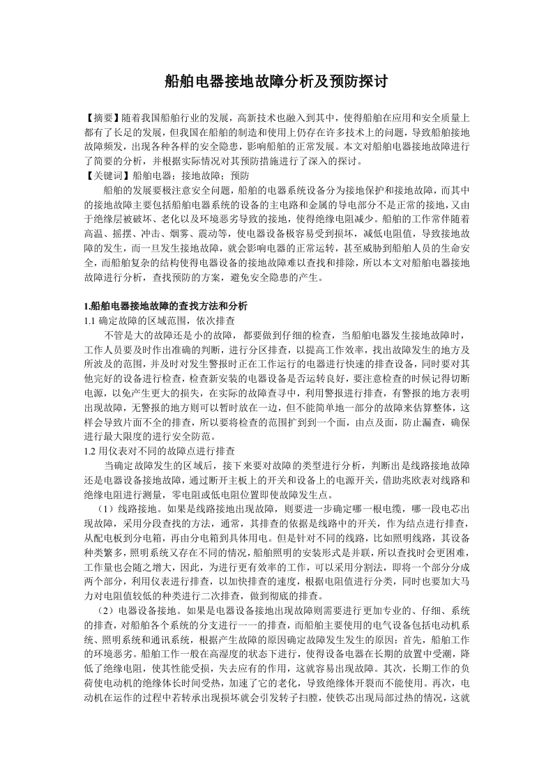 船舶电器接地故障分析及预防探讨【摘要】随着我国船舶行业的发展,高新技术也融入到其中,使得船舶在应用和安全质量上都有了长足的发展,但我国在船舶的制造和使用上仍存在许多技术上的问题,导致船舶接地故障频发,出现各种各样的安全隐患,影响船舶的正常发展。本文对船舶电器接地故障进行了简要的分析,并根据实际情况对其预防措施进行了深入的探讨。【关键词】船舶电器:接地故障:预防船舶的发展要极注意安全问题,船舶的电器系统设备分为接地保护和接地故障,而其中的接地故障主要包括船舶电器系统的设备的主电路和金属的导电部分不是正常的接地,又由于绝缘层被破坏、老化以及环境恶劣导致的接地,使得绝缘电阻减少。船舶的工作常伴随着高温、摇摆、冲击、烟雾、震动等,使电器设备极容易受到损坏,减低电阻值,导致接地故障的发生,而一且发生接地故障,就会影响电器的正常运转,甚至威肋胁到船舶人员的生命安全,而船舶复杂的结构使得电器设备的接地故障难以查找和排除,所以本文对船舶电器接地故障进行分析,查找预防的方案,避免安全隐患的产生。1船舶电器接地故障的查找方法和分析1.1确定故障的区域范围,依次排查不管是大的故障还是小的故障,都要做到仔细的检查,当船舶电器发生接地故障时,工作人员要及时作出准确的判断,进行分区排查,以提高工作效率,找出故障发生的地方及所波及的范围,并及时对发生警报时正在工作运行的电器进行快速的排查设备,同时要对其他完好的设备进行检查,检查新安装的电器设备是否运转良好,要注意检查的时候记得切断电源,以免产生更大的损失,在实际的故障查寻中,利用警报进行排查,有警报的地方表明出现故障,无警报的地方则可以暂时放在一边,但不能简单地一部分的故障来估算整体,这样会导致片面不全的排查,所以要将检查的范围扩到到一个面,由点及面,防止漏查,确保进行最大限度的进行安全防范。12用仪表对不同的故障点进行排查当确定故障发生的区域后,接下来要对故障的类型进行分析,判断出是线路接地故障还是电器设备接地故障,通过断开主板上的开关和设备上的电源开关,借助兆欧表对线路和绝缘电阻进行侧量,零电阻或低电阻位置即使故障发生点。(1)线路接地。如果是线路接地出现故障,则要进一步确定哪一根电缆,哪一段电芯出现故障,采用分段查找的方法,通常,其排查的依据是线路中的开关,作为结点进行排查,从配电板到分电箱,再由分电箱到具体用电。但是针对不同的线路,比如照明线路,其设备种类繁多,照明系统又存在不同的情况,船舶照明的安装形式是并联,所以查找时会更困难,工作量也会随之增大,因此,为进行更有效率的工作,可以采用分割法,即将一个部分分成两个部分,利用仪表进行排查,以加快排查的速度,根据电阻值进行分类,同时也要加大马力对电阻值较低的种类进行二次排查,做到彻底的排查。(2)电器设备接地。如果是电器设备接地出现故障则需要进行更加专业的、仔细、系统的排查,对船舶各个系统的分支进行一一的排查,而船舶主要使用的电气设备包括电动机系统、照明系统和通讯系统,根据产生故障的原因确定故障发生发生的原因:首先,船舶工作的环境恶劣。船舶工作一般在高湿度的状态下进行,使得设备电器在长期的放置中受潮,降低了绝缘电阻,使其性能受损,失去应有的作用,这就容易出现故障。其次,长期工作的负荷使电动机的绝缘体长时间受热,加速了它的老化,导致绝缘体开裂而不能使用。再次,电动机在运作的过程中若转承出现损坏就会引发转子扫膛,使铁芯出现局部过热的情况,这就会破坏绝缘体。最后,由于电动机的接线端接触外壳,所以电动机会保留洞孔,使电动机的进线孔不够密封而导致进水,破坏线路的正常运作。要解决这些问题就要及时拆开接线,用仪表测试,找出故障发生点。2.电器接地故障的预防探析2.1提高对船舶接地故障的认识当前的船舶电网采用的是三相三线制,这就使它们之间的联系更加的紧密,如果不及时处理接地故障,那么电器设备在线路的另一端就无法正常的工作,并且会影响到第二线路的运作,是整个线路陷入瘫痪,影响线路运行的安全性和可靠性,甚至会给之后的监测工作带来极大的不可预知性。所以船舶的电器设备管理人员和电工管理人员要在思想上给予足够的认识和关注。但是目前,很多船舶上没有专门的电器维修人员,而且大部分人更加关注轮机,不太重视电网,使电器管理比较薄弱,所以必须全面提高对电器设备接地故障的认识,不能只注重部分而忽视整体2.2加强船舶电器管理船舶电器管理与电器接地故障的发生有着密不可分的关系,船舶的工作复杂多变,电器管理工作的质量越高,电器接地故障发生的概率就会越小,两者呈反方向的趋势发展。要遵守电器设备管理的相关规定,及时做好电器设备的绝缘电阻的测侧试工作,绝缘电阻时是保证船舶电器设备安全接地的重要手段,具有关键性的作用,但由于船舶工作的环境非常潮湿,电器设备和线路容易受潮,使绝缘电阻很容易发生变化,情况复杂,很难进行有效地控制,减低绝缘电阻,导致电器接地故障的发生,所以要定期对绝缘电阻进行测试,并且利用对比数据的分析,进行电器设备的故障查找和修理计划的制定,有效的避免接地故障的发生。同时当绝缘