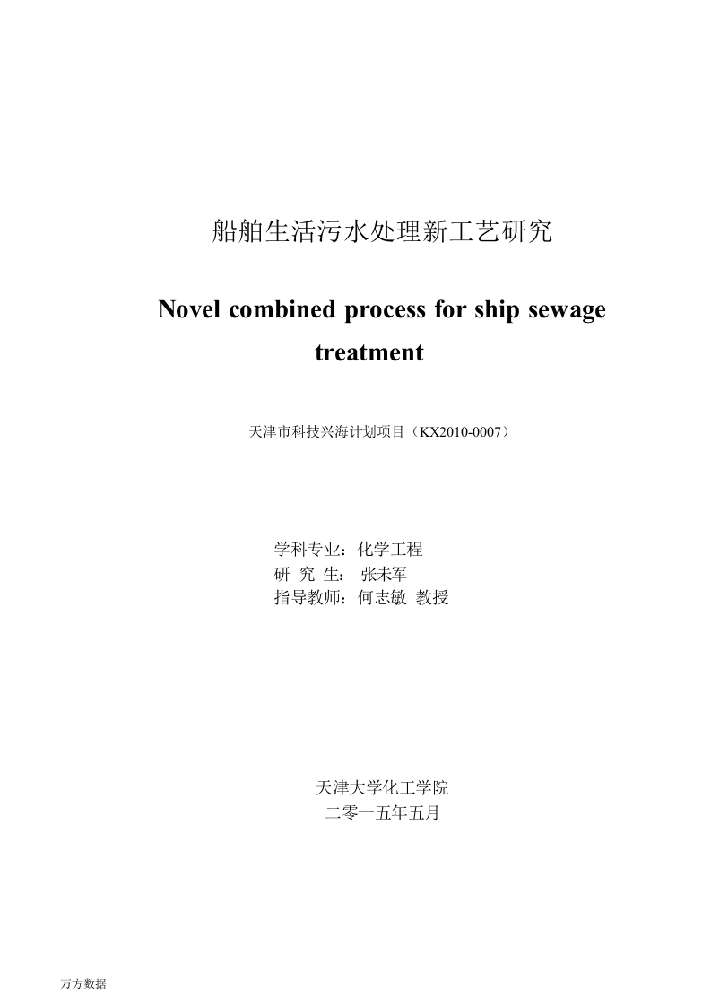 船舶生活污水处理新工艺研究Novel combined process for ship sewagetreatment天津市科技兴海计划项目(KX2010-0007)学科专业:化学工程研究生:张未军指导教师:何志敏教授天津大学化工学院二零一五年五月万方数据独创性声明本人声明所呈交的学位论文是本人在导师指导下进行的研究工作和取得的研究成果,除了文中特别加以标注和致谢之处外,论文中不包含其他人已经发表或撰写过的研究成果,也不包含为获得天津大学或其他教育机构的学位或证书而使用过的材料。与我一同工作的同志对本研究所做的任何贡献均已在论文中作了明确的说明并表示了谢意。学位论文作者签名:签字日期:年月日学位论文版权使用授权书本学位论文作者完全了解天津大学有关保留、使用学位论文的规定。特授权天津大学可以将学位论文的全部或部分内容编入有关数据库进行检索,并采用影印、缩印或扫描等复制手段保存、汇编以供查阅和借阅。同意学校向国家有关部门或机构送交论文的复印件和磁盘。(保密的学位论文在解密后适用本授权说明)学位论文作者签名:导师签名:签字日期:年月签字日期:年月日万方数据摘要针对MO不断提高的船舶生活污水排放标准,结合船舶生活污水自身的水质和水量特点以及船舶舱室温度,地理和空间位置等影响,采用三种新工艺组合处理船舶生活污水,通过处理效率及能耗的对比,优选出耐冲击负荷,管理操作要求低,占地面积小且能快速高效处理的新型工艺与装置。首先探索了三维电解芬顿法对船舶生活污水的处理效率,采用负载FMn-1:1的活性炭(FeMn-C)作为粒子电极,投加量为150g,电流密度为20mA/cm,曝气速率为5Lmi,通过添加0.03MHzO2强化三维电解过程中的芬顿反应,在溶液pH为酸性时,电解90min对COD去除率最高可达78%。其次对两种典型的高级氧化技术(电芬顿和催化臭氧化工艺)进行研究,分别确定了在污水处理过程中各自的最佳操作参数:()对于电芬顿过程,采用钌铱锡阳极,石墨阴极,电极之间通过并联连接,芬顿试剂比Fe2+Hz02-1:4且Fe2+0.01M,曝气速率为4Lmin,电流密度为20mAcm2,极板间距为2cm,盐浓度6g/L,反应30min后COD降解速率减慢,考虑后续催化臭氧化的组合,选择电芬顿反应时间为45min;b)催化臭氧化过程中,采用Ti-MC金属陶瓷催化剂,Ti02与基体材料比为527,臭氧加入量为6gL,氧气速率为2Lmi,催化剂加入量为200g,蠕动泵转速为130rmp。在此基础上,将电芬顿与催化臭氧化过程组合,通过优化时间组合使两种工艺协同作用最强,最终,在处理时间为90min(电芬顿和催化臭氧化各处理45min)时,电芬顿和催化臭氧化组合对COD去除率可达82.8%。随后考察了电芬顿-臭氧一体化工艺对船舶生活污水的处理效果,实验结果表明:电流密度上20mA/cm2,芬顿试剂比例H2O2:Fe2+=3:1,Fe2+浓度为0.01M,供氧速率2Lmin,臭氧投加量6g/L时,电芬顿臭氧一体化水处理技术能有效降解生活污水,对于初始COD为1320mg/L的模拟船舶生活污水,处理120min,C0D去除率高达86.4%。对上述三种新型处理工艺的COD去除率,处理过程中的电流效率以及能耗进行对比,实验结果表明:电芬顿催化臭氧化组合过程显示出较高的COD去除率,并且在处理过程中,电流效率较高,能耗最低。关键词:船舶生活污水:三维电解:电芬顿:臭氧:催化臭氧化:COD万方数据
