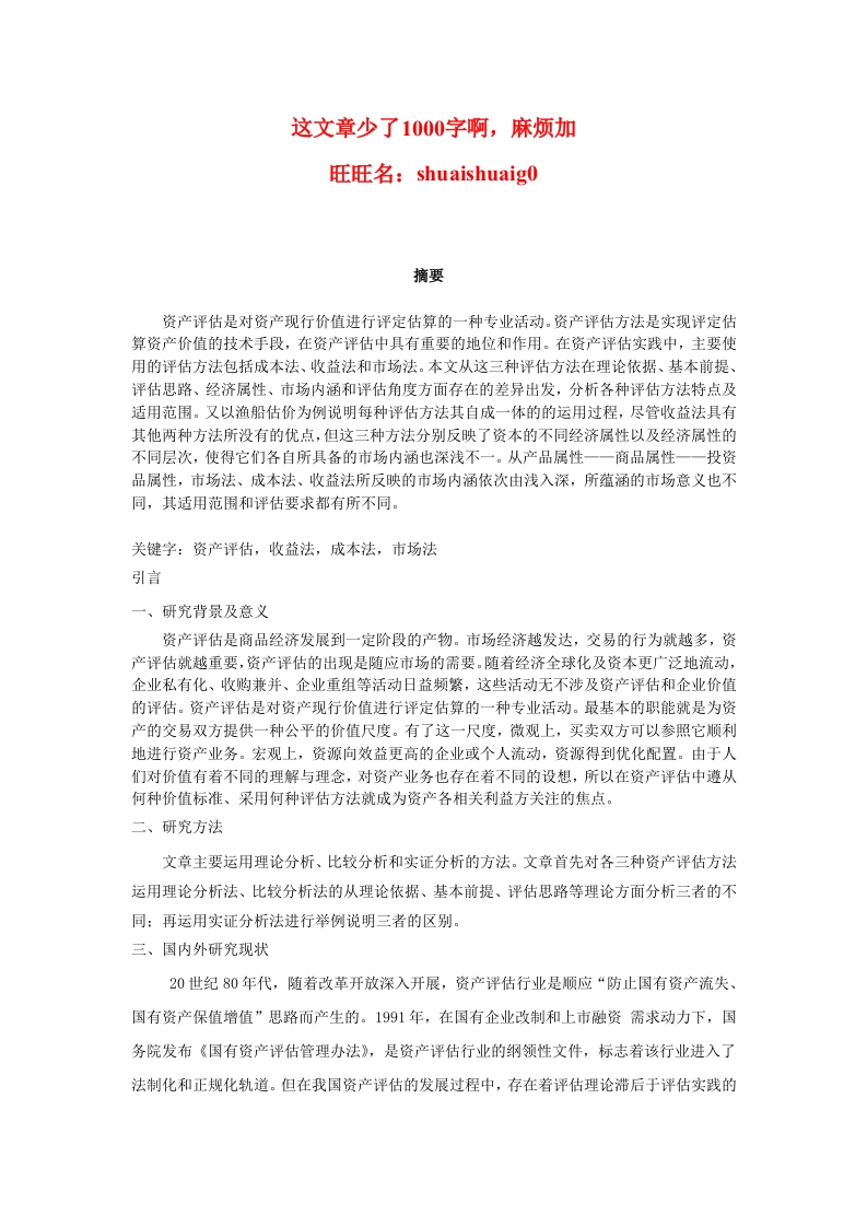 这文章少了1000字啊,麻烦加摘要资产评估是对资产现行价值进行评定估算的一种专业活动。资产评估方法是实现评定估算资产价值的技术手段,在资产评估中具有重要的地位和作用。在资产评估实践中,主要使用的评估方法包括成本法、收益法和市场法。本文从这三种评估方法在理论依据、基本前提、评估思路、经济属性、市场内涵和评估角度方面存在的差异出发,分析各种评估方法特点及适用范围。又以渔船估价为例说明每种评估方法其自成一体的的运用过程,尽管收益法具有其他两种方法所没有的优点,但这三种方法分别反映了资本的不同经济属性以及经济属性的不同层次,使得它们各自所具备的市场内涵也深浅不一。从产品属性一一商品属性一一投资品属性,市场法、成本法、收益法所反映的市场内涵依次由浅入深,所蕴涵的市场意义也不同,其适用范围和评估要求都有所不同关键字:资产评估,收益法,成本法,市场法引言一、研究背景及意义资产评估是商品经济发展到一定阶段的产物。市场经济越发达,交易的行为就越多,资产评估就越重要,资产评估的出现是随应市场的需要。随着经济全球化及资本更广泛地流动,企业私有化、收购兼并、企业重组等活动日益频繁,这些活动无不涉及资产评估和企业价值的评估。资产评估是对资产现行价值进行评定估算的一种专业活动。最基本的职能就是为资产的交易双方提供一种公平的价值尺度。有了这一尺度,微观上,买卖双方可以参照它顺利地进行资产业务。宏观上,资源向效益更高的企业或个人流动,资源得到优化配置。由于人们对价值有着不同的理解与理念,对资产业务也存在着不同的设想,所以在资产评估中遵从何种价值标准、采用何种评估方法就成为资产各相关利益方关注的焦点。二、研究方法文章主要运用理论分析、比较分析和实证分析的方法。文章首先对各三种资产评估方法运用理论分析法、比较分析法的从理论依据、基本前提、评估思路等理论方面分析三者的不同:再运用实证分析法进行举例说明三者的区别。三、国内外研究现状20世纪80年代,随着改革开放深入开展,资产评估行业是顶应“防止国有资产流失、国有资产保值增值”思路而产生的。1991年,在国有企业改制和上市融资需求动力下,国务院发布《国有资产评估管理办法》,是资产评估行业的纲领性文件,标志着该行业进入了法制化和正规化轨道。但在我国资产评估的发展过程中,存在着评估理论滞后于评估实践的情况。目前我国经常使用资产评估方法有成本法、收益法、市场法。19世纪中后期,随着欧美等国经济的发展现代评估业逐渐形成,尤其是不动产评估得到充分重视和发展。由于评估实践的发展急需理论指导,因而与评估相关的理论体系逐步从传统经济理论中分化独立出来。第一个探讨评估方法的现代经济学家是马歇尔,他把评估理论与价值理论分开,从而形成了现代评估理论的基础。而莫迪利安尼和米勒的价值评估理论和艾尔文·费雪的资本价值理论奠定了现代资产评估理论的基础。目前国外使用较多的是成本法、收益法、市场法和期权法。目录一、资产评估二、资产评估方法(一)资产评估的三种方法(二)资产评估估的三种方法的差异三、收益法与其他评估方法的进行比较的优势(一)成本法难以体现资产价值。(二)市场法适用条件较为严格,适用性较差。(三)收益法既符合资产价值内涵要求又具有适用条件。四、案例分析一一以渔船估价为例(一)成本法在渔船估价中的应用。(二)市场法在渔船估价中的应用。(三)收益法在渔船估价中的应用。五、结论