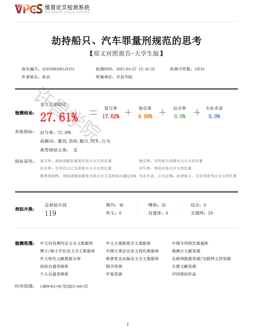 维普论文检测系统VIP PAPER CHECK SYSTEM劫持船只、汽车罪量刑规范的思考【原文对照报告-大学生版】报告编号:424f9593901d7f41检测时间:2021-04-2712:44:32检测字符数:10754作者姓名:佚名所属单位:许昌学院全文总相似比复写率他引率自引率专业术语检测结论:27.61%17.62%9.99%0.0%0.0%其他指标:自写率:72.39%高频词:量刑,劫持,船只,汽车,行为典型相似文章:无指标说明:复写率:相似或疑似重复内容占全文的比重他引率:引用他人的部分占全文的比重自引率:引用自己已发表部分占全文的比重自写率:原创内容占全文的比重典型相似性:相似或疑似重复内容占全文总相似比超过30%专业术语:公式定理、法律条文、行业用语等占全文的比重总相似片段期刊:46博硕:35综合:9相似片段:119外文:0自建库:0互联网:29检测范围:中文科技期刊论文全文数据库中文主要报纸全文数据库中国专利特色数据库博士/硕士学位论文全文数据库中国主要会议论文特色数据库港澳台文献资源外文特色文献数据全库维普优先出版论文全文数据库互联网数据资源/互联网文档资源高校自建资源库图书资源古籍文献资源个人自建资源库年鉴资源IPUB原创作品时间范围:1989-01-01至2021-04-27维普论文检测系统VIP PAPER CHECK SYSTEM原文对照颜色标注说明:■自写片段■复写片段(相似或疑似重复)引用片段(引用)■专业术语(公式定理、法律条文、行业用语等)许昌学院XUCHANG UNIVERSITY本科生毕业论文劫持船只、汽车罪量刑规范的思考学院法学院专业法学班级17级法学2班学号4201170019学生姓名田静怡联系方式17839120102指导教师冯振强职称:副教授2021年5月独创性声明本人郑重声明:所呈交的毕业论文(设计)是本人在指导老师指导下取得的研究成果。除了文中特别加以注释和致谢的地方外,论文(设计)中不包含其他人已经发表的研究成果。与本研究成果相关的所有人所做出的任何贡献均已在论文(设计)中作了明确的说明并表示了谢意。签名:年月日授权声明本人完全了解许昌学院有关保留、使用本科生毕业论文(设计)的规定,即:有权保留并向国家有关部门或机构送交毕业论文(设计)的复印件和磁盘,允许毕业论文(设计)被查阅和借阅。本人授权许昌学院可以将毕业论文(设计)的全部或部分内容编入有关数据库进行检索,可以采用影印、缩印或扫描等复制手段保存、汇编论文(设计)。本人论文(设计)中有原创性数据需要保密的部分为:2VPCS维普论文检测系统VIP PAPER CHECK SYSTEM学生签名:年月日指导教师签名:年月日劫持船只、汽车罪量刑规范的思考摘要劫持船只、汽车罪,是指以暴力、胁迫或者其他方法劫持船只、汽车,危害公共安全的行为。本罪有特定的构成要件并且其量刑在刑法上也有明确的规定。在刑法中,关于犯罪的一般量刑应考虑量刑的目的、原则、方法和情节等问题。在分析了洪建国案以后发现了本罪在量刑上存在关于“造成严重后果”的量刑标准不明确以及刑罚上没有配备死刑,造成罪刑不相称的问题。需要以量刑规范理论为基础,完善劫持船只、汽车罪加重情节的设置以及在刑罚上配备死刑。关键词:劫持船只、汽车罪;量刑规范化:结果加重情节:死刑Reflection on the Sandard of Sentencing for the Crime of Hijacking Ships and CarsABSTRACTThe crime of hijacking a ship or a motor vehicle refers to the act of hijacking a ship or amotor vehicle by violence,coercion or other means to endanger public security.This crime hasspecific constitutive elements and its sentencing has clear provisions in the criminal law.Incriminal law,the purpose,principle,method and circumstance of sentencing should be considered inthe general sentencing of crimes.After analyzing the case of Hong Jianguo,it is found that thesentencing standard of this crime is not clear about "causing serious consequences"and the penaltyis not equipped with the death penalty,resulting in the problem of disproportionate crime andpunishment.It is necessary to perfect the setting of aggravating circumstances of the crime ofhijacking ships and cars and equip the death penalty on the basis of the theory of sentencing norms.Key words:Hijacking vehicle and ship:Crime sentencing standardization:Aggregatedconsequential aggravation;Death penalty目录一、劫持船只、汽车罪的概述1(一)劫持船只、汽车罪的基本概念1(二)劫持船只、汽车罪的构成要件2(三)劫持船只、汽车罪的量刑标准3二、刑法中关于犯罪的一般量刑应当考虑的问题3(一)量刑的目的3(二)量刑的原则4(三)量刑的方法5(四)量刑的情节6三、劫持船只、汽车罪中存在的量刑问题一一以洪建国案为例6(一)洪建国案简介6(二)洪建国案的量刑存在的问题6四、一般量刑规范化之我见8五、劫持船只、汽车罪的量刑规范建议8(一)完善劫持船只、汽车罪加重情节的设置8(二)在劫持船只、汽车罪的刑罚上配备死刑9参考文献11致谢12劫持船只、汽车罪量刑规范的思考劫持船只、汽车罪自1997年正式纳入刑法之后到2021年一共历时24年、11次刑法修正案,但对其法律上的规定3