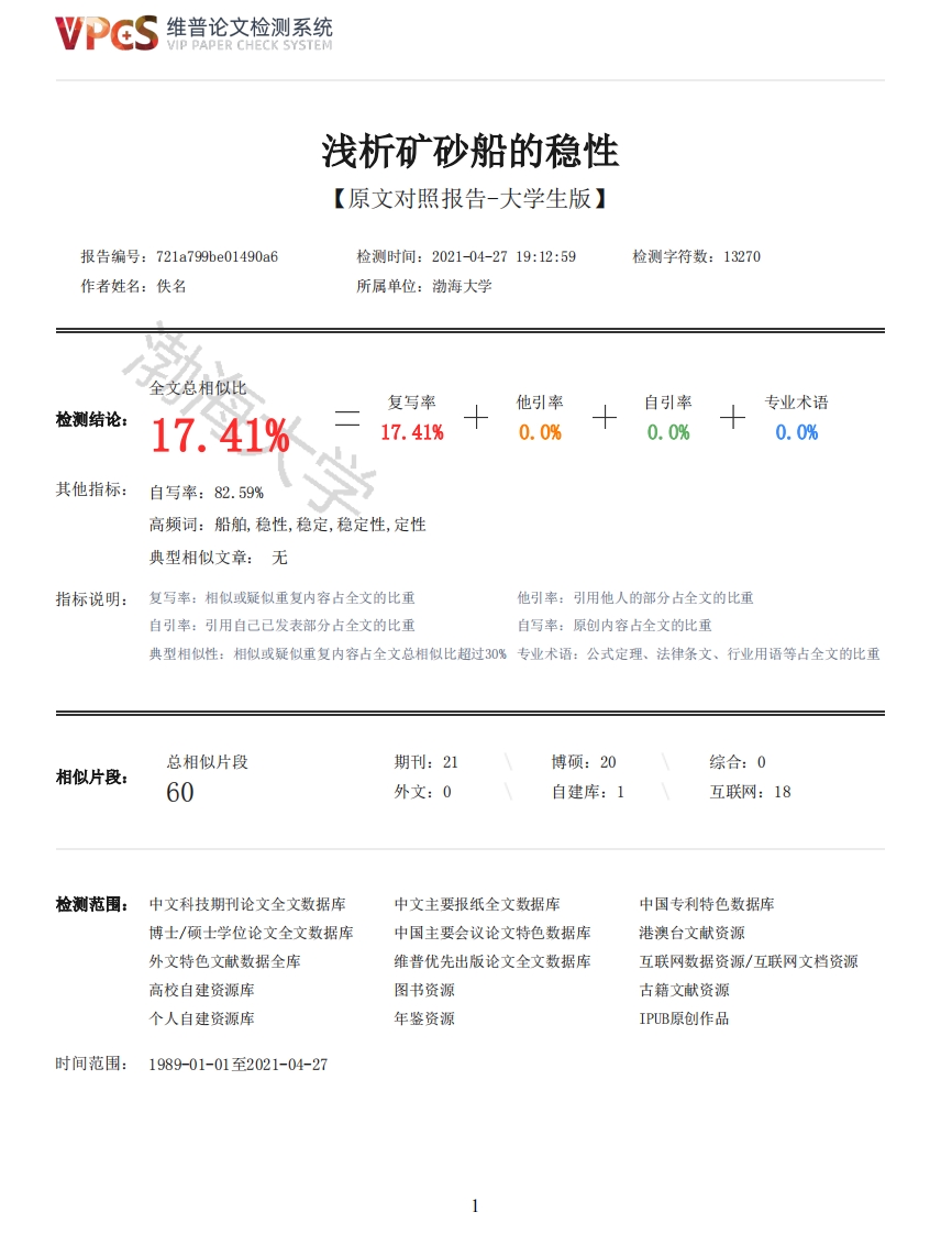 维普论文检测系统VIP PAPER CHECK SYSTEM浅析矿砂船的稳性【原文对照报告-大学生版】报告编号:721a799be01490a6检测时间:2021-04-2719:12:59检测字符数:13270作者姓名:佚名所属单位:渤海大学全文总相似比复写率他引率自引率专业术语检测结论:17.41%17.41%0.0%0.0%0.0%其他指标:自写率:82.59%高频词:船舶,稳性,稳定,稳定性,定性典型相似文章:无指标说明:复写率:相似或疑似重复内容占全文的比重他引率:引用他人的部分占全文的比重自引率:引用自己已发表部分占全文的比重自写率:原创内容占全文的比重典型相似性:相似或疑似重复内容占全文总相似比超过30%专业术语:公式定理、法律条文、行业用语等占全文的比重总相似片段期刊:21博硕:20综合:0相似片段:60外文:0自建库:1互联网:18检测范围:中文科技期刊论文全文数据库中文主要报纸全文数据库中国专利特色数据库博士/硕士学位论文全文数据库中国主要会议论文特色数据库港澳台文献资源外文特色文献数据全库维普优先出版论文全文数据库互联网数据资源/互联网文档资源高校自建资源库图书资源古籍文献资源个人自建资源库年鉴资源IPUB原创作品时间范围:1989-01-01至2021-04-27维普论文检测系统VIP PAPER CHECK SYSTEM原文对照颜色标注说明:■自写片段■复写片段(相似或疑似重复)引用片段(引用)■专业术语(公式定理、法律条文、行业用语等)渤海大学本科毕业论文(设计)浅析矿砂船的稳性Analysis of the stability of ore carrier学院:航运学院专业:航海技术学号:17201043学生姓名:张福龙入学年度:2017年指导教师:王海涛完成日期:2021年4月26日渤海大学Bohai University摘要随着其基础产业的增长,经济全球化的发展也越来越全面,与此同时大型船舶的制造,2016年进口了超过10亿吨铁矿石。因此,VLV的自主研发对于中国船舶工业实现“国家船舶、国家制造”,能源工业实现“国家能源、国家解决方案”具有重要意义应用也更加广泛,所以对大于型船舶的研究也更加深入船的稳定性(动稳性力臂)是量取船舶完全稳性的不可估量的价值,船舶具有足够的稳定性是为了防止船舶损坏先决条件倾覆。应确保船舶得到船级社的认可稳定数据已经在船上,应该是完整的。在接管之前,新的船长和领航员必须上船熟悉船舶稳性数据,过改了货物位置、自由液面等计算因素,得到了不正确装载条件下装满离港船舶稳定面积体积等数据,并且和一般装载条件下的参数进行了对比。纵向不均匀加载容器稳定区域的影响主要反映在稳定区域的损失造成的减少进口角,了解船舶稳性性能和稳定性最差的装载和压载:了解影响稳定性的操作限制。然而,船舶稳性计算船舶稳性资料的准确性取决于托运人向船舶提供的货物信息的准确性性、及时性、船舶修理和改装等因素。关键词:Analysis of the stability of ore carrierAbstractWith the growth of its basic industries,the development of economic globalization is becomingmore comprehensive.At the same time,the manufacturing of large ships imported more than 1 billiontons of iron ore in 2016.VLV independent research and development,therefore,for China'sshipbuilding industry to realize "nations shipbuilding,manufacturing,energy industry to realizethe"national energy,national solution "is of great significance and more widely used,so theresearch on is greater than the type of ship and more deeply the stability of the ship (dynamic2维普论文检测系统VIP PAPER CHECK SYSTEMstability arm)is a measuring ship stability of immeasurable value completely,The ship hassufficient stability in order to prevent ship damage preconditions capsizing.Ensure that the ship isrecognized by the classification society and that the stable data are already on board and should becomplete.Before taking over,the new captain and navigator must be familiar with the ship's stabilitydata on board,modify the calculation factors such as the cargo position and free liquid level,andobtain the data of the stable area and volume of the vessel loaded out of port under incorrectloading conditions,and make comparison with the parameters under normal loading conditions.Theinfluence of longitudinal non-uniform loading vessel stability area is mainly reflected in the lossof stability area caused by the reduction of inlet Angle,to understand the ship stabilityperformance and the least stable loading and ballast;Understand operational limitations that affect stability.However,the accuracy of ship stabilitydata depends on the accuracy,timeliness,repair and modification of the cargo information providedto the ship by the shipper.Key Words:stability;energy:The ship目录1前言11.1课题来源11.2矿砂船稳性的研究背景11.3矿砂船稳性对船舶影响的目的和意义21.3.1研究矿砂船稳性对船舶影响的目的21.3.2研究矿砂船稳性对船舶影响意义21.4矿砂船装载问题31.4.1如何装满货舱31.4.2装货时稳性42研究船舶稳性分类及规则影响52.1矿砂船的深水水动力性能的计算方法52.2矿砂船的深水水动力性能数值处理53船舶稳性的因素及其计算船舶的动稳性63.1船确保船上有完整的稳性资料63.2船舶初始稳性高度计算及应用74结论9参考文献9致谢10Abstract1 introduction1.1 Topic Source 11.2 Research background of ore carrier stability 11.3 Purpose and significance of the influence of ore carrier stability on ship 21.3.1 Purpose of studying the influence of ore carrier stability on vessel 21.3.2 Significance of studying the influence of ore vessel stability on vessel 21.4 Ore carrier loading problem 31.4.1 How to fill cargohold.......................................................................................