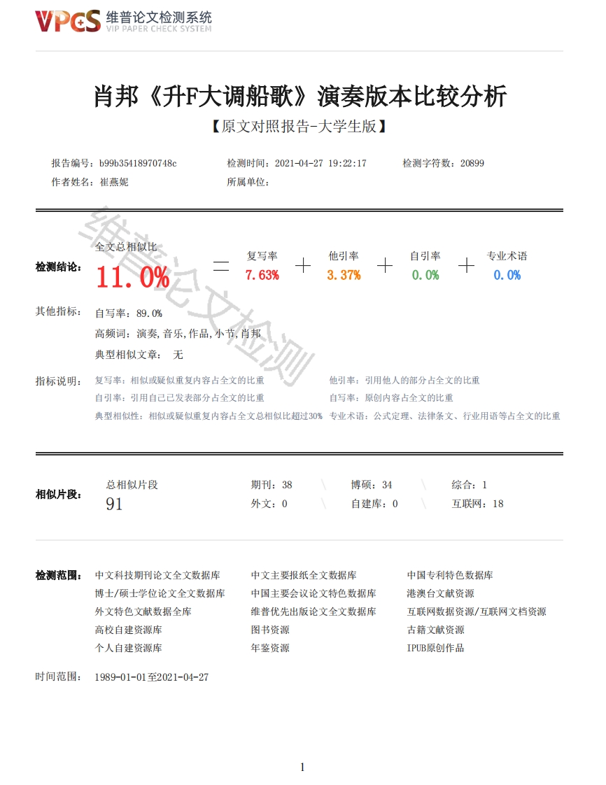 维普论文检测系统/IP PAPER CHECK SYSTEM肖邦《升F大调船歌》演奏版本比较分析【原文对照报告-大学生版】报告编号:b99b35418970748c检测时间:2021-04-2719:22:17检测字符数:20899作者姓名:崔燕妮所属单位:全文总相似比复写率他引率自引率专业术语检测结论:11.0%7.63%3.37%0.0%0.0%其他指标:自写率:89.0%高频词:演奏,音乐,作品,小节,肖邦典型相似文章:无指标说明:复写率:相似或疑似重复内容占全文的比重他引率:引用他人的部分占全文的比重自引率:引用自己已发表部分占全文的比重自写率:原创内容占全文的比重典型相似性:相似或疑似重复内容占全文总相似比超过30%专业术语:公式定理、法律条文、行业用语等占全文的比重总相似片段期刊:38博硕:34综合:1相似片段:91外文:0自建库:0互联网:18检测范围:中文科技期刊论文全文数据库中文主要报纸全文数据库中国专利特色数据库博士/硕士学位论文全文数据库中国主要会议论文特色数据库港澳台文献资源外文特色文献数据全库维普优先出版论文全文数据库互联网数据资源/互联网文档资源高校自建资源库图书资源古籍文献资源个人自建资源库年鉴资源IPUB原创作品时间范围:1989-01-01至2021-04-27维普论文检测系统VIP PAPER CHECK SYSTEM原文对照颜色标注说明:■自写片段■复写片段(相似或疑似重复)引用片段(引用)■专业术语(公式定理、法律条文、行业用语等)论文题目:肖邦《升F大调船歌》演奏版本比较分析Title:A Comparative Study of Performing Versions of Chopin Barcarolle in F-Sharp Major姓名:崔燕妮学号:10173550101班级:2017级音乐表演班指导教师:张玎苑副教授2021年4月30日摘要弗雷德里克·肖邦(Frederic Chopin,1810-1849)是19世纪波兰杰出的作曲家,钢琴家,同时也是欧洲浪漫主义音乐的杰出代表人物之一。肖邦的钢琴作品几乎占据了他的整个创作生涯,是钢琴艺术史上独一无二的音乐大师。创作体裁包括练习曲、前奏曲、圆舞曲等,还有表现民族性格的玛祖卡和波罗乃兹舞曲。肖邦在钢琴音乐中的建树与贡献,使他成为浪漫主义音乐创作的主要研究对象之一。《升F大调船歌》创作于1845-1846年间,是肖邦晚期的代表作之一。这部作品凝结了肖邦炉火纯青的创作技巧,对往昔的追忆之情与史诗般壮丽的激情皆有表现,是浪漫主义钢琴音乐中不可多得的佳作之一,同时受到许多演奏家们的青睐。全文共分五个章节,第一章为绪论,第二章主要阐述肖邦的生平及其创作背景。第三章从曲式、和声与技术要点三个方面展开分析作品文本。第四章是本文的核心内容,笔者选择了四位钢琴演奏家的演奏版本,从力度与速度两个方面展开比较分析。第五章是总结部分,结合第四章的内容,总结出演奏版本比较的启示,即音乐表演作为二度创作的形式之一,正确传达作品文本的同时,将演奏者的个性诠释以音响效果呈现出来。通过版本比较分析,为演奏者们提供更丰富的二度创作的灵感,多方面理解作品内涵,提高音乐鉴赏能力。关键词:肖邦:升F大调船歌:演奏版本:二度创作AbstractFrederic Chopin (1810-1849)is an outstanding Polish composer and pianist in the 19th century,and also one of the outstanding representatives of European romantic music.Chopin's piano worksoccupy almost his entire creation career,and he is the unique music master in the history of pianoart.The music form include etude,prelude,waltz,etc.,and Mazurek and Polonaise which shownational character.Chopin's contribution to piano music makes him one of the main research objectsin romantic music creation."Barcarolle in F-Sharp Major was written in 1845-1846,and it was one of the representativeworks of Chopin in the late period.This work has condensed Chopin's perfect composing skills,andexpressed his memories and epic passion.It is one of the excellent work in romantic piano music,and is favored by many performers.2维普论文检测系统VIP PAPER CHECK SYSTEMThe first chapter is the introduction,the second chapter mainly elaborates Chopin's life andhis background.The third chapter analyzes the work from three aspects:the form,harmony andtechnical points.The fourth chapter is the core of this paper.The author chooses the version offour pianists,and compares the two aspects of strength and speed.The fifth chapter is the summarypart,combined with the fourth chapter written above,summarizes the Enlightenment of the comparisonof performance versions,that is,music performance as one of the forms of second creation,correctly convey the text of the work,and at the same time,the performance of the personalityinterpretation will be presented with sound effect.Through the version comparison and analysis,itprovides more abundant inspiration for the performers to create the second time,and understands theconnotation of the work in many aspects and improves the ability of music appreciation.Keywords:[Chopin][Barcarolle in F-Sharp Major][Performing Versions][Second Creation]目录目录摘要IIAbstractIII一、绪论7(一)选题背景及意义7(二)主要研究目标和内容8(三)研究方法和步骤8二、《升F大调船歌》之创作背景1(一)肖邦音乐创作的社会背景10(二)肖邦生平简介10文检测(三)《升F大调船歌》的创作背景11三、《升F大调船歌》之曲式、和声及技术解析12(一)《船歌》曲式分析12(二)《船歌》和声分析131.属和弦的扩充与拓展132.增加紧张色彩的减和弦143.忧郁的增和弦15(三)《船歌》技术解析161.复调性旋律的演奏处理162.连续八度的演奏技巧163.低声部伴奏织体的运用17四、《升F大调船歌》演奏版本比较分析18(一)演奏家简介及演奏版本信息19(二)不同